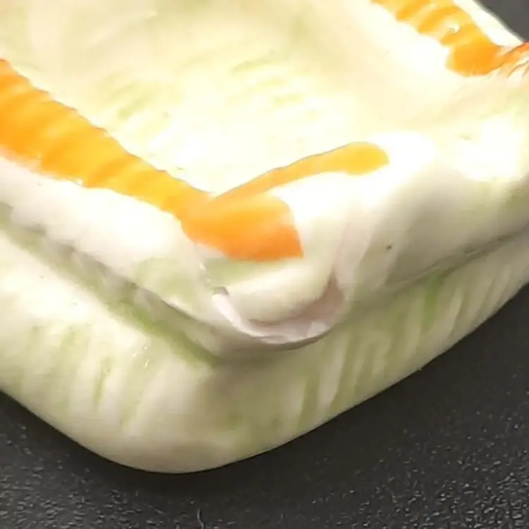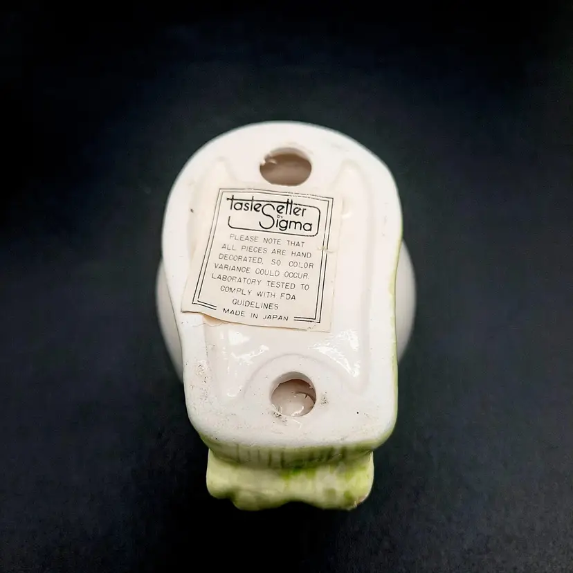 These fun little egg cups are in overall good condition with some crazing, a few paint chips and a chip on toe of short one that looks like it was repaired