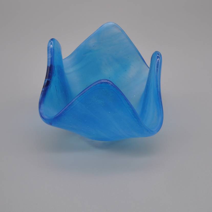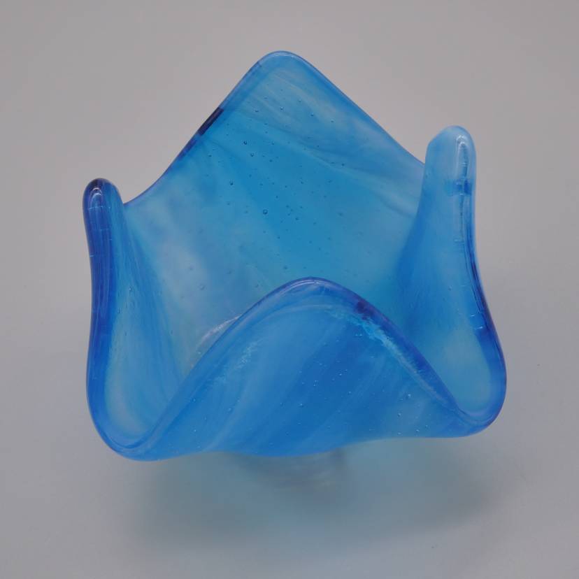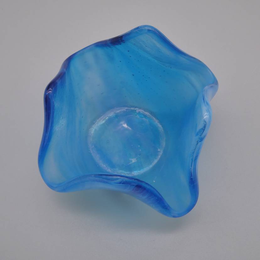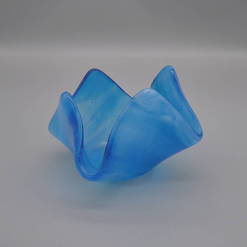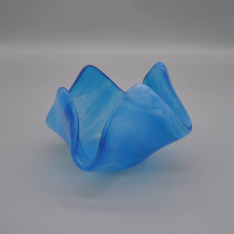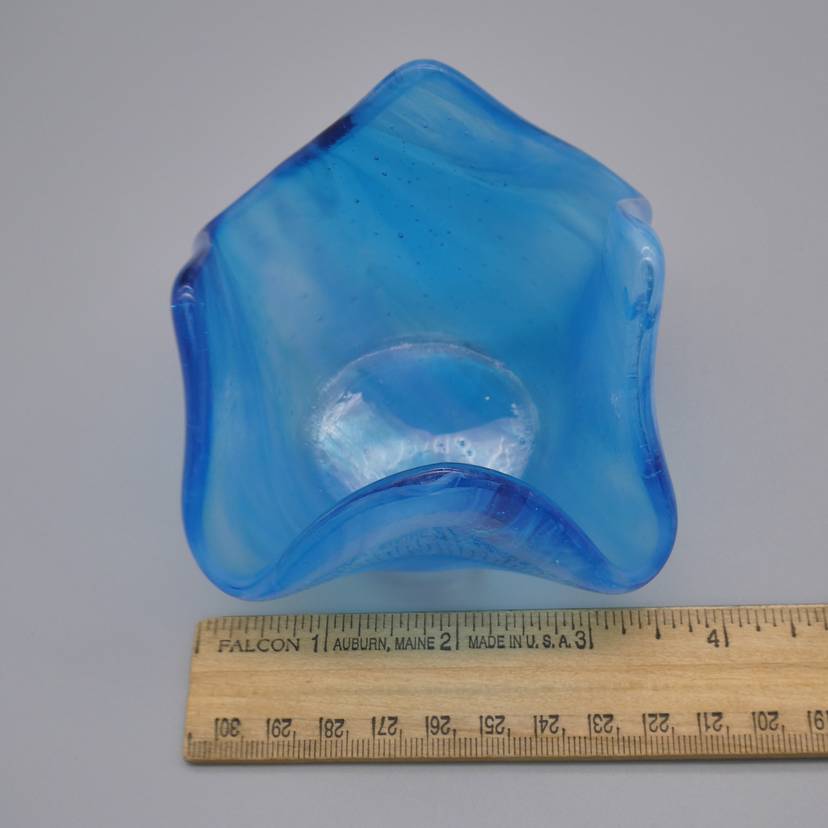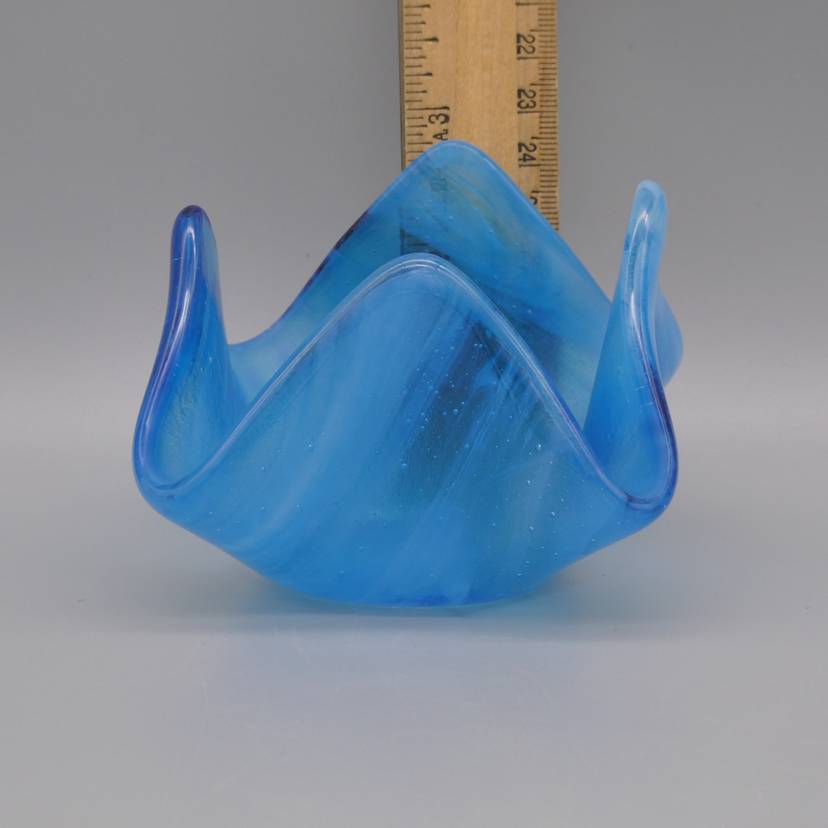 Featuring an electric blue handkerchief-shaped glass dish Hand-formed translucent slag glass with milky swirls Perfect for tealight candles, small votives or as a trinket dish Measures overall about 4-1/2" across x 2-3/4" tall at its tallest point with a 1-3/4" base Weighs about 8.5 ounces before being packaged to ship