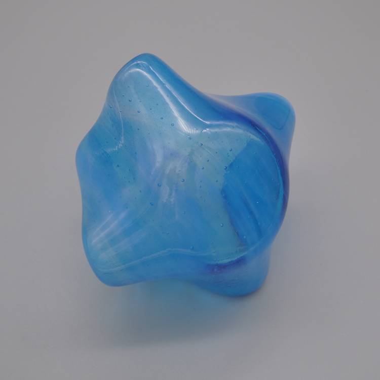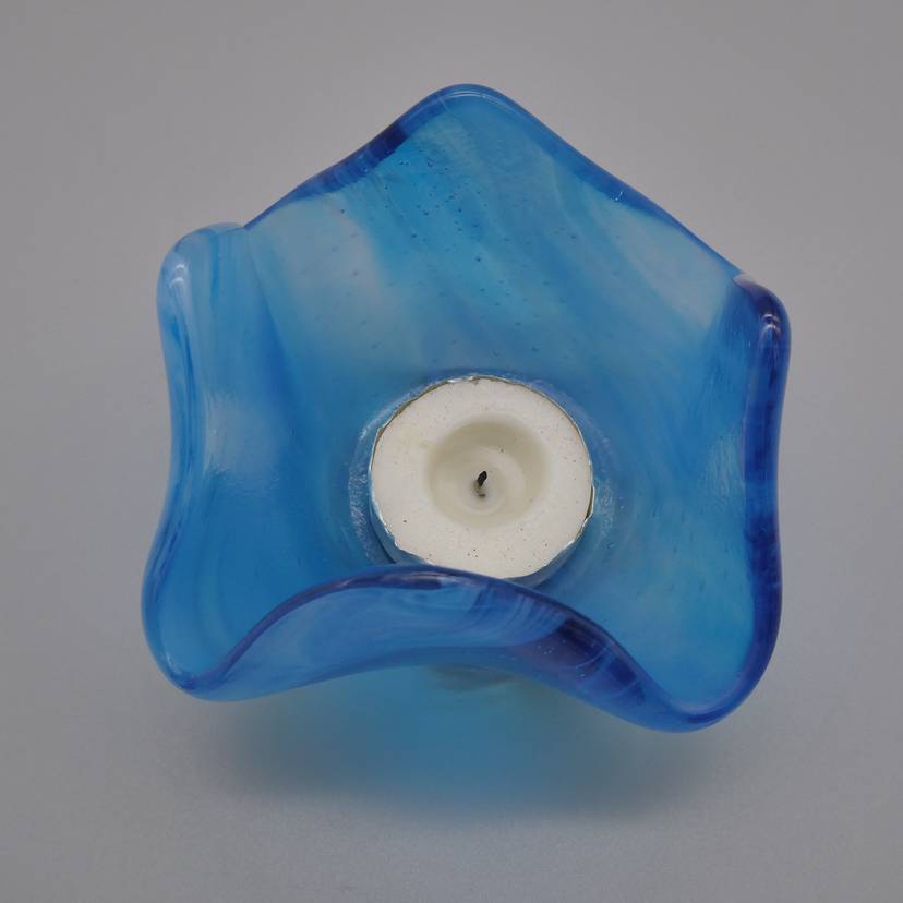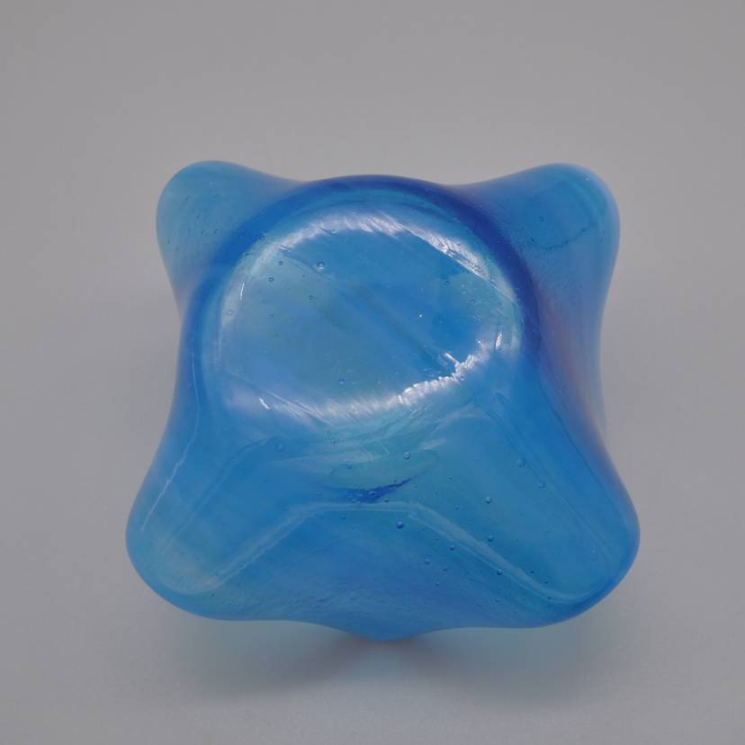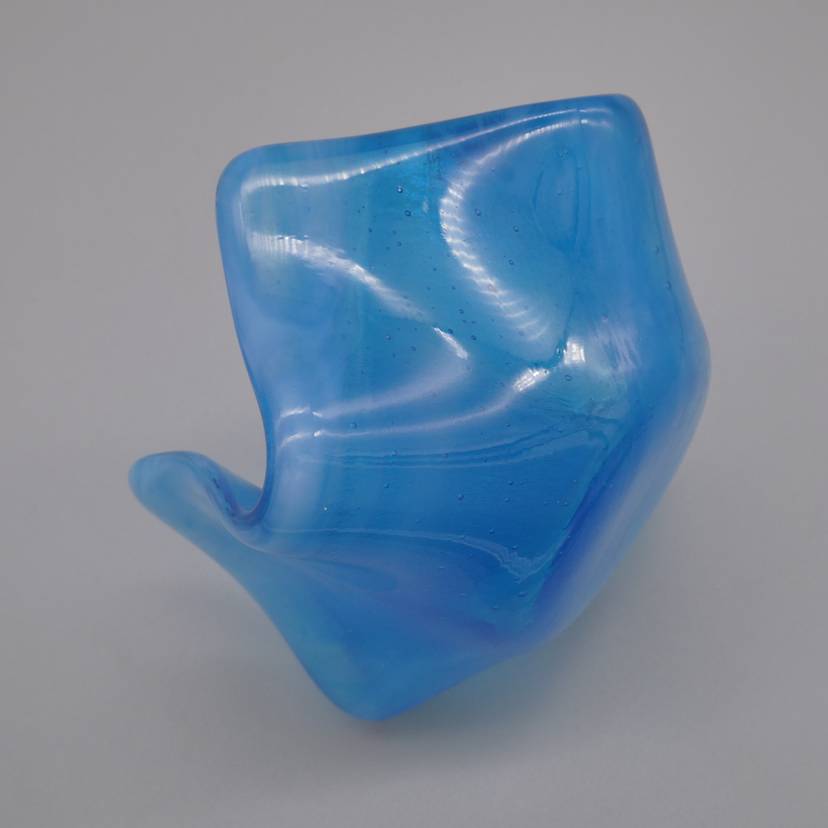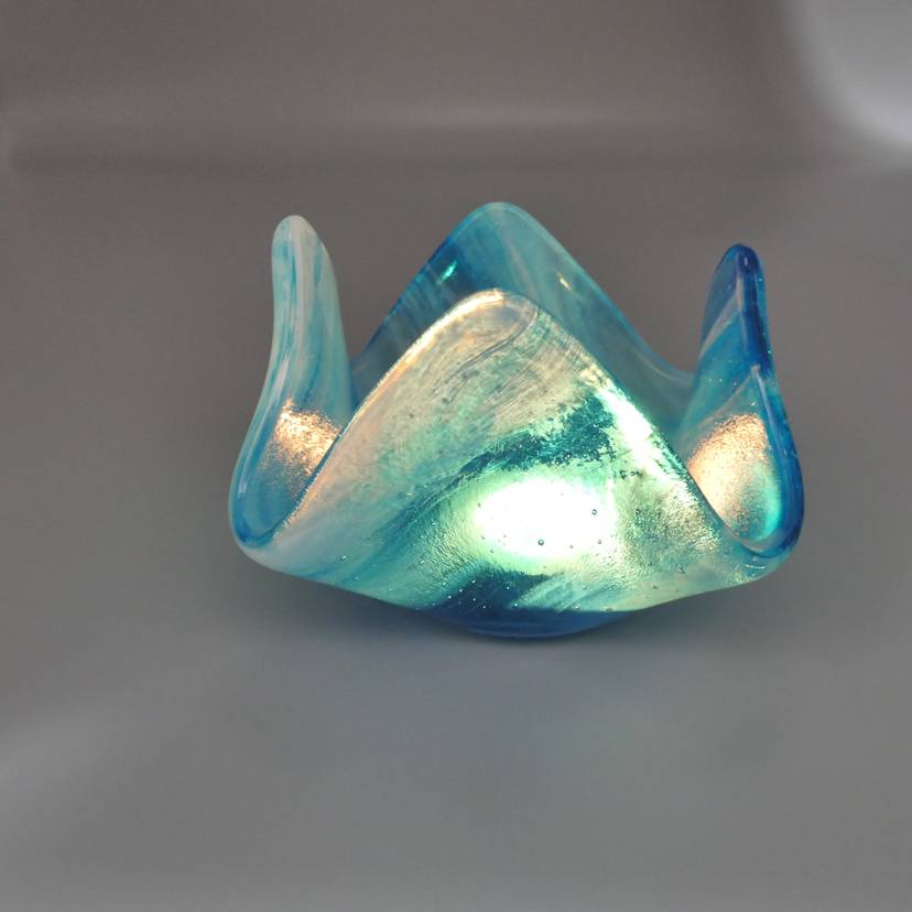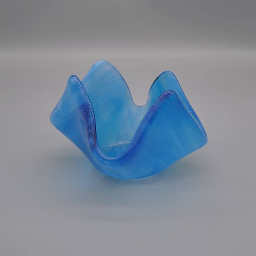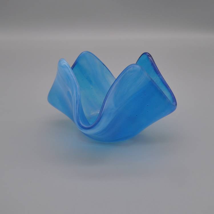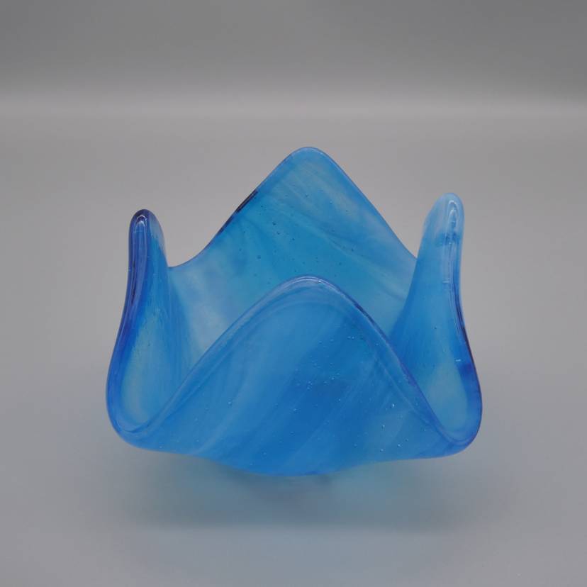 Featuring an electric blue handkerchief-shaped glass dish Hand-formed translucent slag glass with milky swirls Perfect for tealight candles, small votives or as a trinket dish Measures overall about 4-1/2" across x 2-3/4" tall at its tallest point with a 1-3/4" base Weighs about 8.5 ounces before being packaged to ship