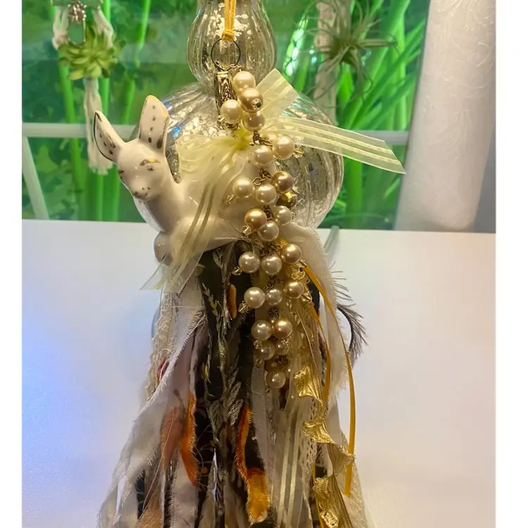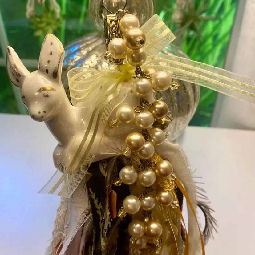 Upcycled vintage ceramic salt shaker using fabric strips, ribbon, crochet trim and beads. Approx 16 inches. I used faux pearls from a vintage necklace to embellish the tassel.