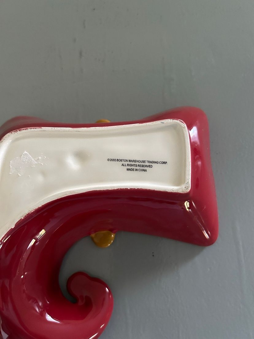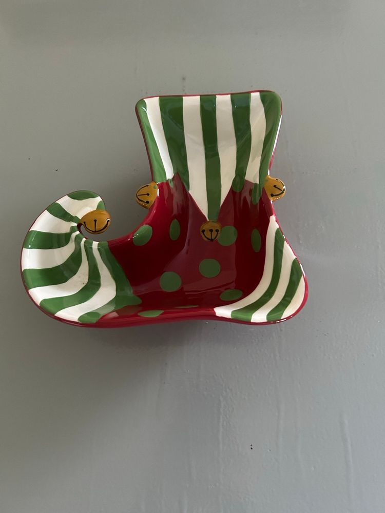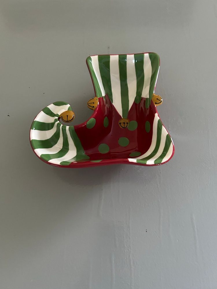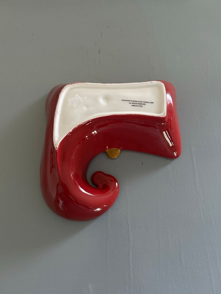 Vintage elf shoe Christmas decor with vibrant red and white design. Ideal for festive settings. Boston warehouse brand.