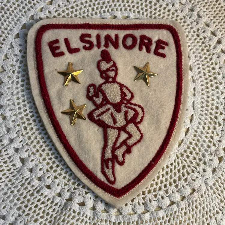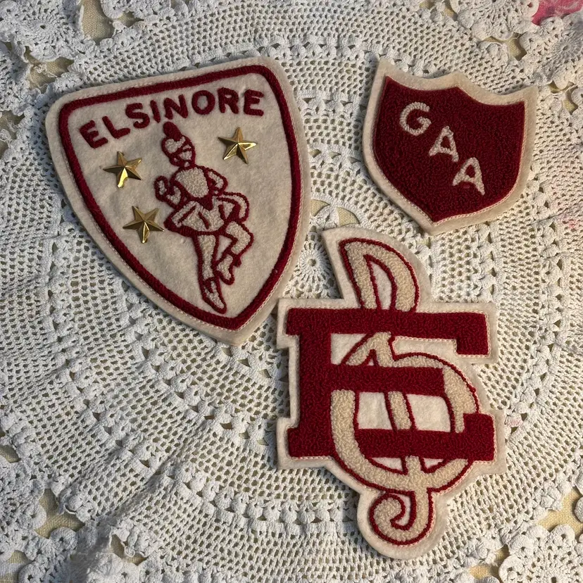 Set of three earned letters from Elsinore High School in Lake Elsinore Calif. This girl lettered in Music, athletics, and was a majorette. Year star pins included! Wonderful condition with a bit of age spots on back. I know who owned these and I can tell you for sure they were from the 1950's. They look great on jean jackets, framed, or school displays.