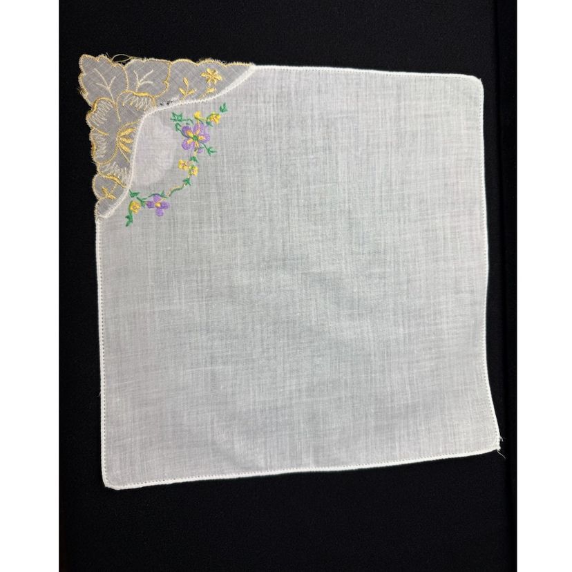 Fine white cotton handkerchief. Hemstitched edge. One corner features a large, detailed flower with purple and gold embroidery, while smaller purple and yellow flowers with green stems and leaves adorn the surrounding area. One small tear in embellishment as shown in photos. Very good condition. 9 ½”x 9 ½”