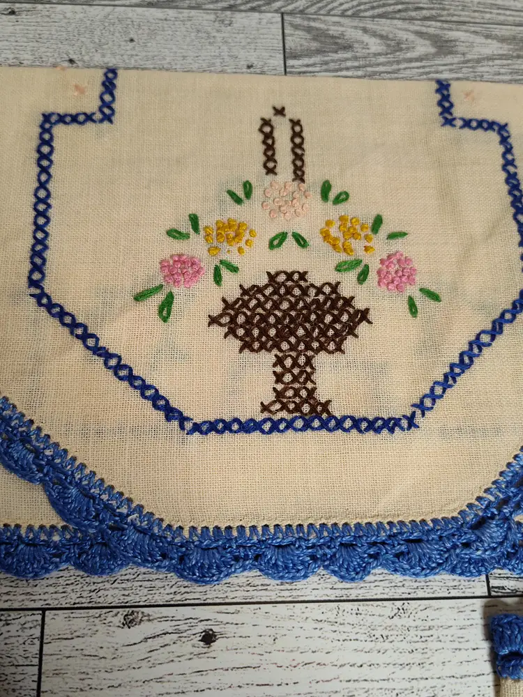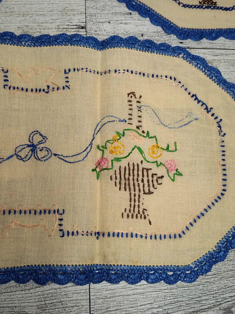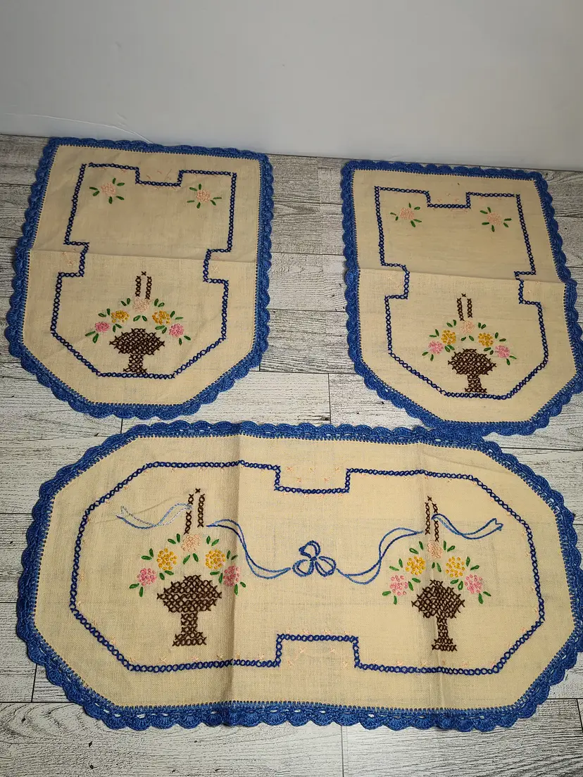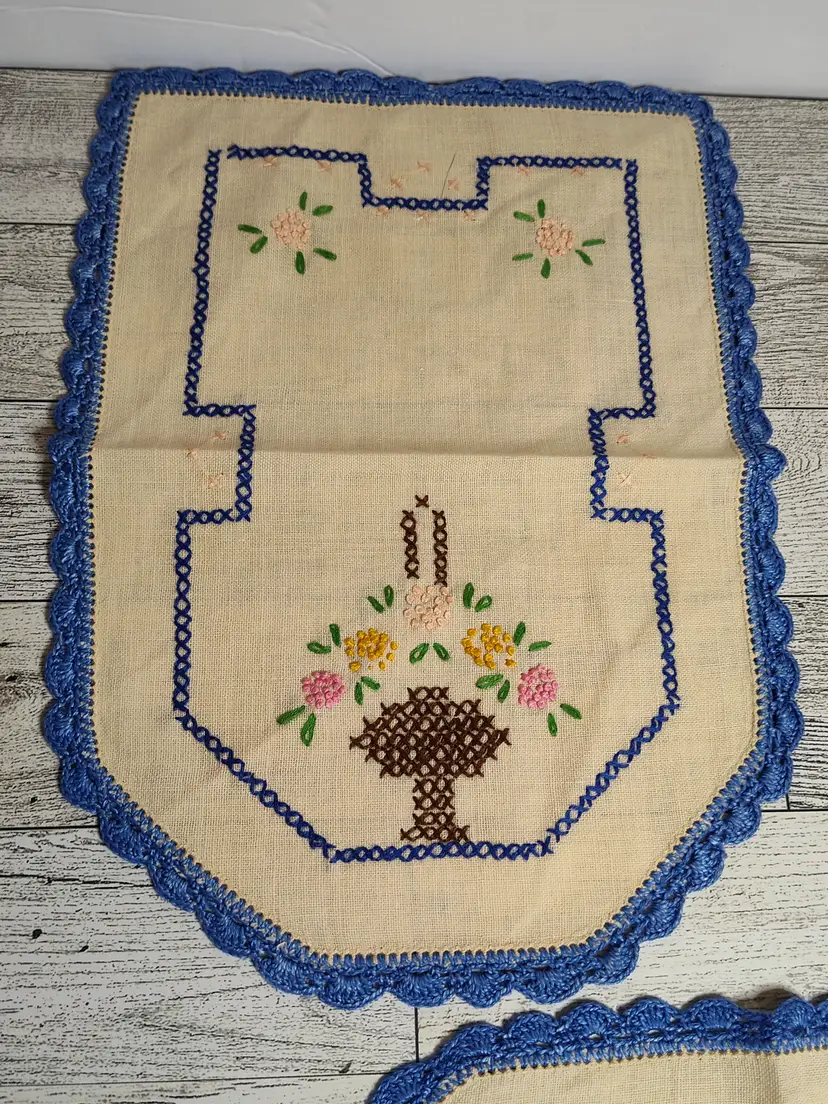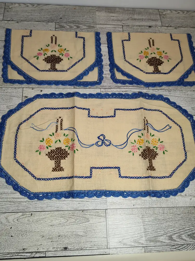 Pressed Embroidered 3 piece set -chair arm & head coverings with flower baskets & blue crocheted trim.
