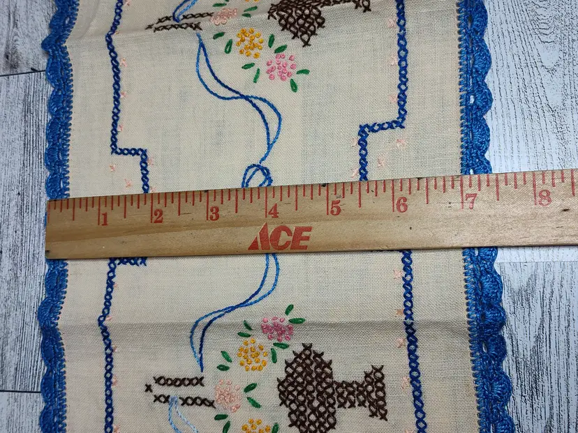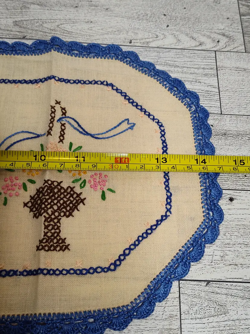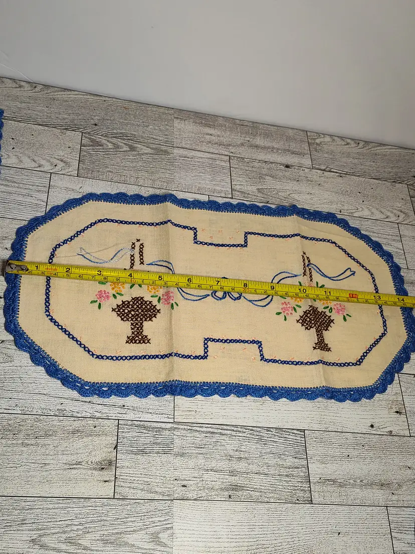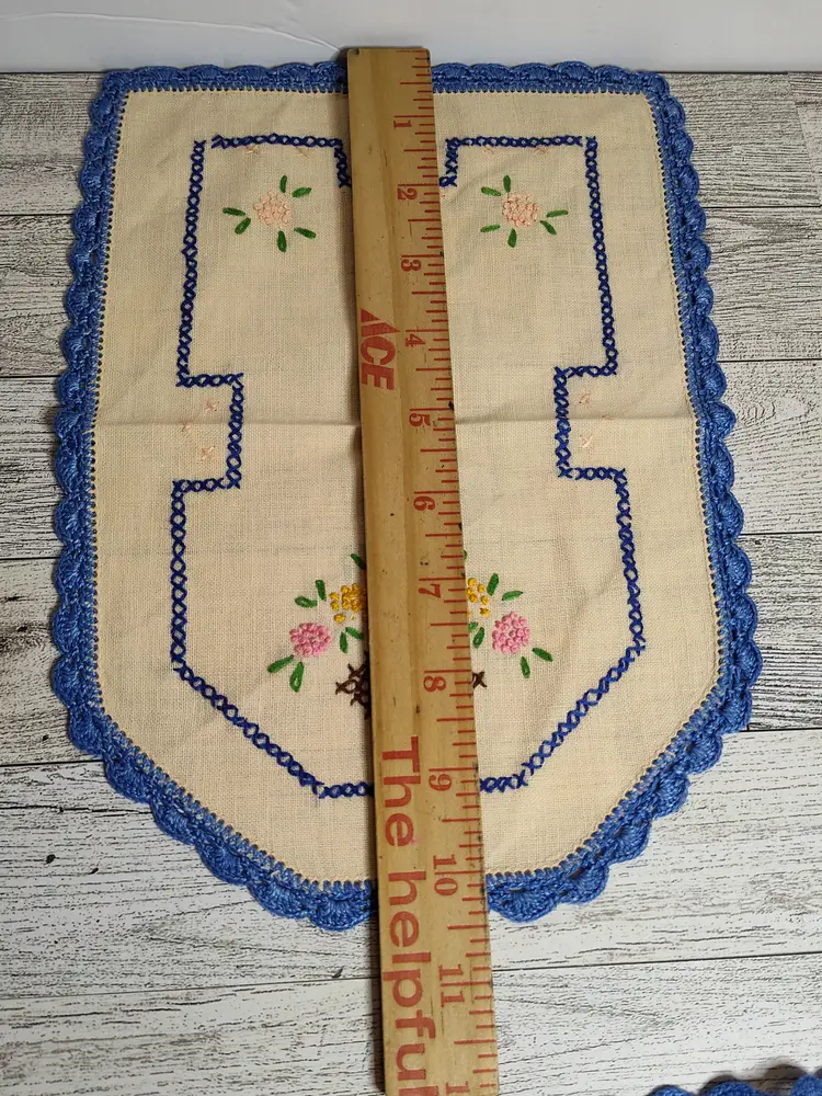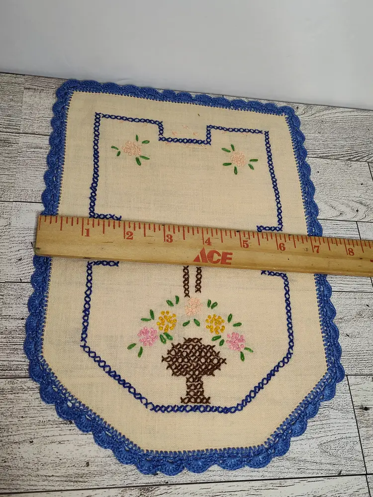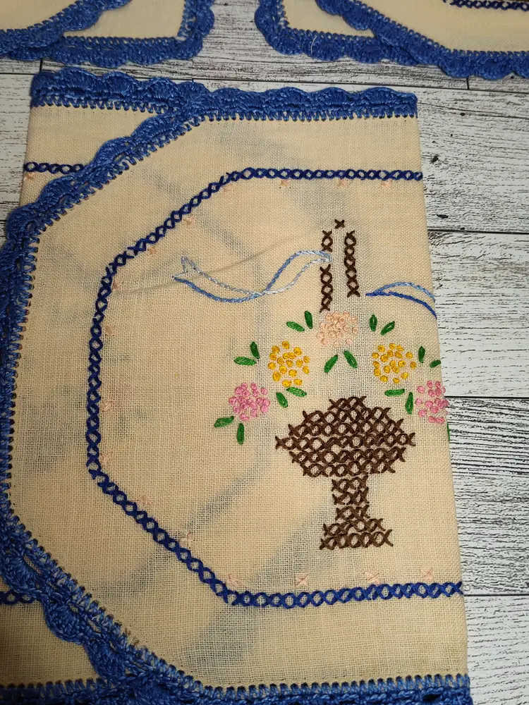 Pressed Embroidered 3 piece set -chair arm & head coverings with flower baskets & blue crocheted trim.