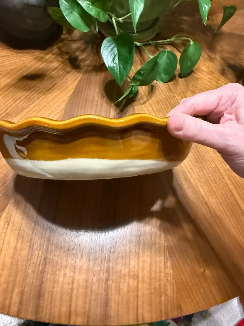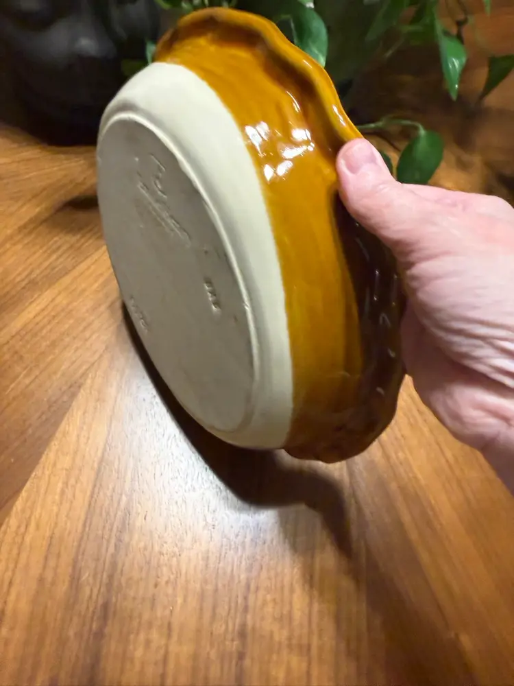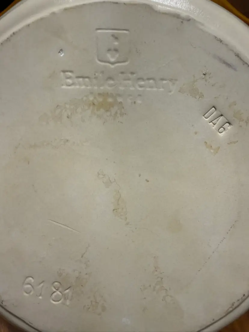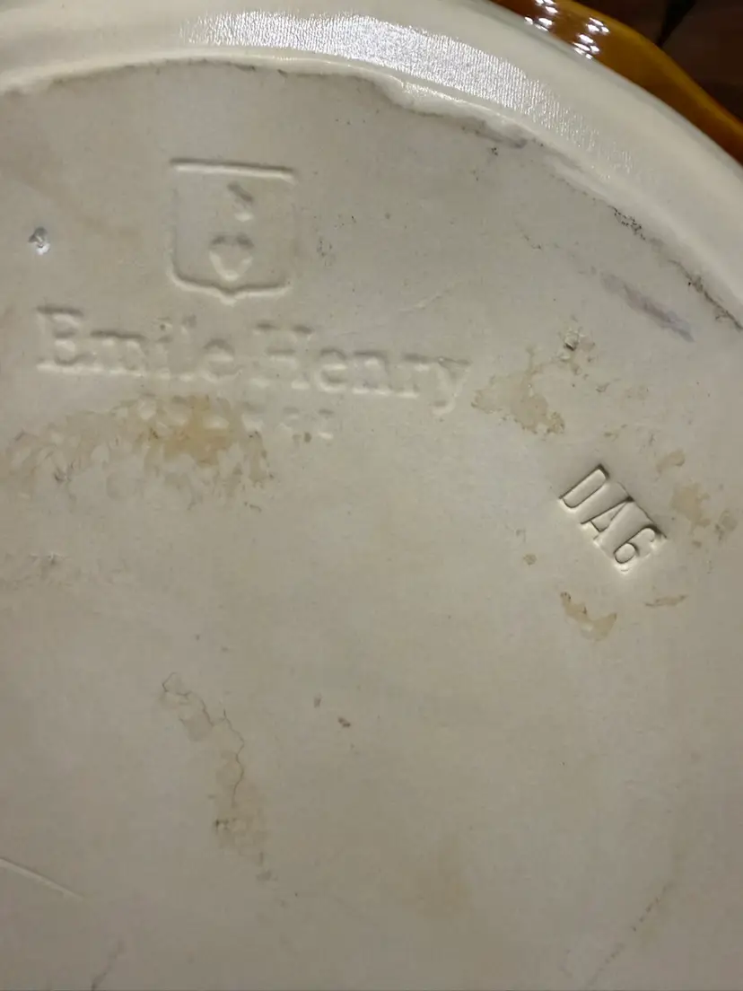 Details: • Maker: Emile Henry • Origin: Marcigny, France • Model: 6181 • Color: Honey / Ochre glaze • Material: Glazed stoneware • Dimensions: Approx. 10” diameter × 2” high • Condition: Excellent vintage condition with light surface wear from gentle use; no chips or cracks. • Marked: Emile Henry France 6181