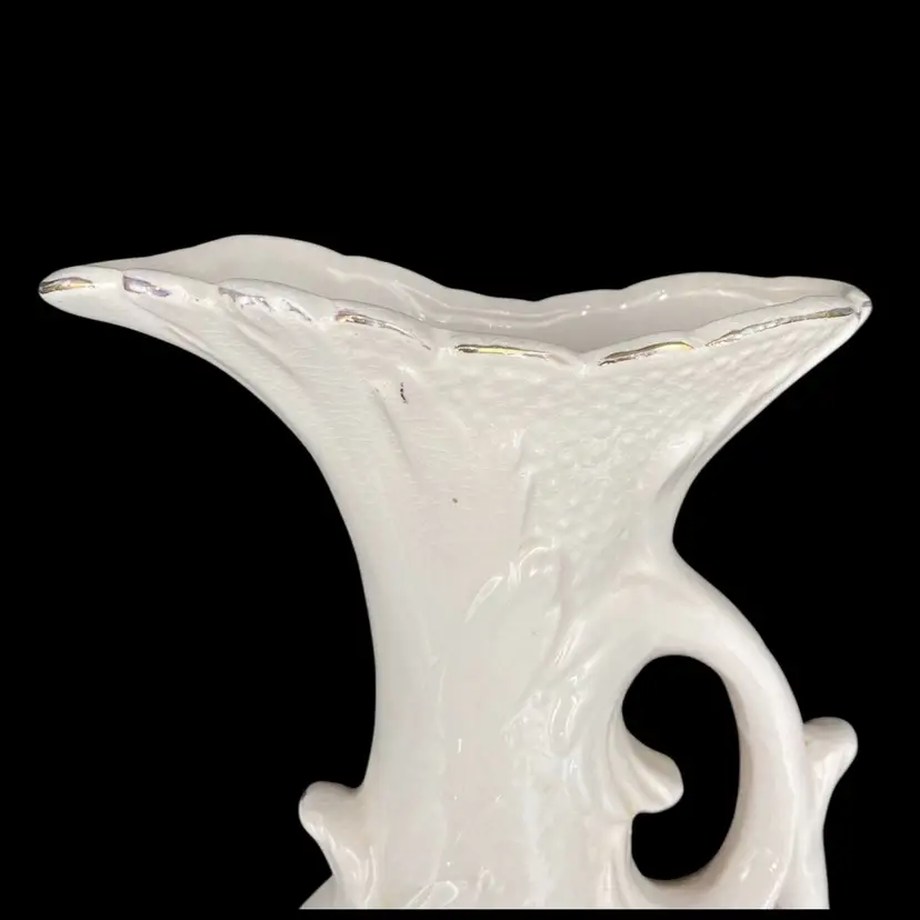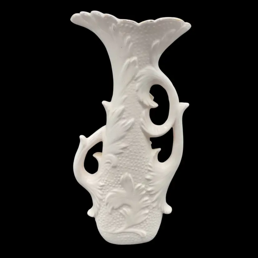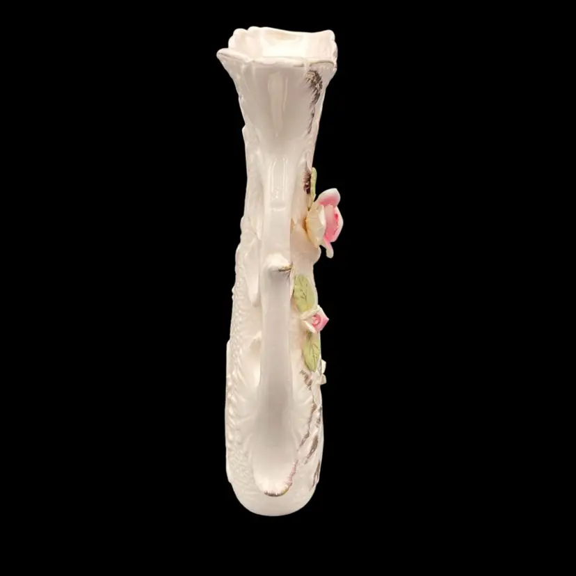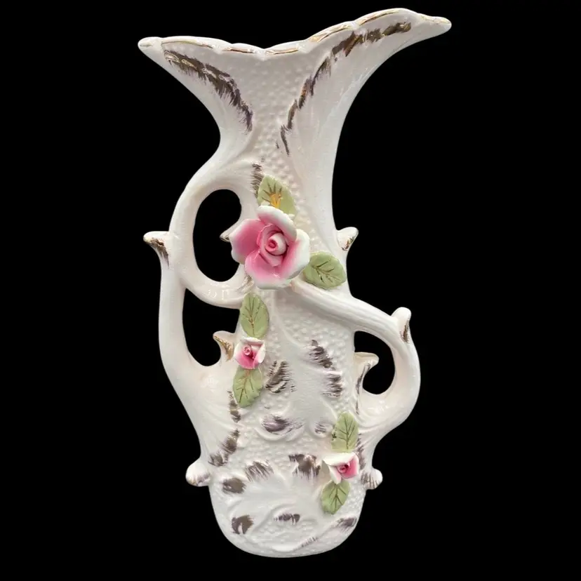 This beautiful vintage Japanese Empress porcelain rose vase is a lovely near-antique addition to your collection. The vase features a delicate pink color with gold gilt accents and handles sculpted to look like rose vines. The attached rosebuds add a touch of elegance to the design, making it perfect for all occasions. Crafted in Japan in the early 20th century, this medium-sized vase stands at 9.5 inches tall and measures 4.75 inches in width weighing 11.4 ounces. The rosebuds are hand-applied, as is the gold gilt. The vase retains its original sticker on the base.