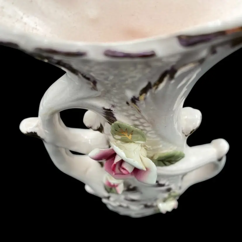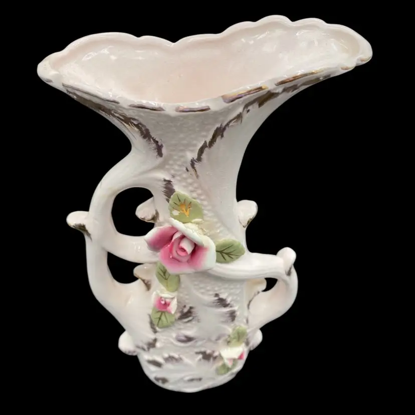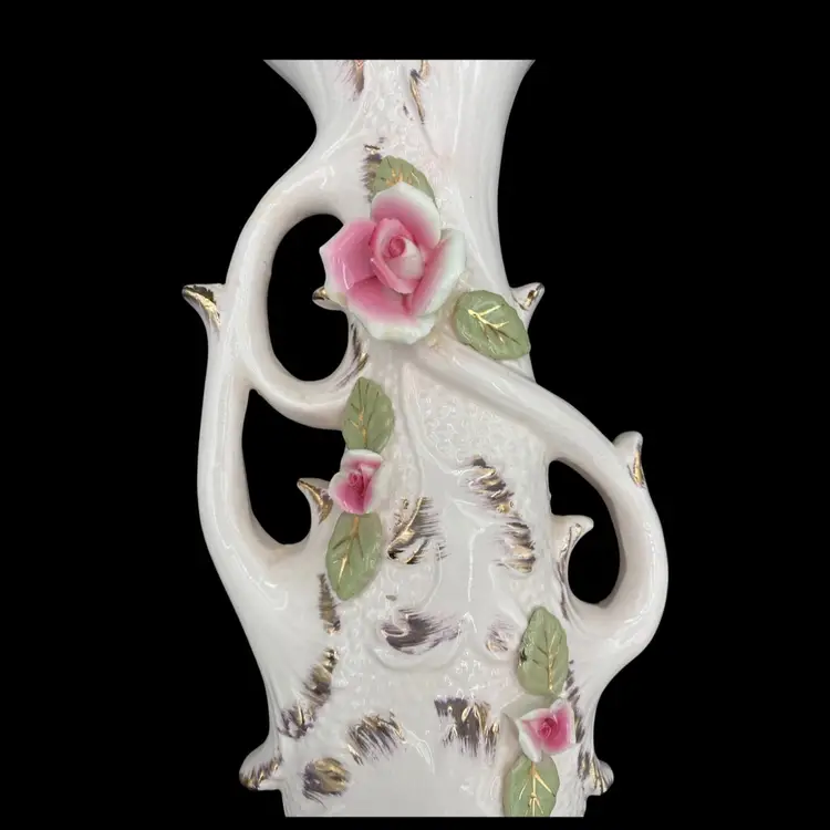The vase is in excellent used condition. The pink porcelain color is steady as the gold gilt has very little wear. There are three applied roses and six applied leaves. The leaves are all intact; of the fourteen rose petals, three have chipped tips (2 on the large rose, one on the middle small rose). However, they are no particularly noticeable unless you're looking for them. Please review all the pictures for the best sense of description. Thank you!