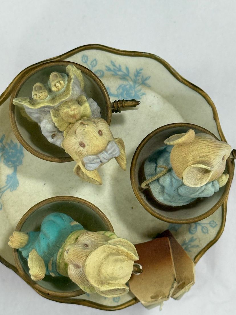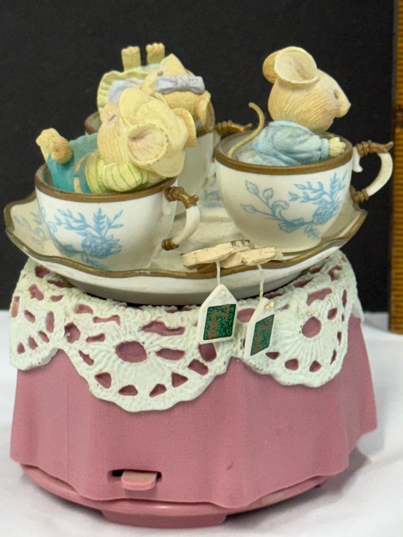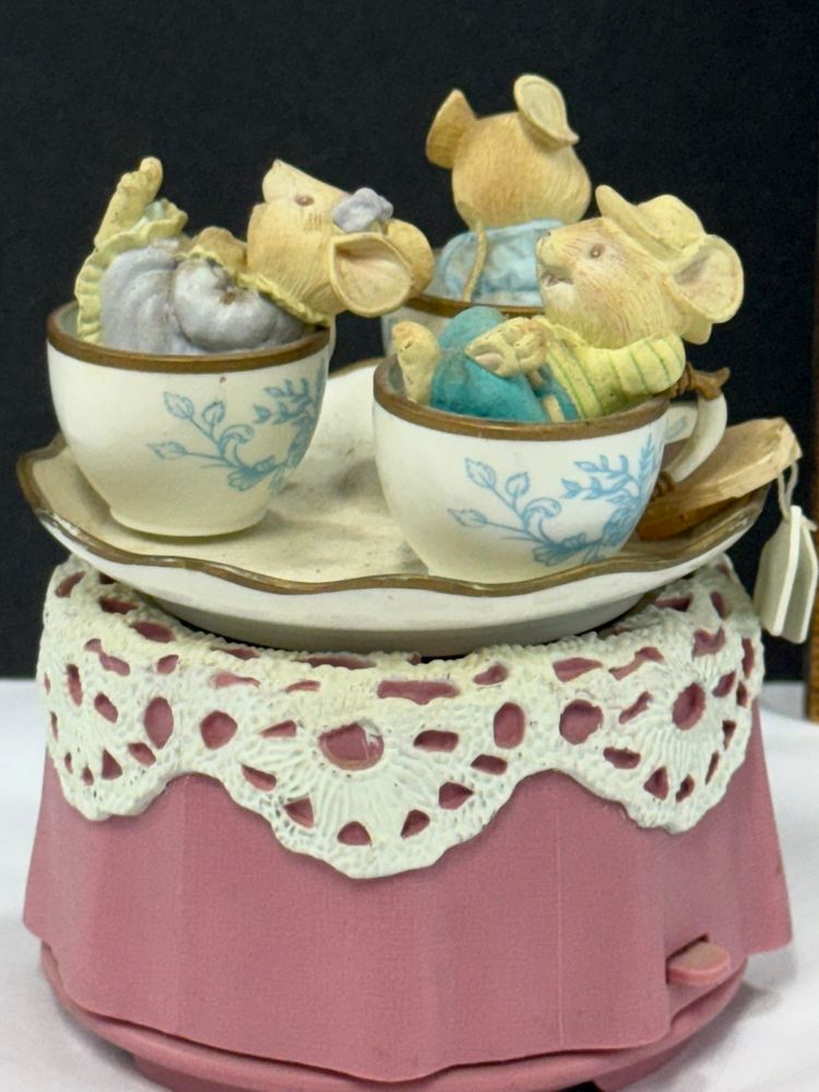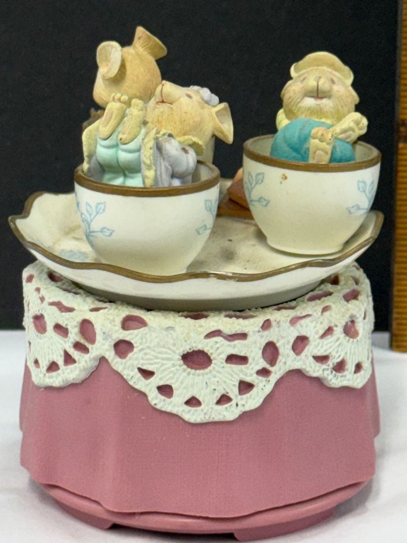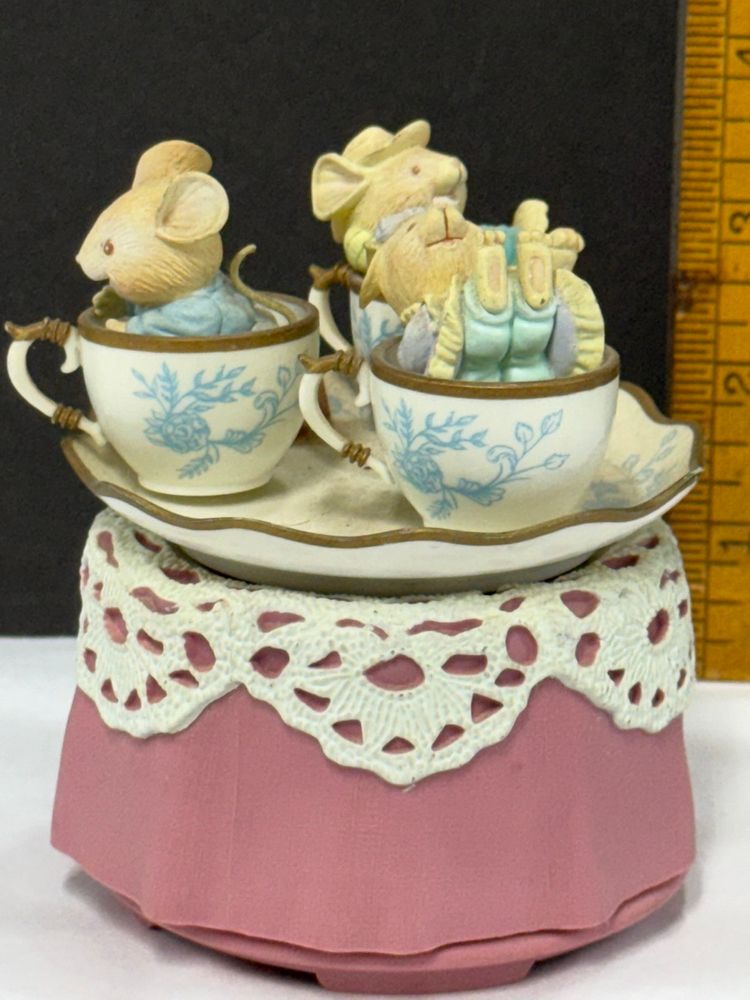 Vintage Enesco Music Box (1983) featuring 3 mice in tea cups. Plays "Love Makes The World Go Around"