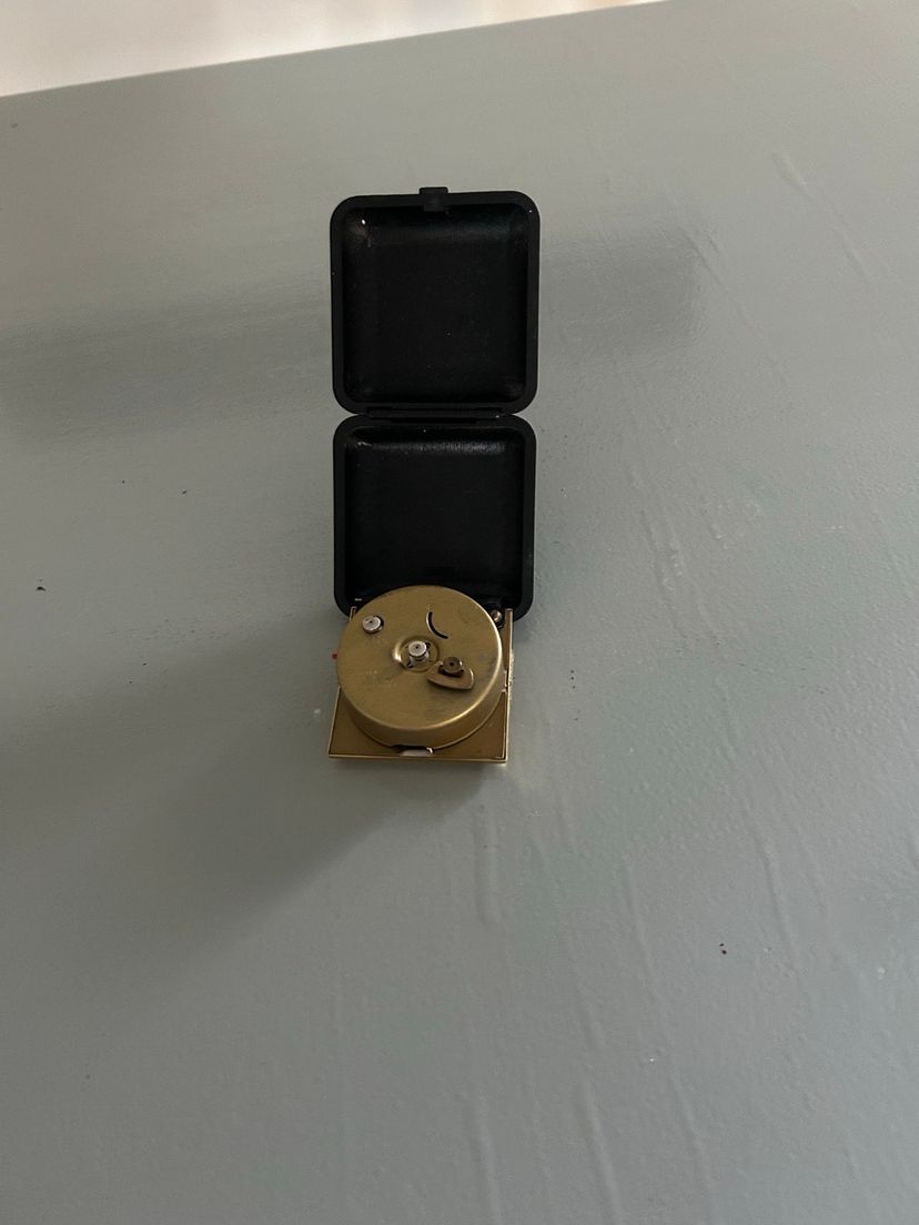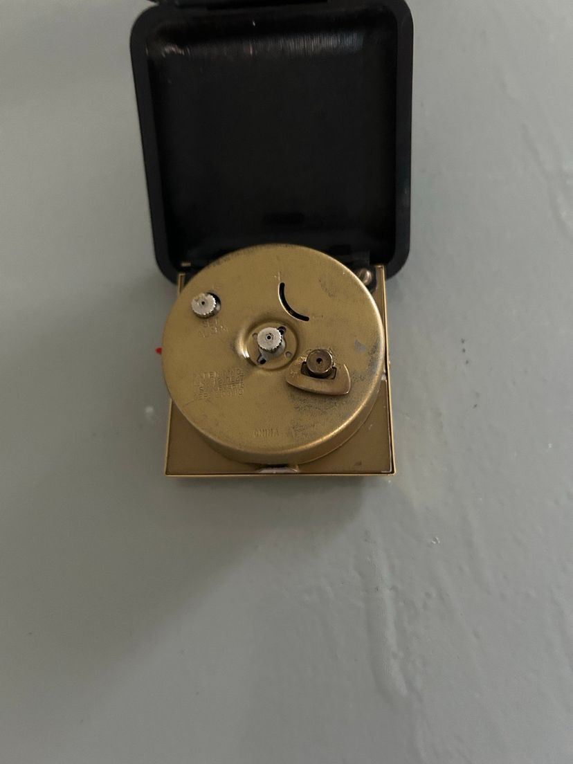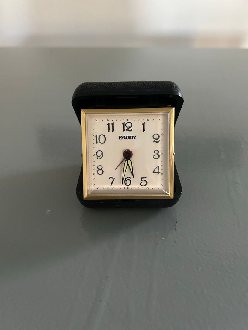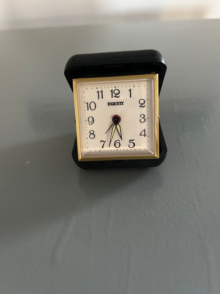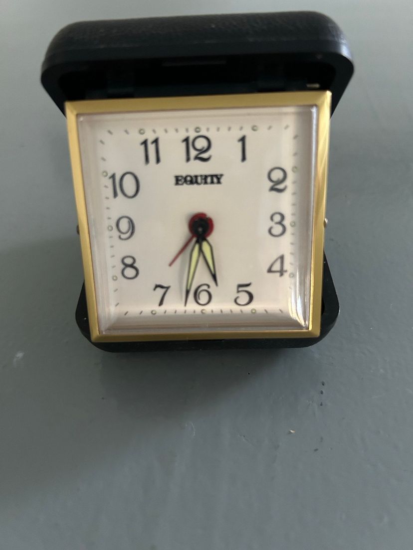 Enhance your home with the stylish vintage Travel Clock. Featuring a sleek black case and elegant gold accents, clock hands glow in the dark. This is a wind up clock. Its compact design makes it ideal for travel or bedside use.