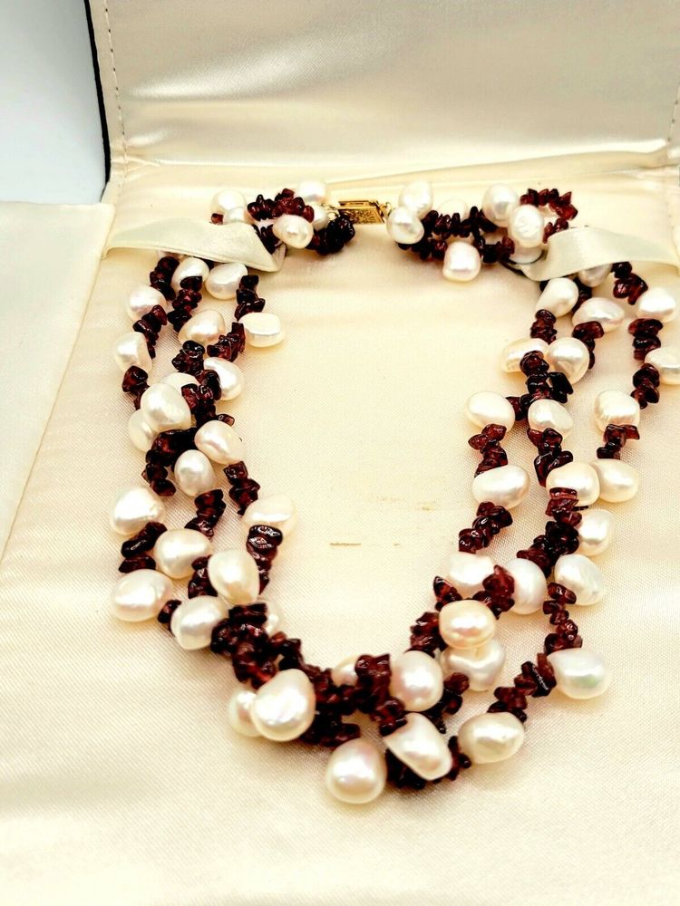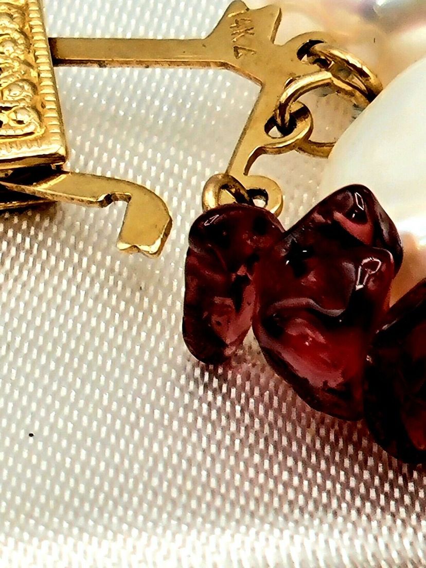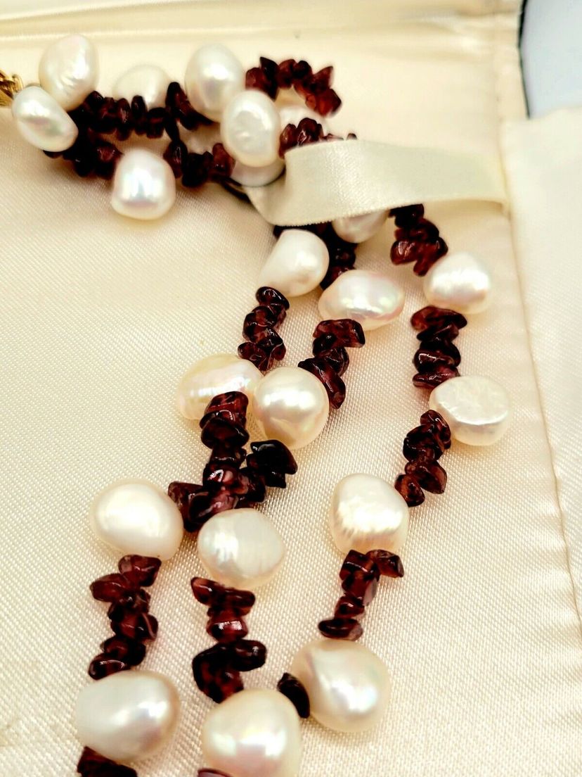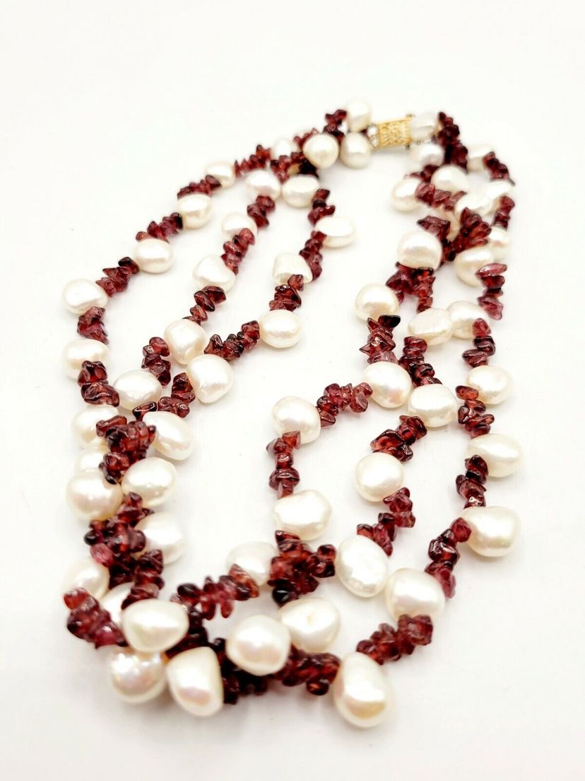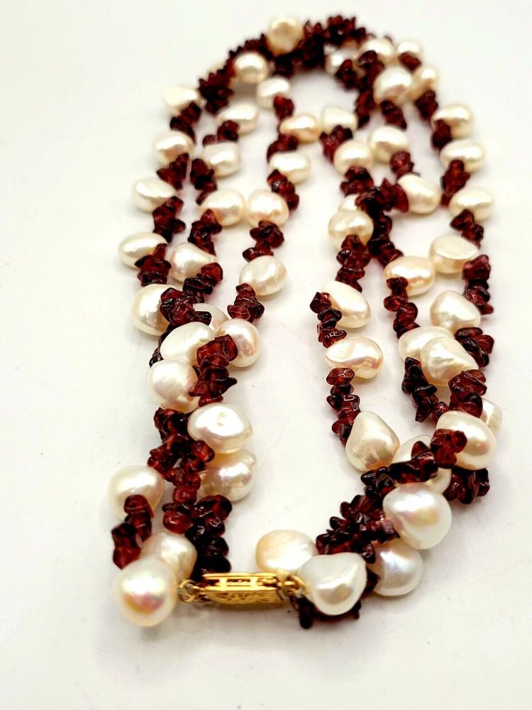 This is beautiful. In the original packaging, there are 3 strands of beautiful cultured baroque pearls, garnet, and an antique box clasp marked 14 kt. The pearls are absolutely amazing. 15", truly an exceptional quality piece!