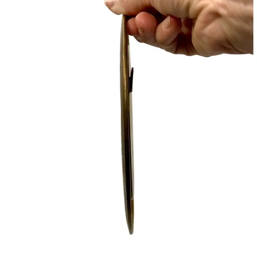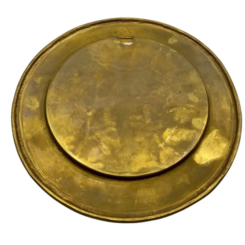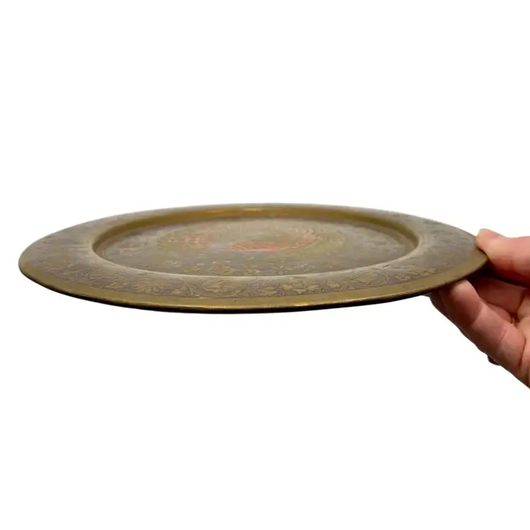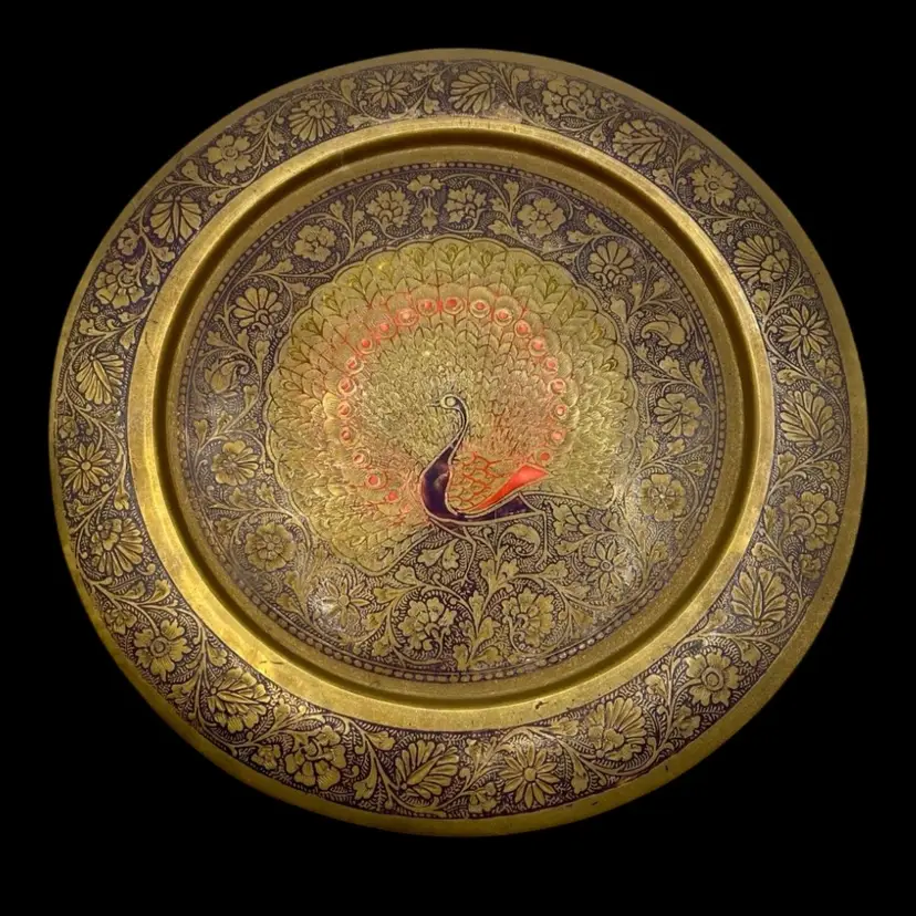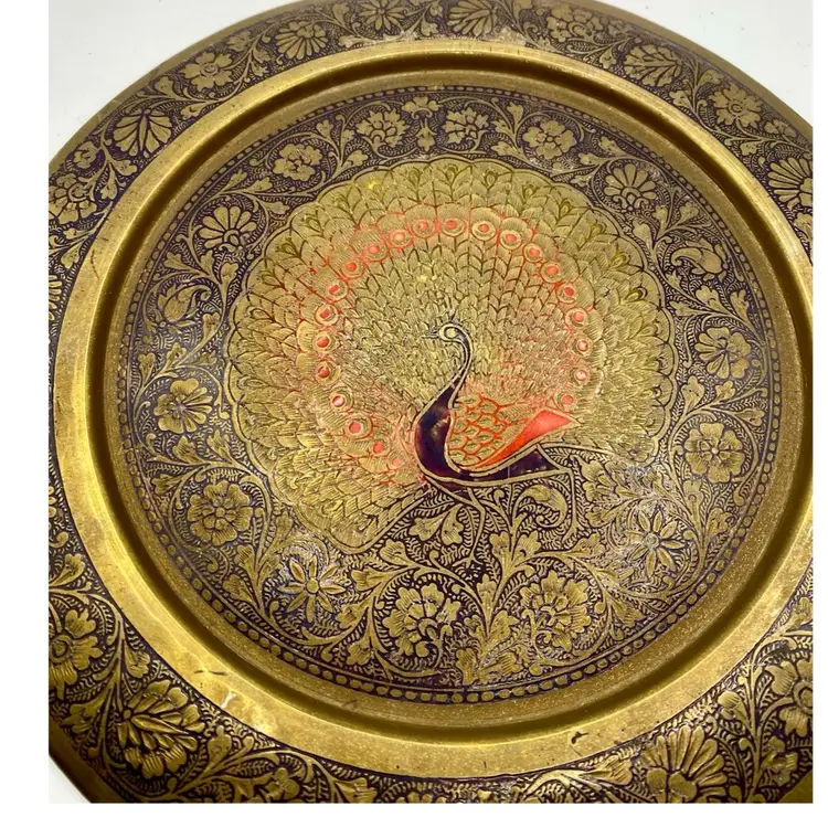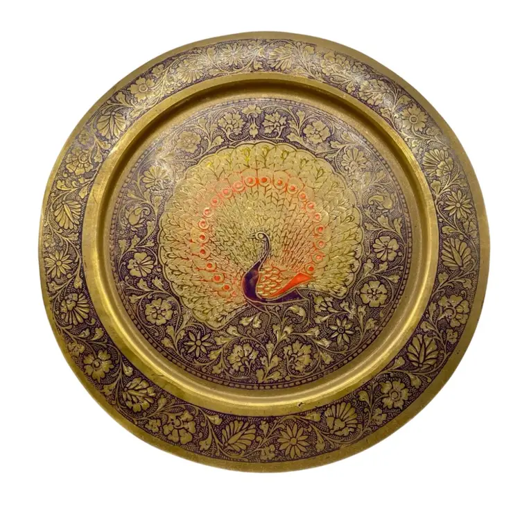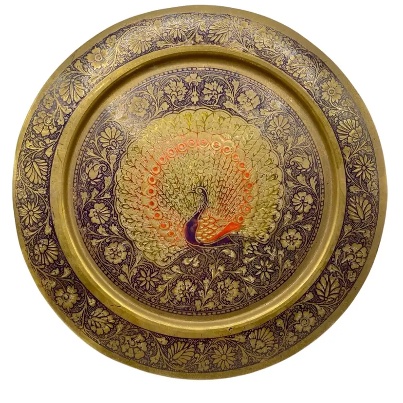 This vintage plate is a true work of art, featuring an intricate etched design of a peacock in full display, surrounded by florals, all crafted from high-quality brass. The plate is handmade in India and showcases a beautiful combination of traditional craftsmanship and artistic creativity. Its size of 9.5" makes it perfect for adding a touch of interest to any room.