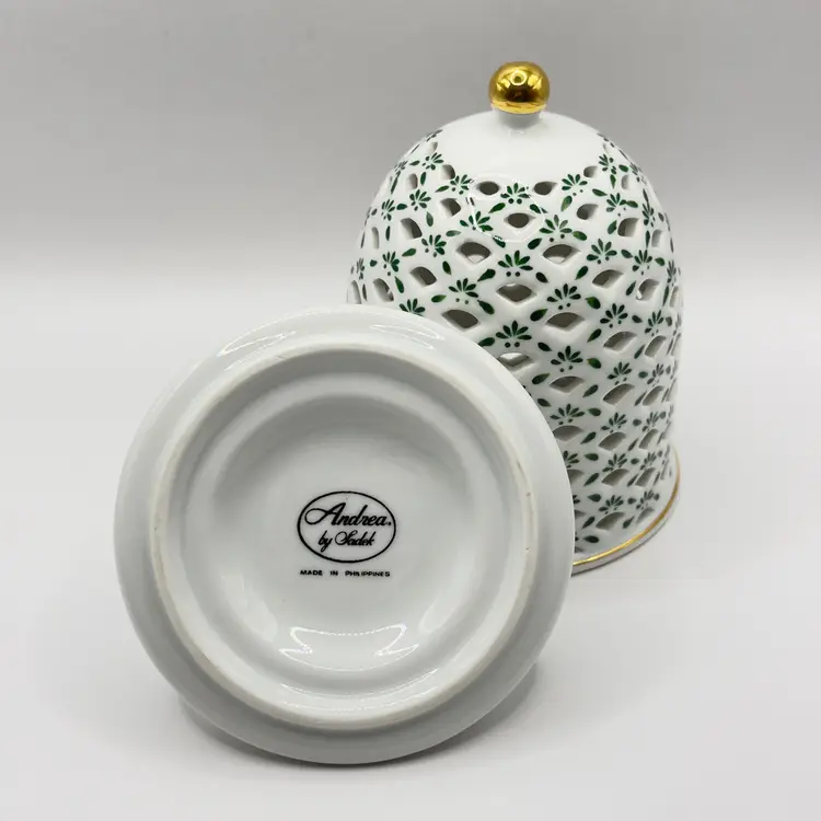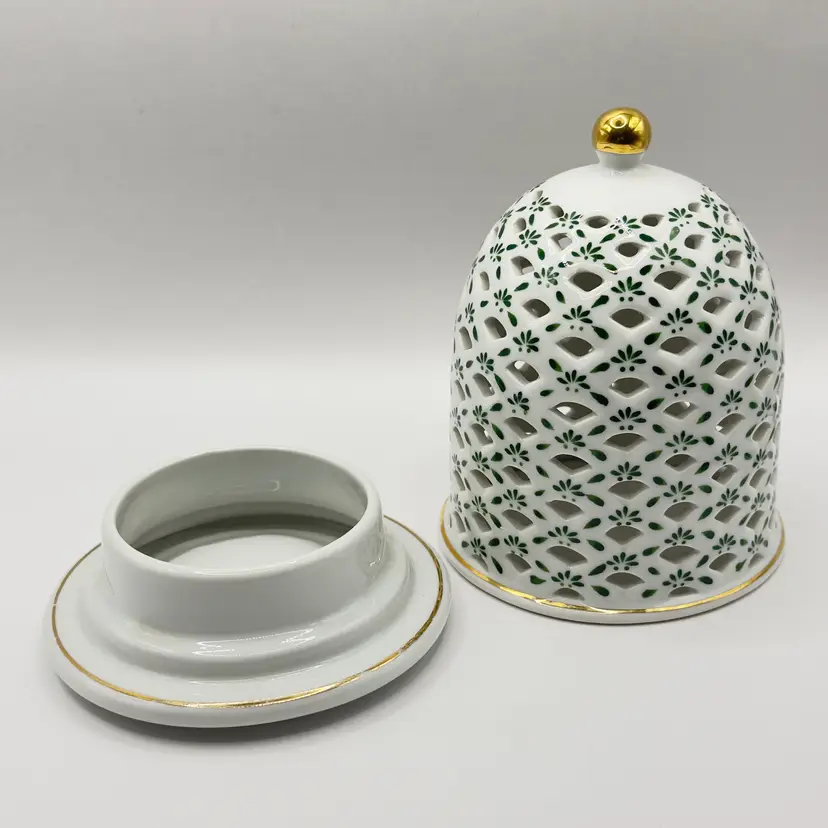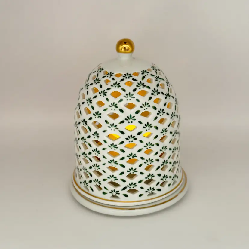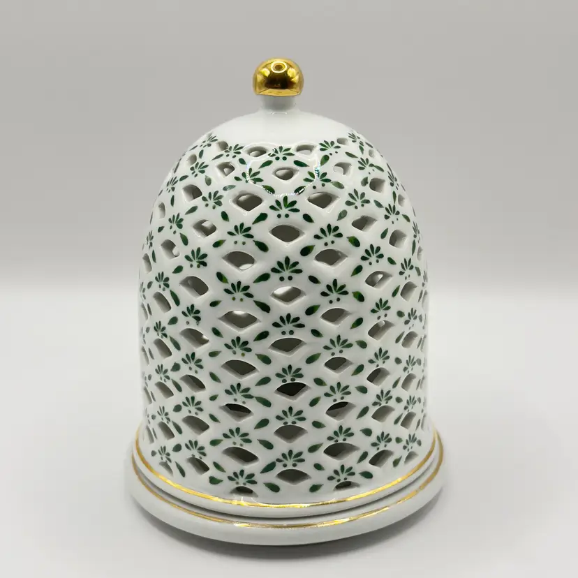 Elevate your home decor with this vintage fairy light lamp ceramic lattice dome, featuring intricate green patterns and elegant gold accents. Perfect as a decorative piece. In excellent condition with no chips or cracks. Measures 6x4x4 inches. Weighs 1lb. 6oz.