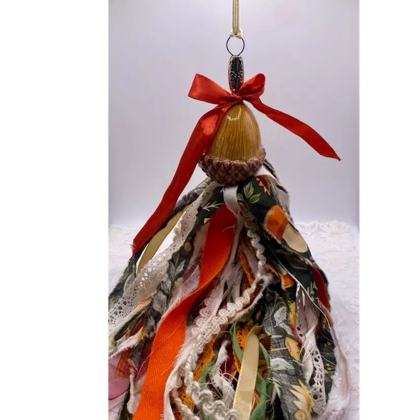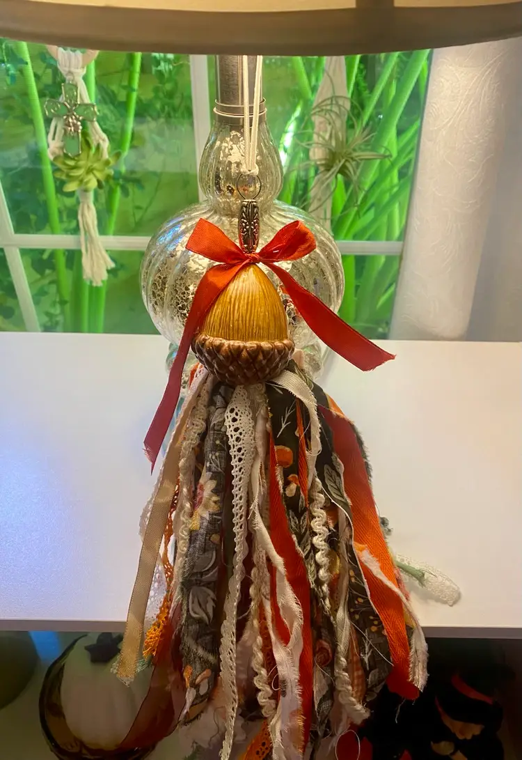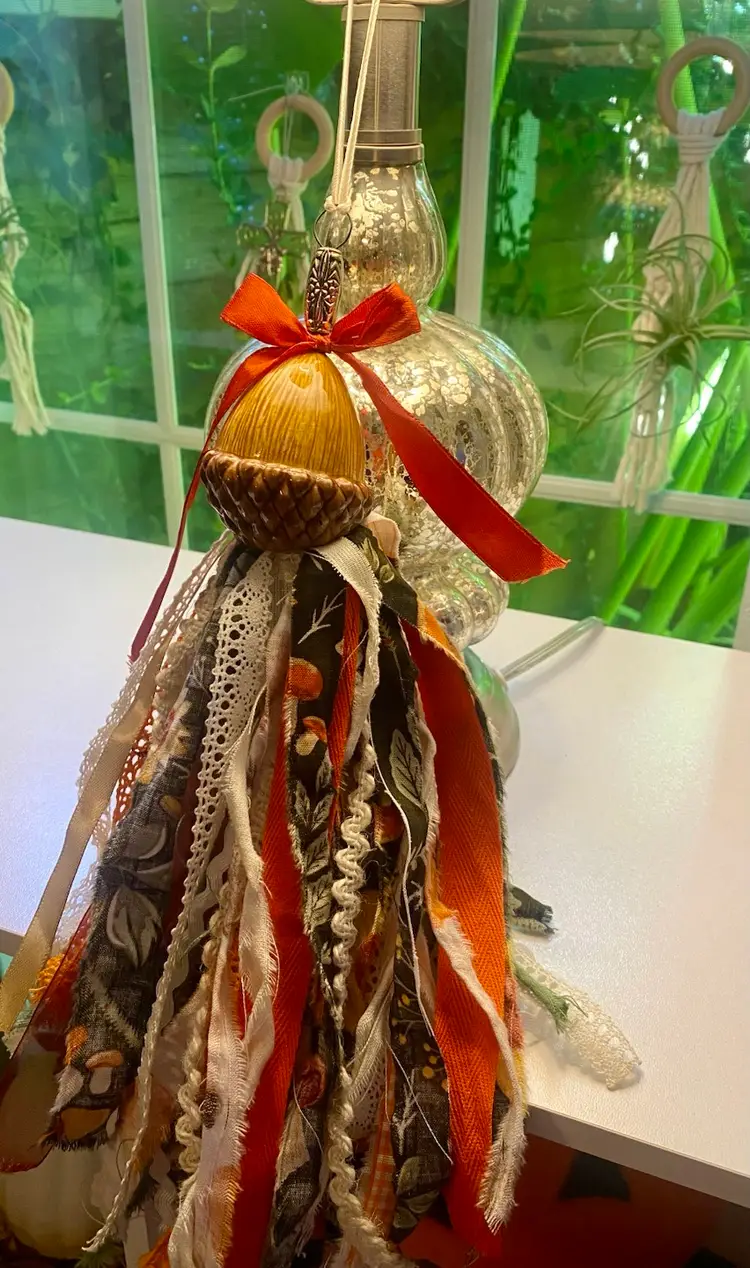Upcycled vintage ceramic salt shaker using fabric strips, ribbon, crochet trim and beads. Approx 16 inches