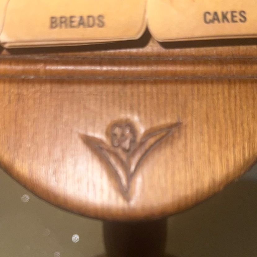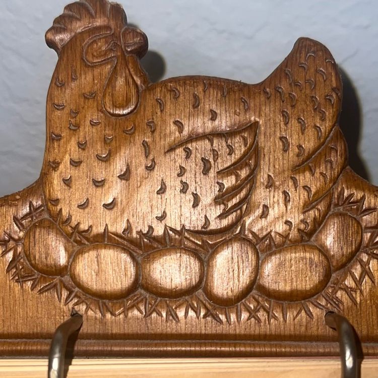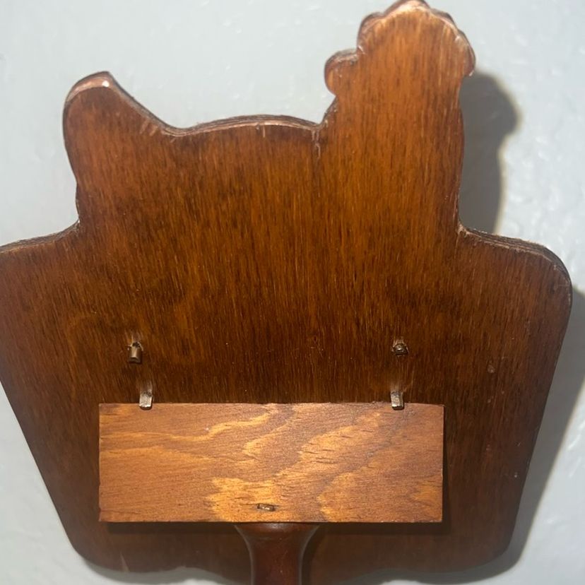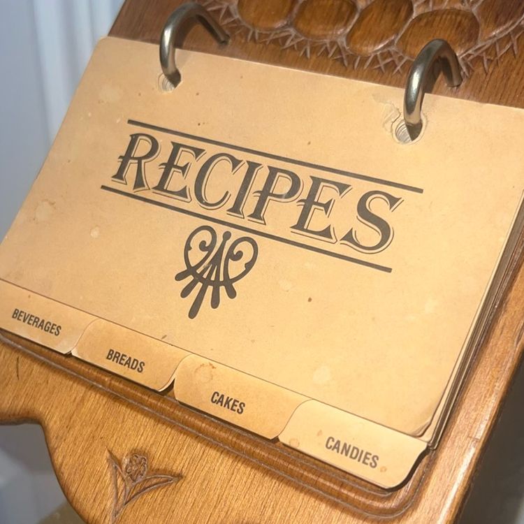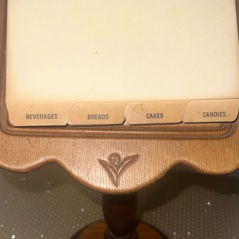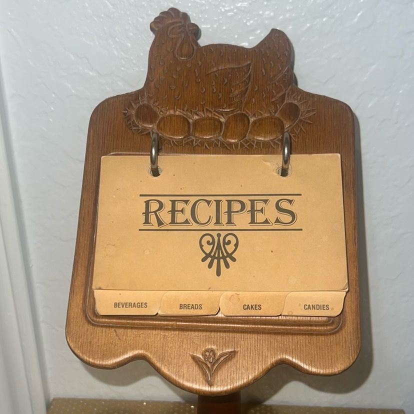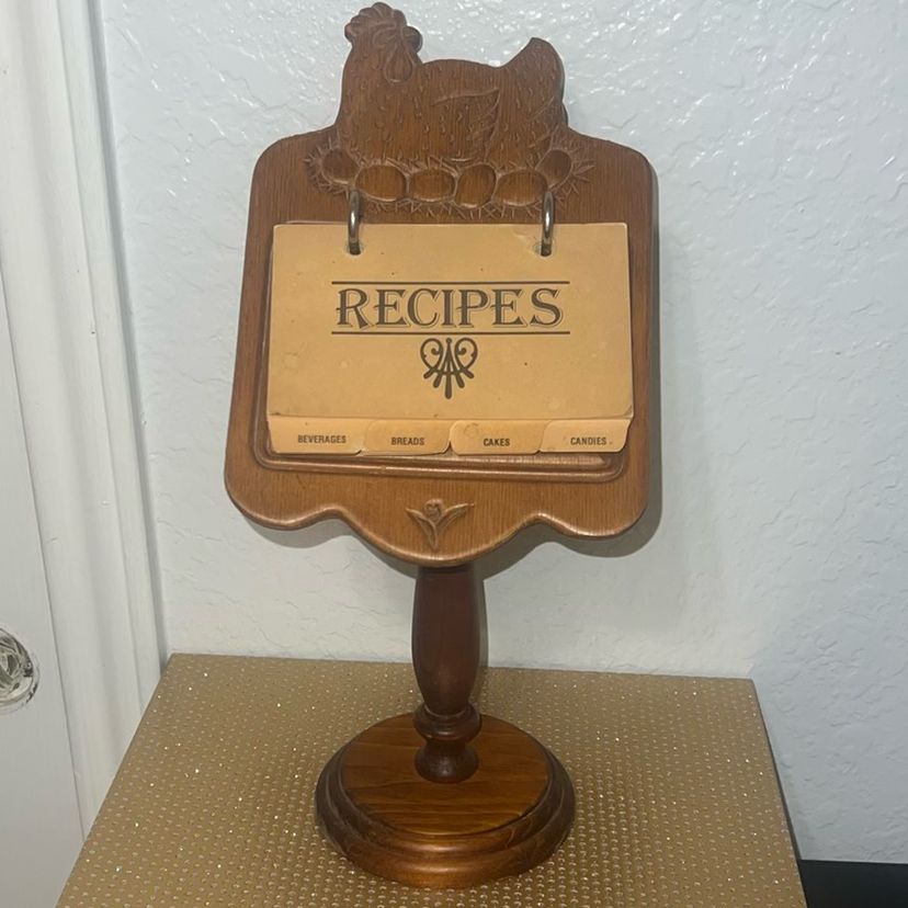 Solid wood chicken pedestal recipe card holder. Original cards. Normal discoloration on front cards due to age. Perfect condition. 12.5" Tall