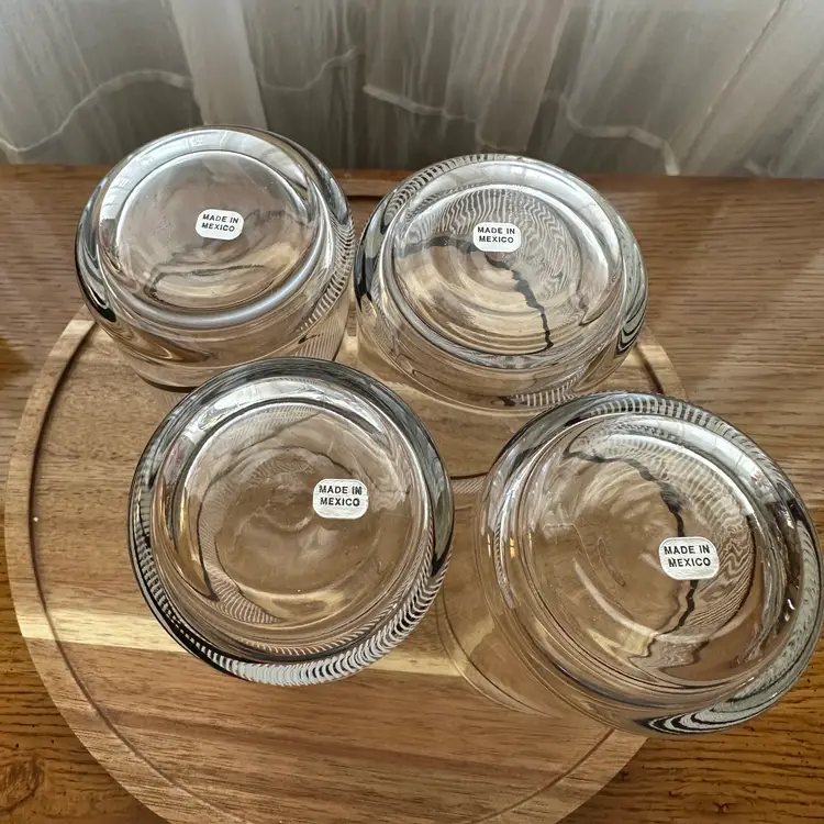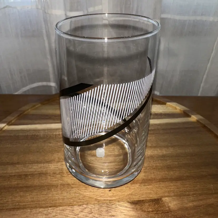 Elevate your home bar with this striking set of four vintage Georges Briard for Crisa tall tumblers. Featuring a bold and graphic black spiral and white stripe design, these highball glasses are a quintessential piece of Mid-Century Modern barware that adds instant character to any collection. Iconic 1970s design. All four tumblers have "Made in Mexico" sticker on the bottom. 5" tall x 2.5" wide.