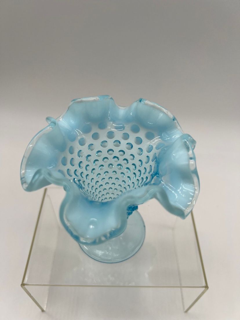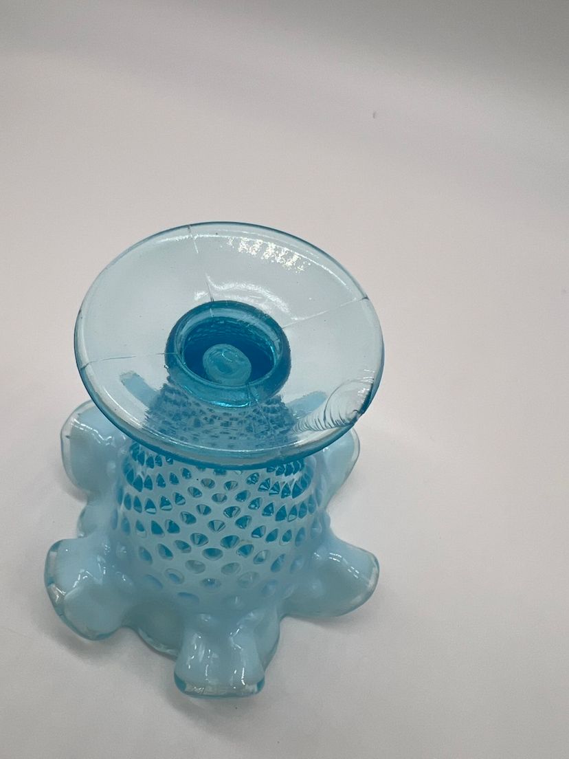 This Vintage Fenton Aqua Opalescent Hobnail Trumpet Vase is a breathtaking example of Fenton's artistry, featuring the iconic hobnail design that is both timeless and elegant. The stunning aqua hue, enhanced by the opalescent finish, creates a beautiful play of light, making it a captivating addition to any decor.
