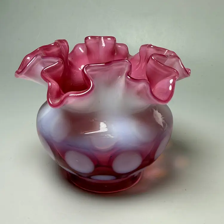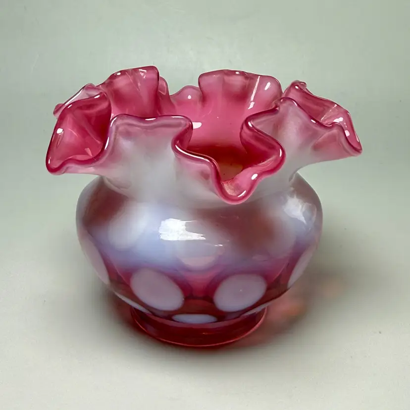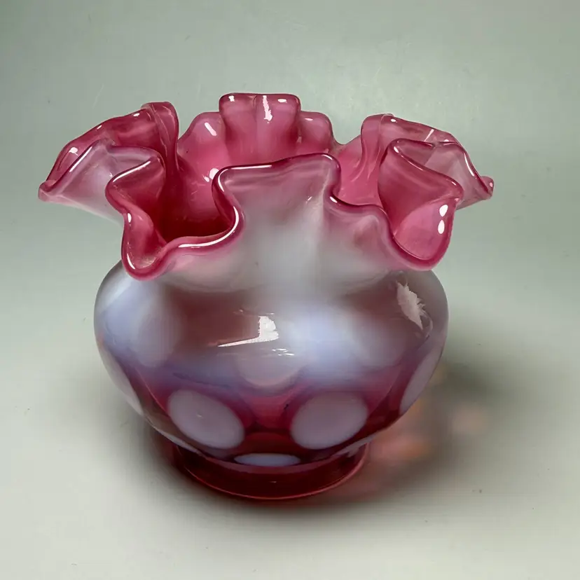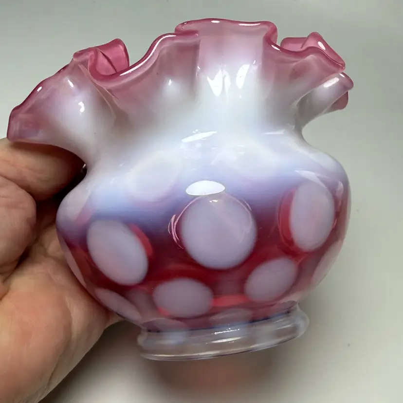 Vintage Fenton Cranberry Opalescent Coin Dot Polka Dot Ruffle Vase Rose Bowl. Unmarked. 4" tall x 4.75" diameter mouth. Great condition. No chips, no cracks.