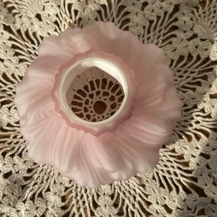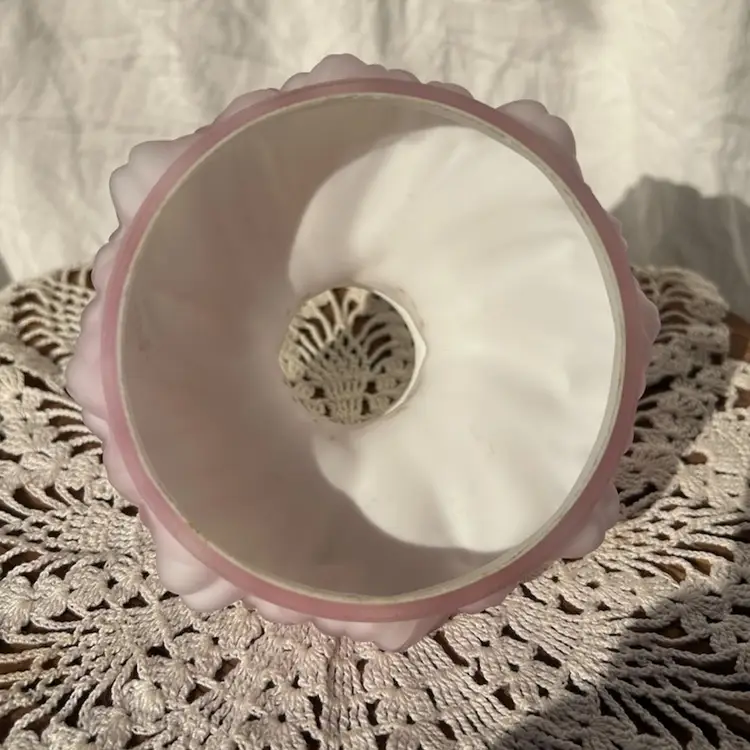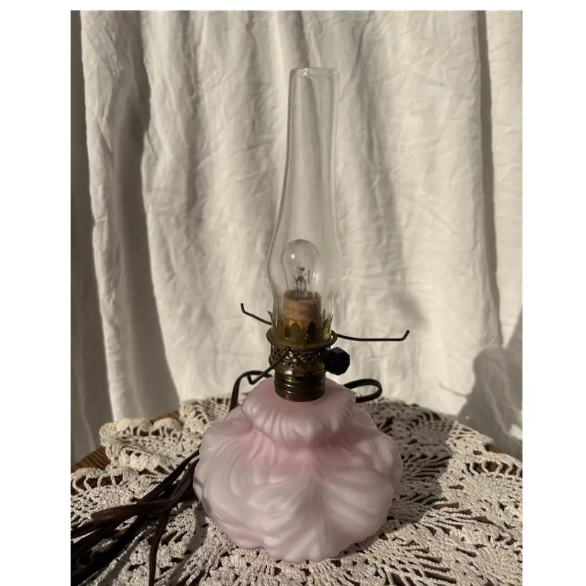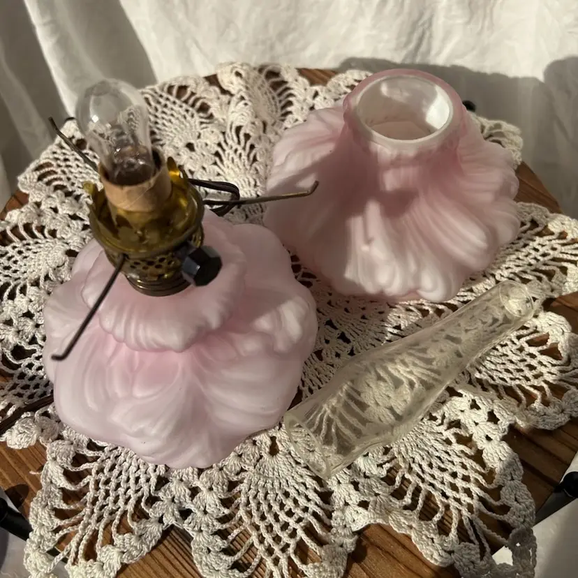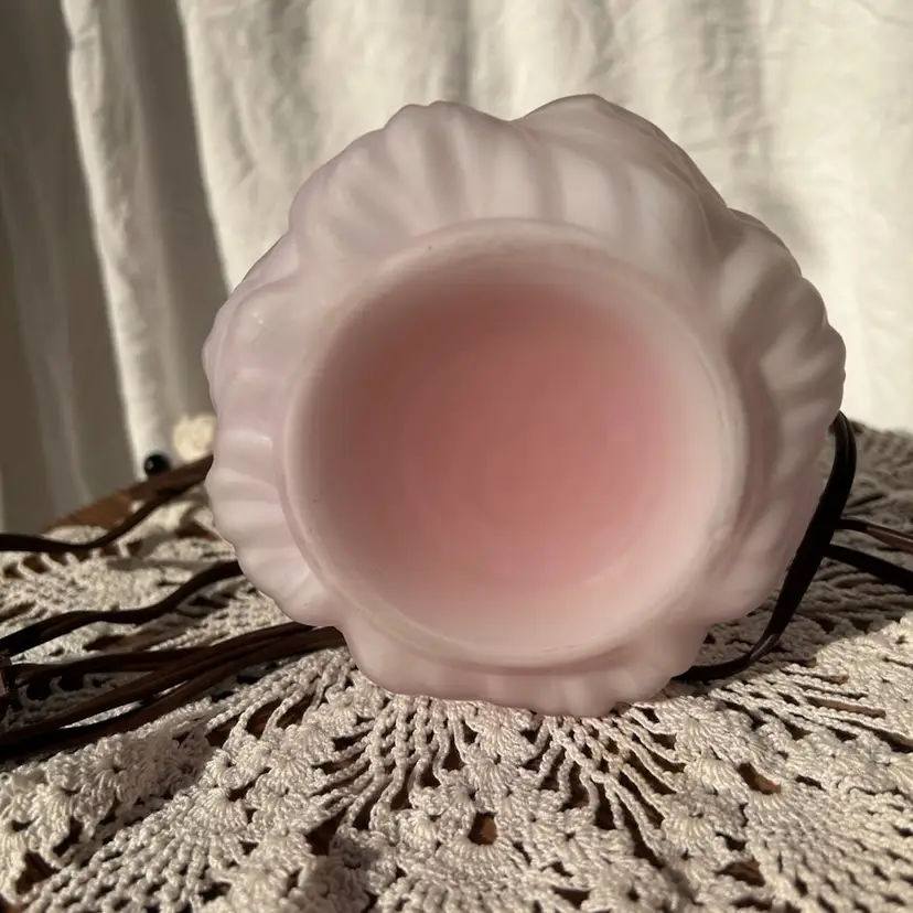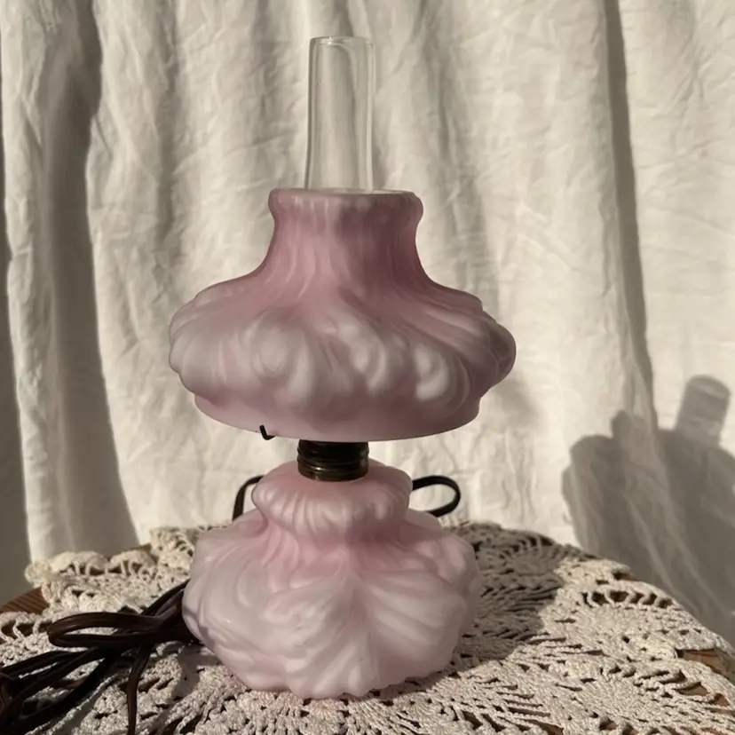 Made in the 1950s-60s, this beautiful oil lamp is made of pink cased glass. There are no flaws and it’s in the Plume pattern or aka Flume. Measures 8.75” tall to the top of the chimney and @5” wide.