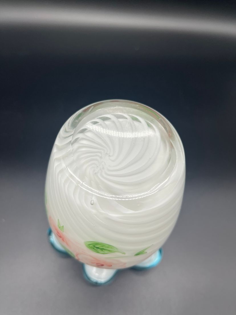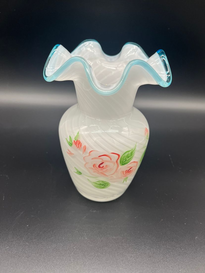 Likely from 1970s, this hand-painted floral Fenton Art Glass vase may have been made specifically for Teleflora. The ruffled, crimped rim is an aqua crest, and the vase base is adorned with a floral design of pink roses and green leaves.