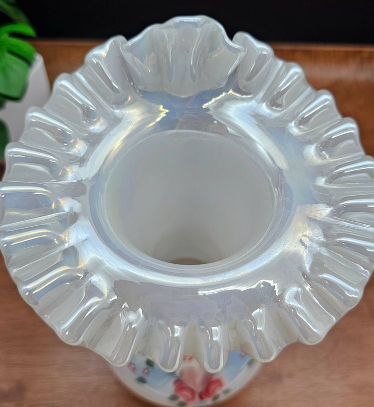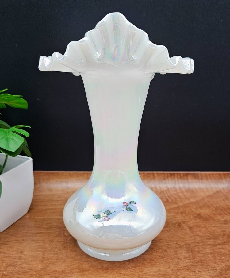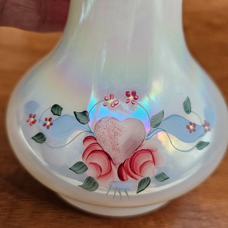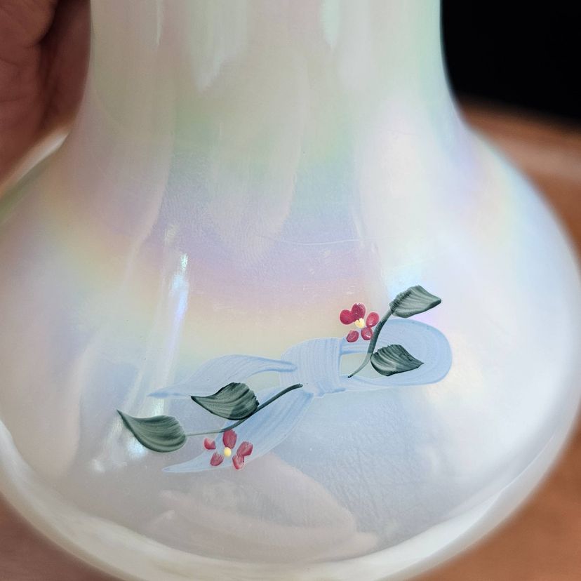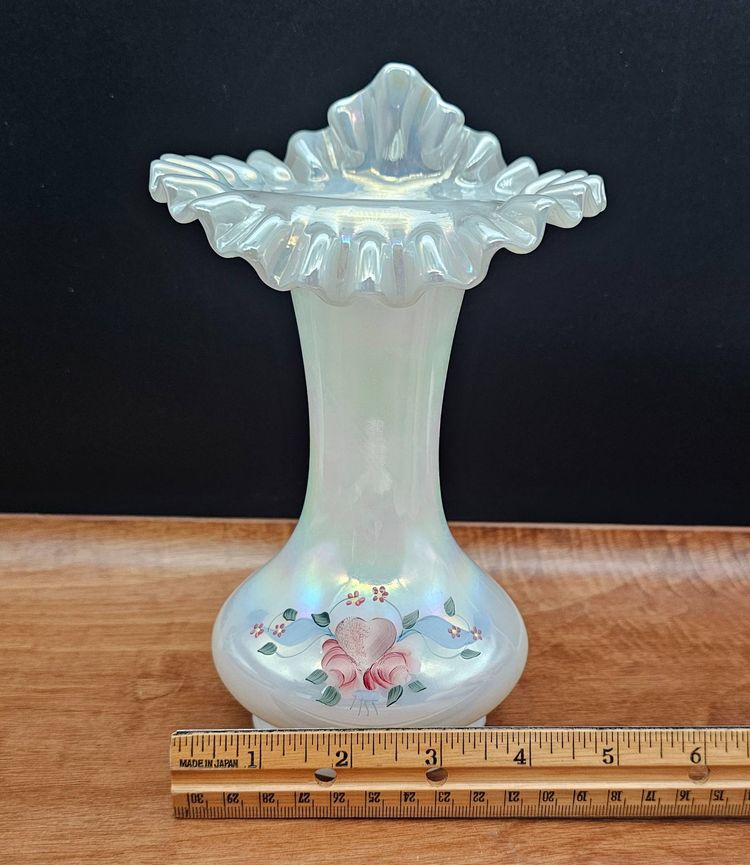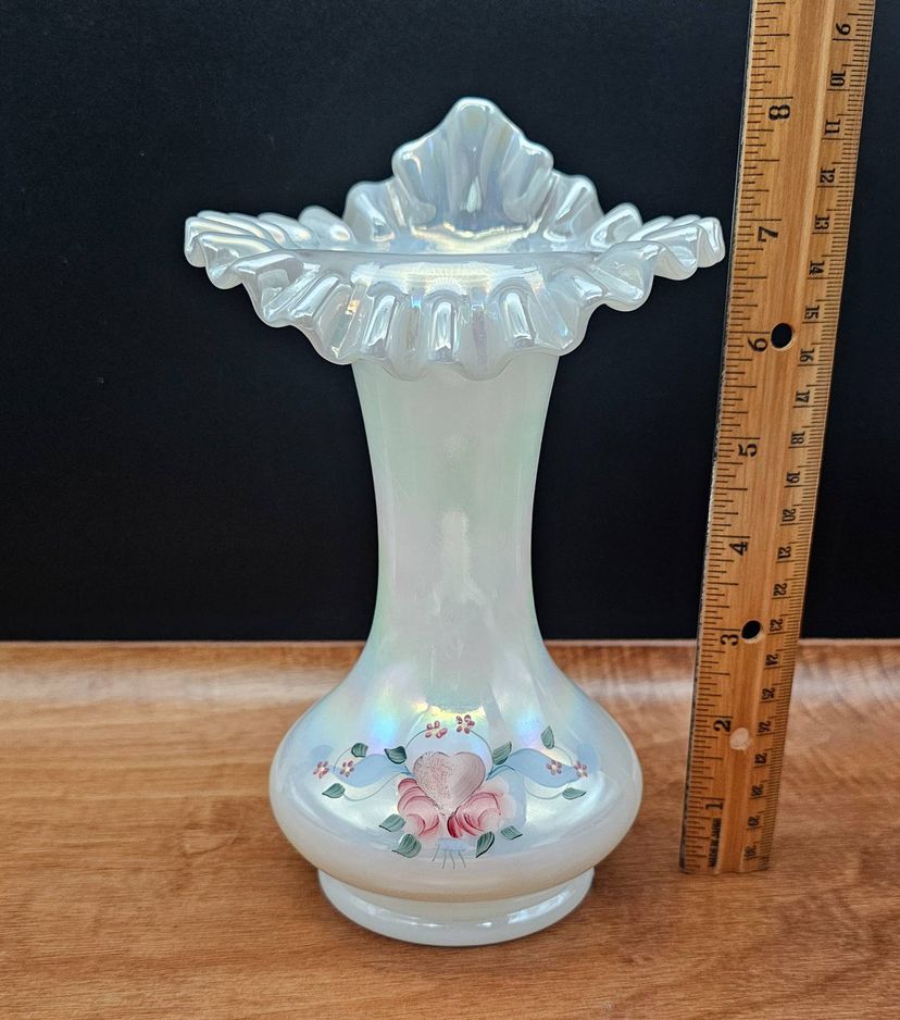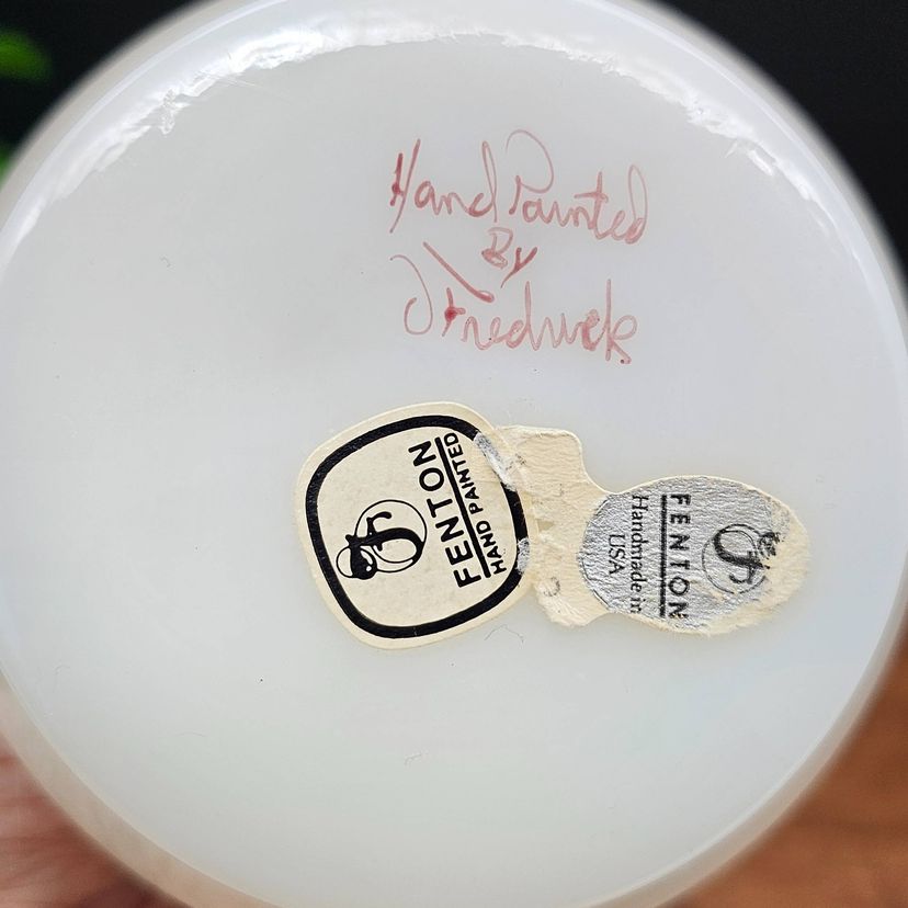 Beautiful pre-owned, used condition with no chips or cracks. Artist signed D. Fredrick. It does have two Fenton stickers on the bottom. Measures about 5" wide x 8" tall.