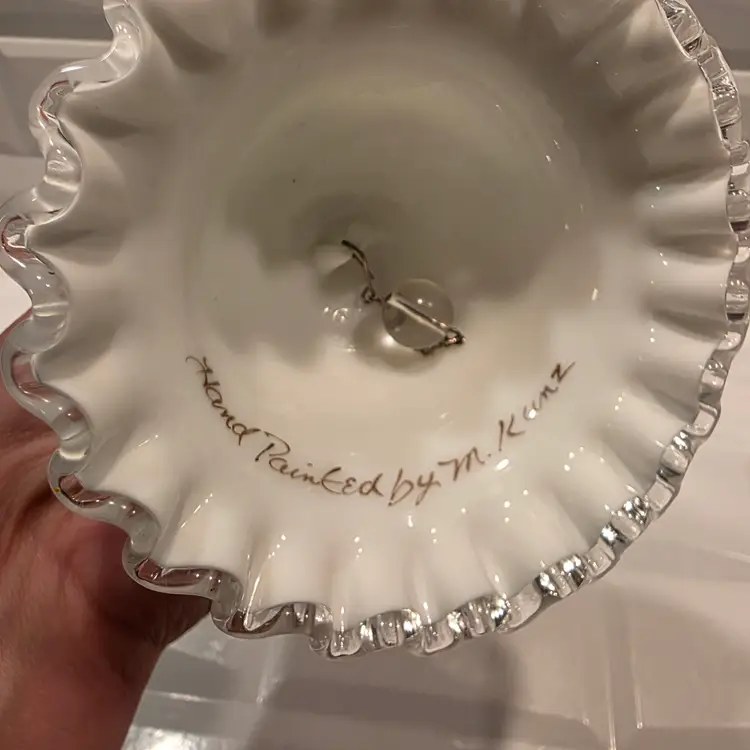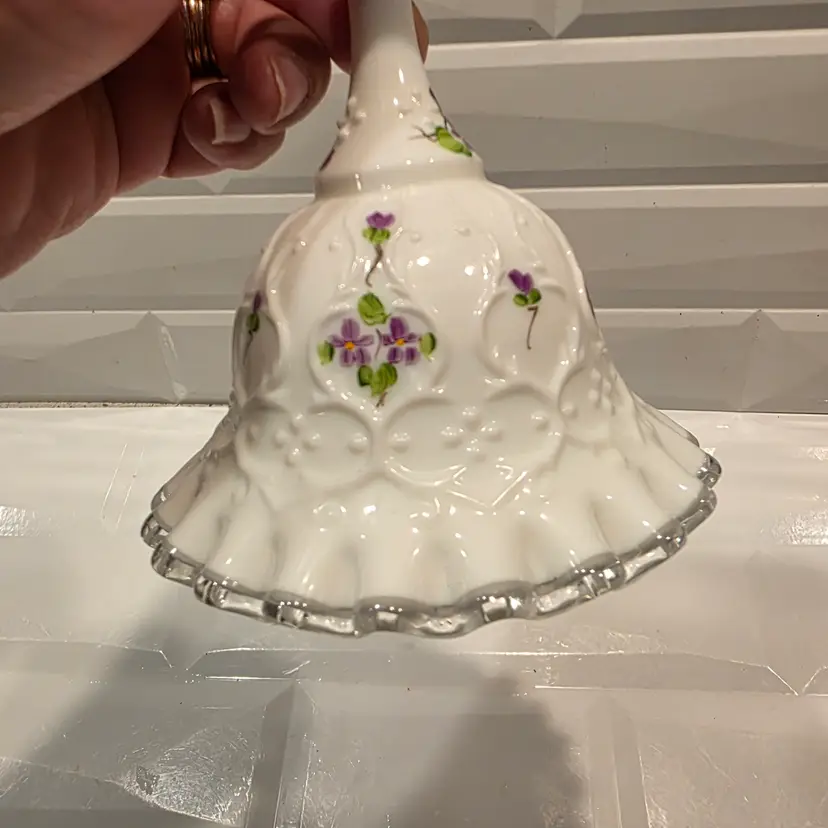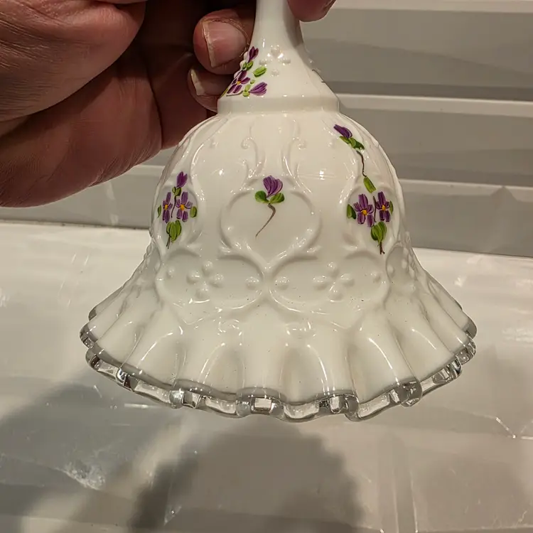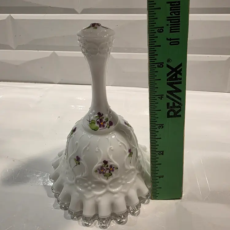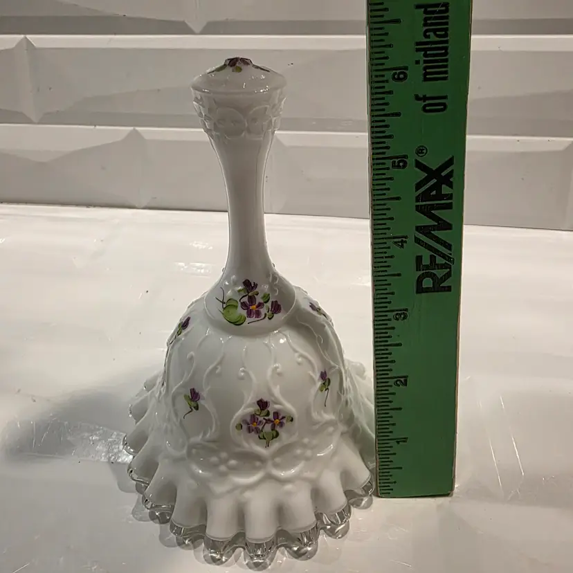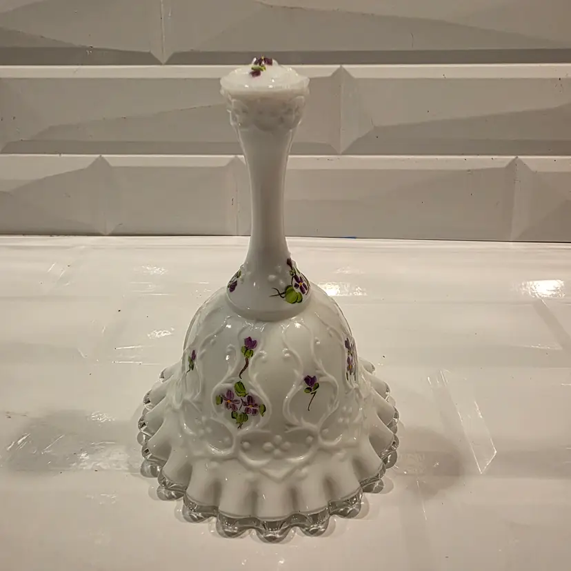 Vintage Fenton Milk Glass Ruffled Edge Violets in Snow Signed M Kunz Handpainted Bell