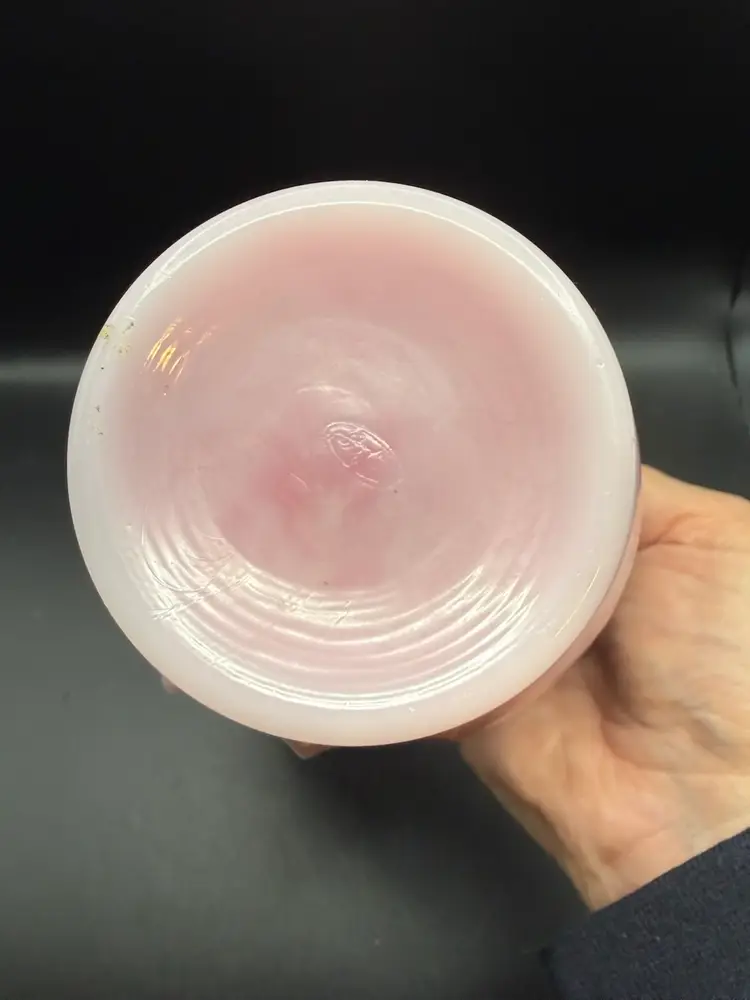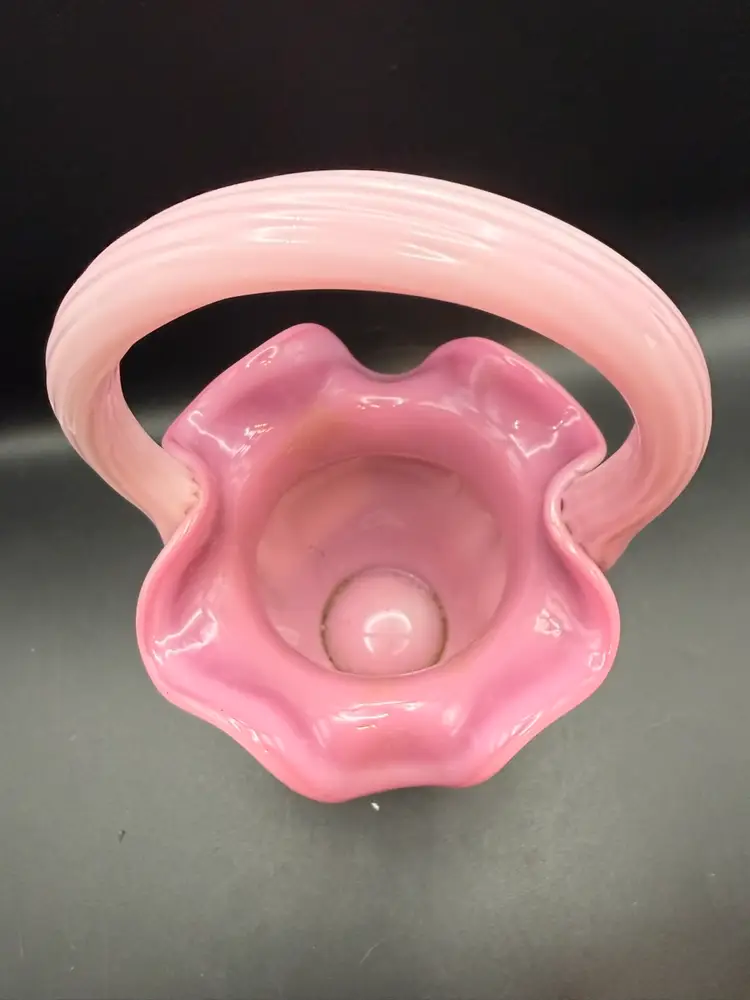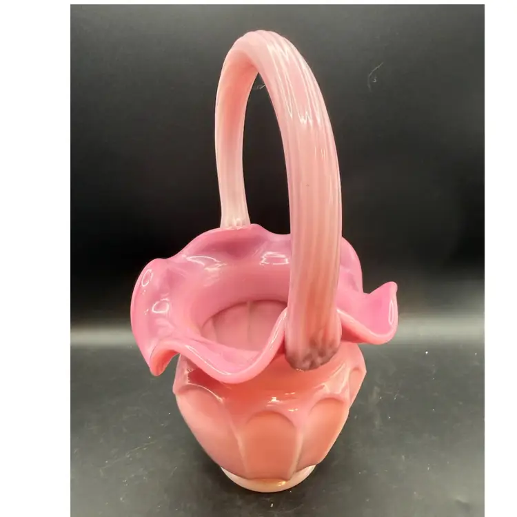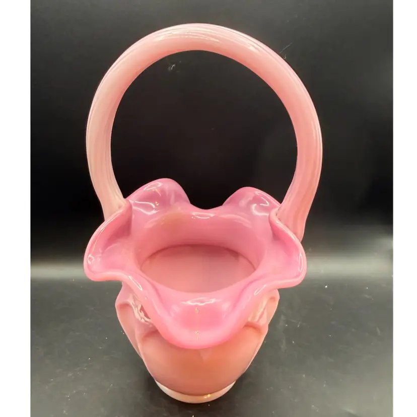 Fenton Art Glass Company, founded in 1905 in Martins Ferry, Ohio. Their "Rosalene" glass, a delicate pink opalescent hue, was particularly popular and is highly sought after by collectors. This particular basket showcases the classic Fenton style with its ruffled rim and graceful applied handle, characteristic of their handcrafted pieces. The opalescent quality of the glass, where white appears within the pink, is a hallmark of Fenton's artistry.