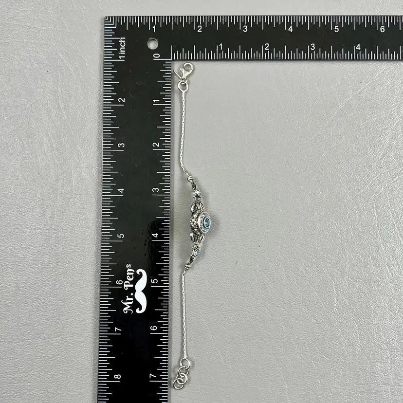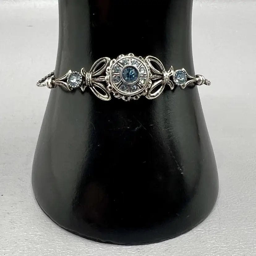 Vintage Filigree Dyamema Bronze Silver Tone Blue Rhinestones Bracelet 7" Intricate Jewelry Design