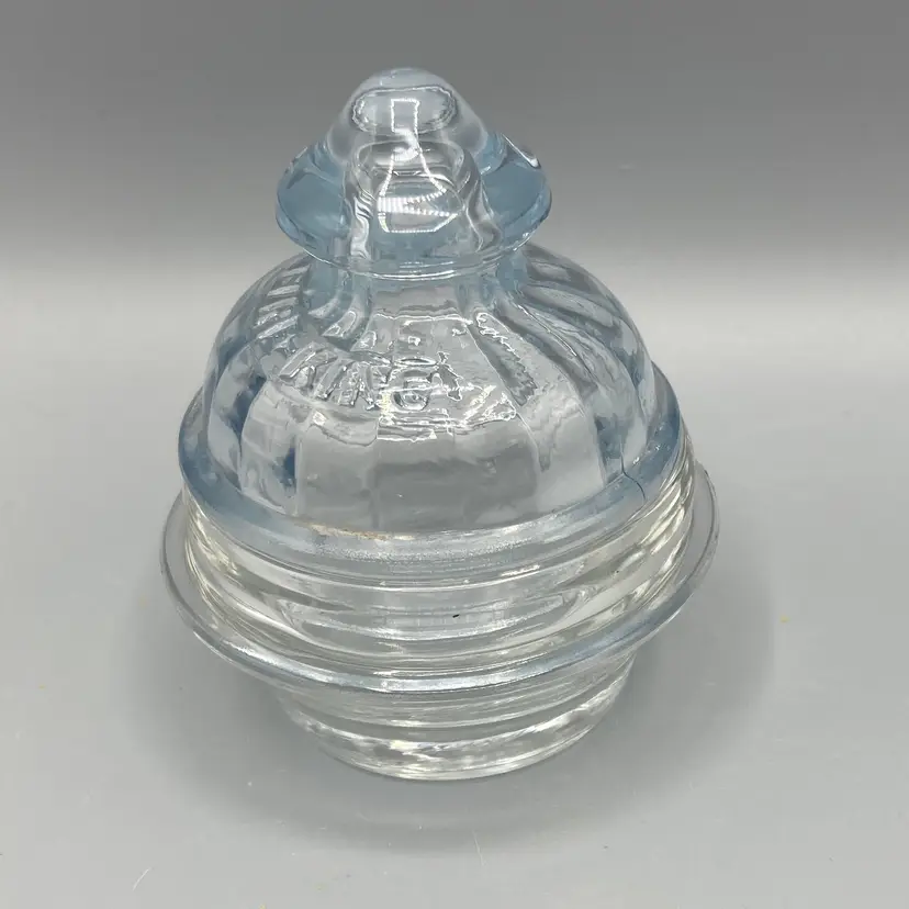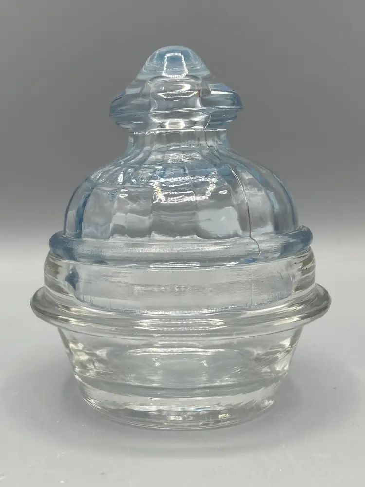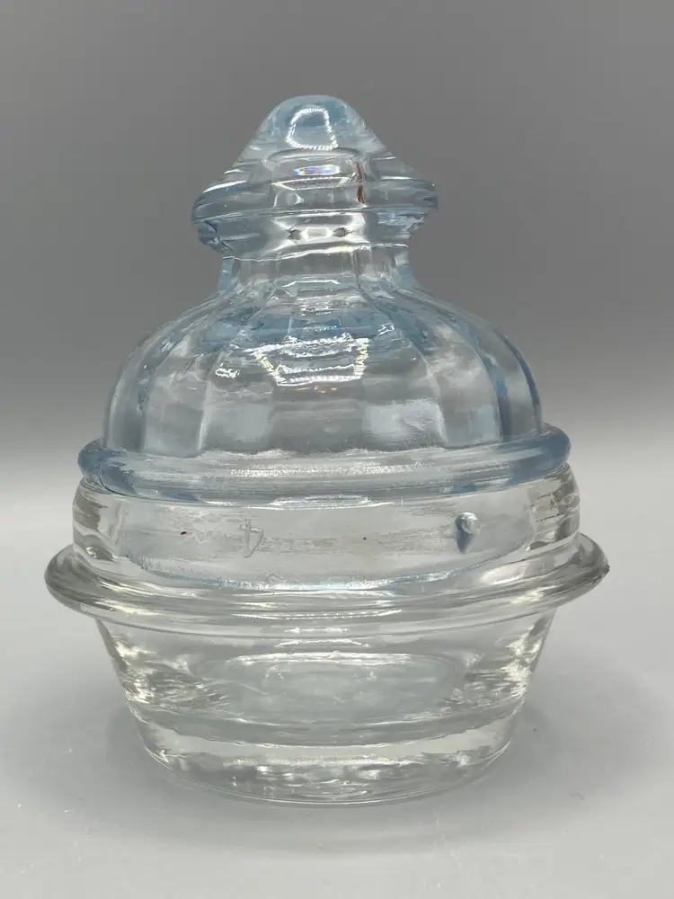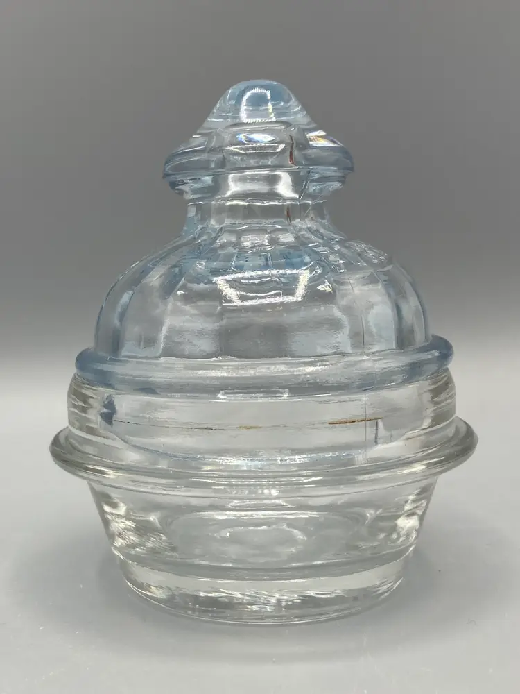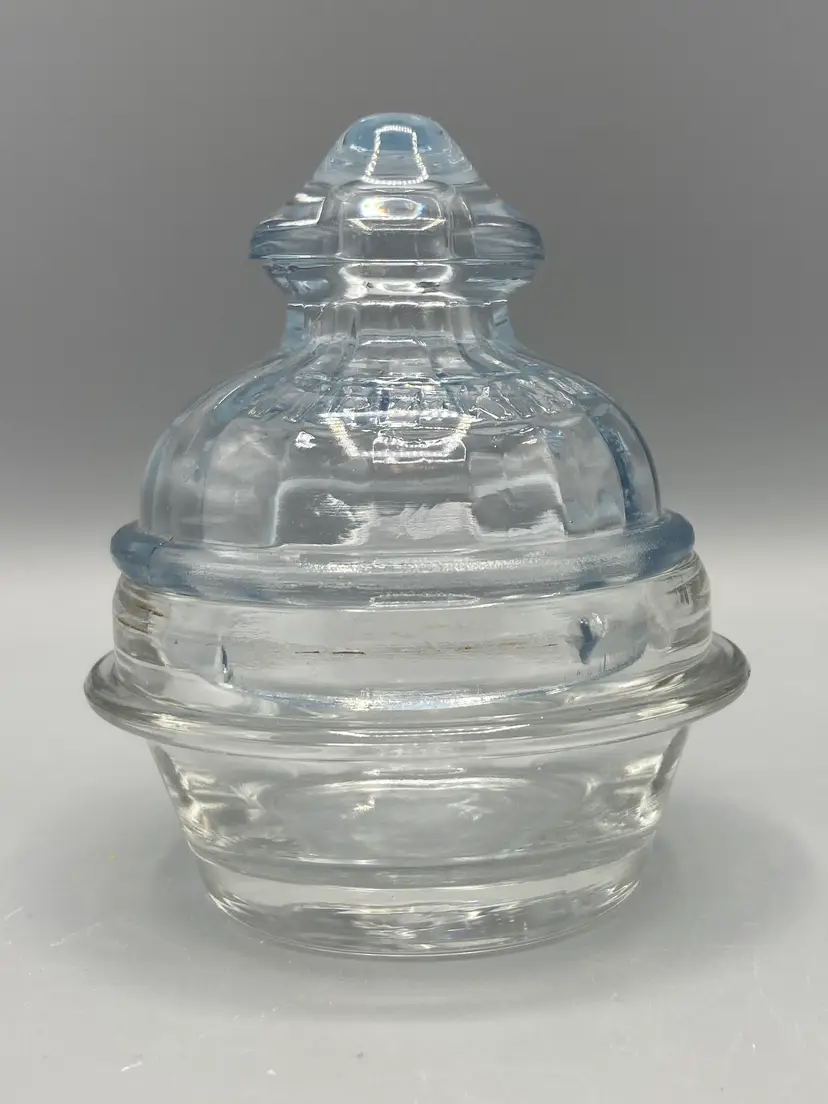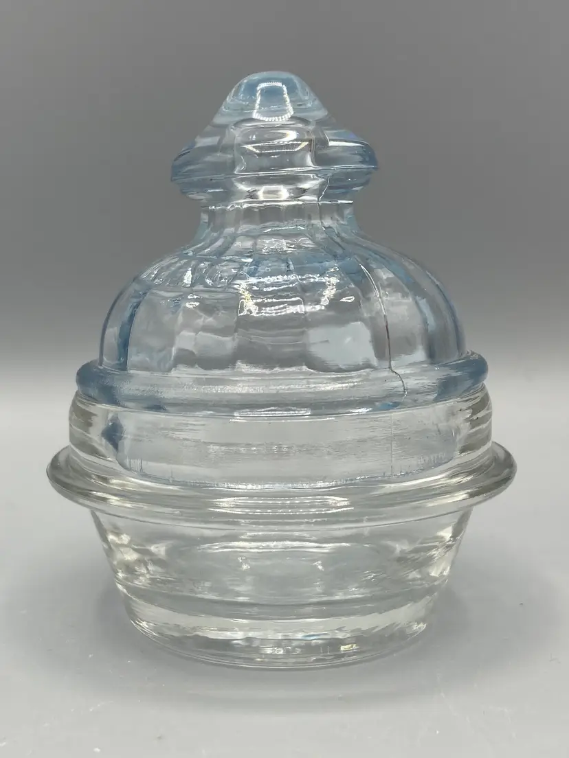 This piece is in good overall condition. The lid and bowl are slightly different in color, but they still fit well together. Could be used as a covered salt bowl. It measures approximately 3" tall x 2 3/4" across.