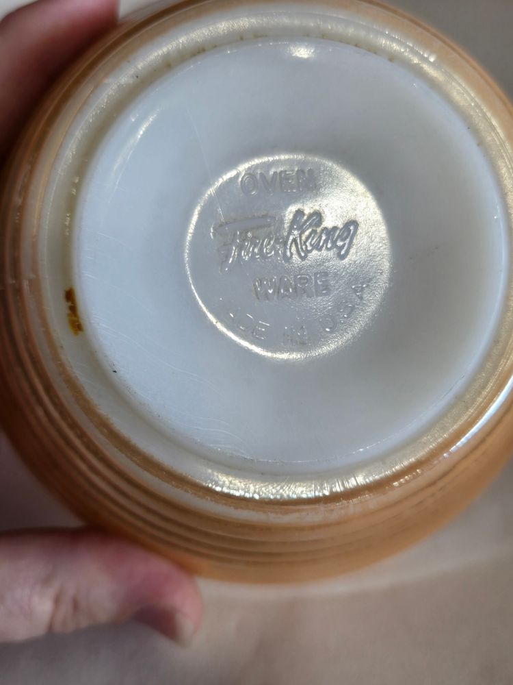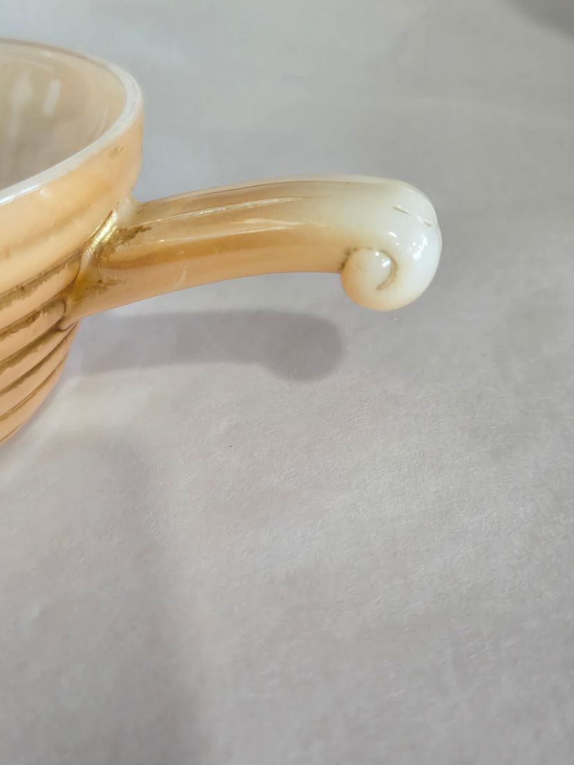 This Vintage Fire King Peach Luster Beehive Handle Soup Bowl showcases charming mid-century craftsmanship with its distinctive beehive handle and warm peach luster finish. While it bears scratches and worn paint consistent with its age, these signs of use add to its authentic vintage character. Ideal for collectors or those seeking nostalgic kitchenware, this bowl combines functionality with collectible appeal.