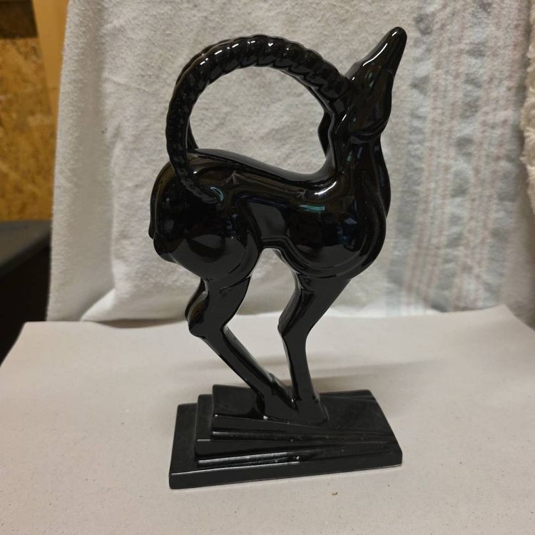 This Vintage Fitz and Floyd Black Antelope Bookend Statue is a medium-sized ceramic sculpture featuring a detailed antelope design. This mid century modern style piece has a glossy finish and a 3D effect, making it an eye-catching collectible for any room. Signed by the brand Fitz & Floyd, this original statue from the late 20th century is perfect for animal lovers and collectors of decorative sculptures. Made in Japan, this vintage bookend statue is a unique addition to any home decor or animal collection.