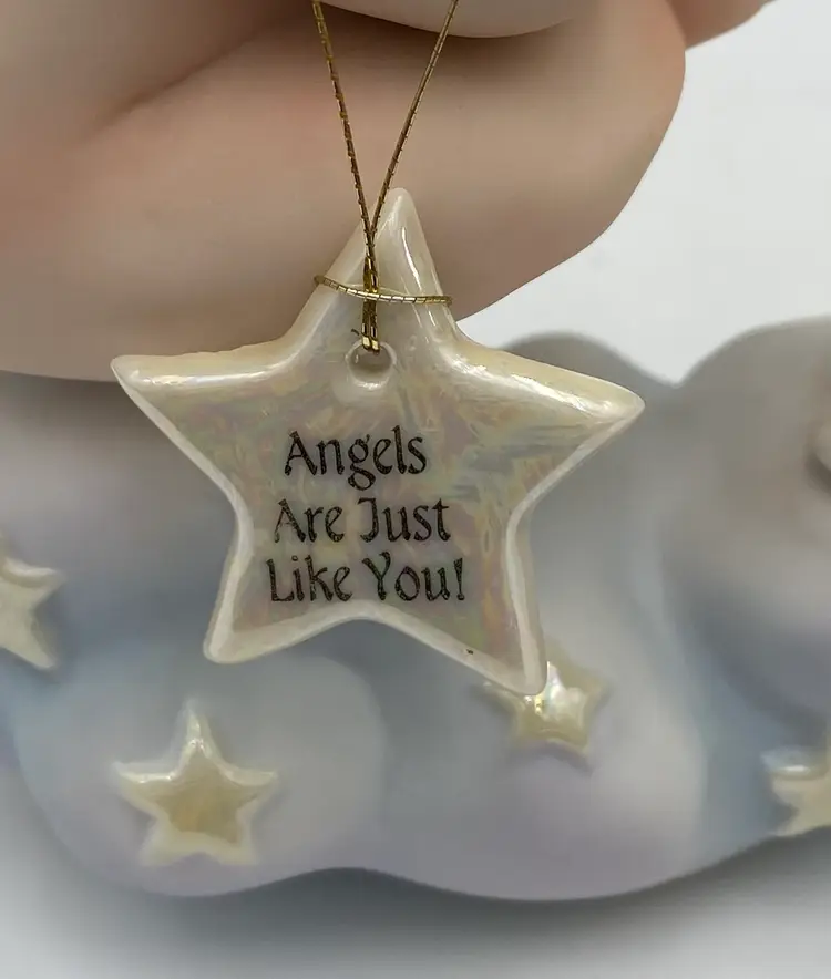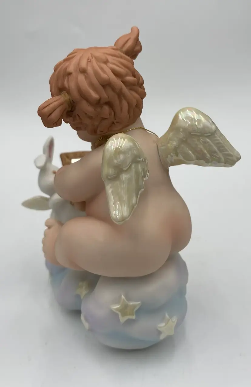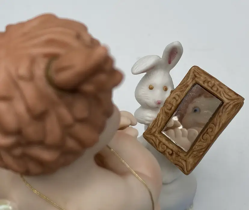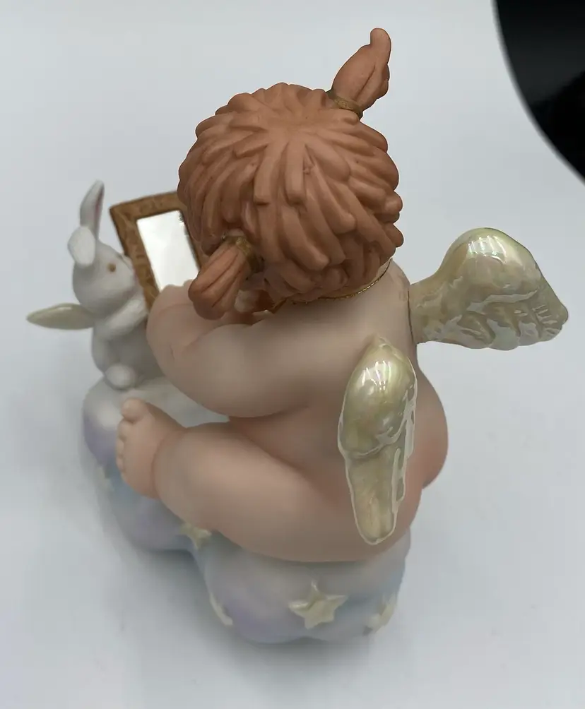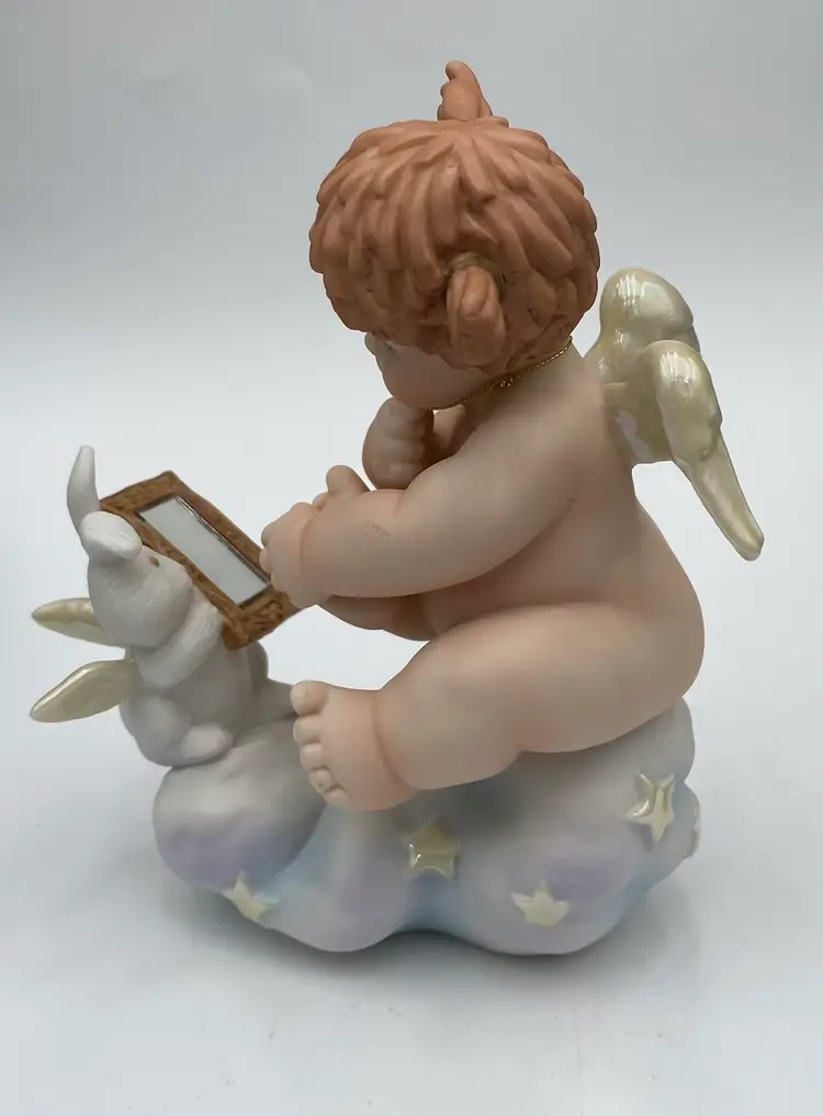 The vintage Fitz & Floyd figurine from their Little Miracles line features a little girl angel with wings looking into a Mirror held by a bunny angel. The Star that hangs from her necks says, "Angels Are Just Like You". This figurine is made of porcelain and measures 4.3 inches in length,5.25 inches in height, and 2.4 inches in width. The angel and bunny sit on a puffy blue cloud with iridescent stars and the wings on both are also iridescent. The hanging star is removable by pulling it over the head of the angel, or it can be repositioned as desired. This piece was made in 1994 and has the line information printed on the underside.