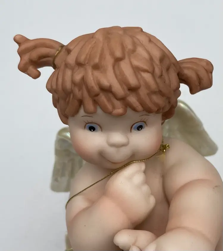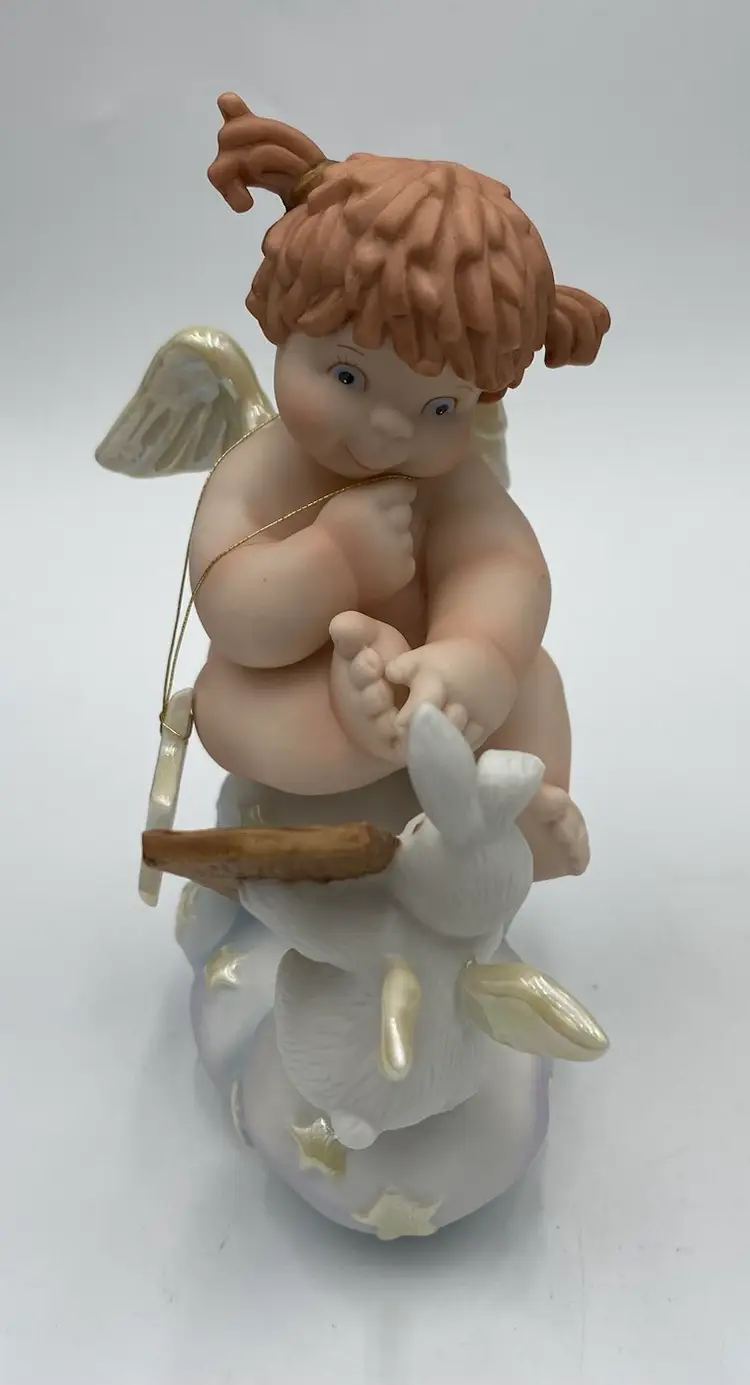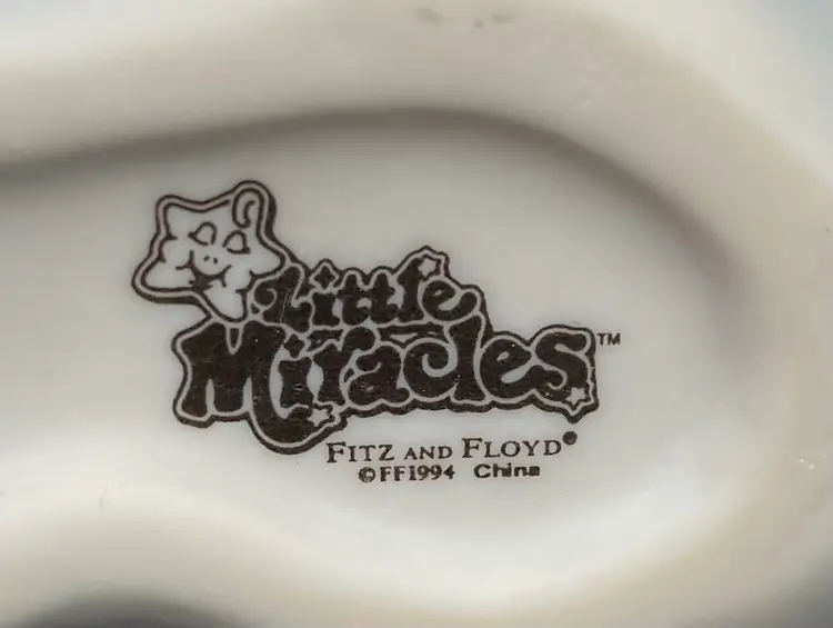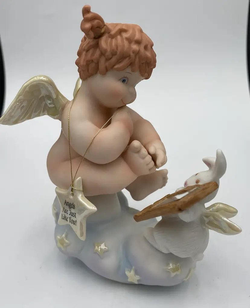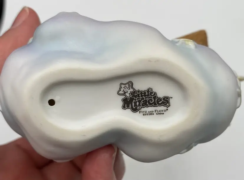 The vintage Fitz & Floyd figurine from their Little Miracles line features a little girl angel with wings looking into a Mirror held by a bunny angel. The Star that hangs from her necks says, "Angels Are Just Like You". This figurine is made of porcelain and measures 4.3 inches in length,5.25 inches in height, and 2.4 inches in width. The angel and bunny sit on a puffy blue cloud with iridescent stars and the wings on both are also iridescent. The hanging star is removable by pulling it over the head of the angel, or it can be repositioned as desired. This piece was made in 1994 and has the line information printed on the underside.