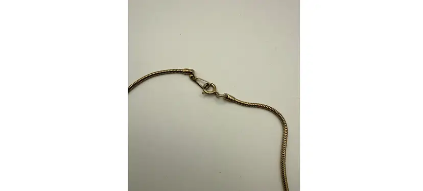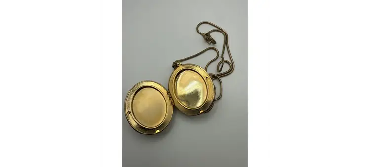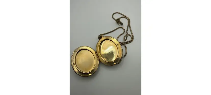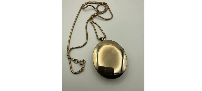 ITEM SPECIFICS Base color: Gold tone (untested costume jewelry) Maker’s Mark?: no Condition: Pre-owned/used fair condition. Some cracking/peeling present on the front of the piece. May need cleaning. Chain Length: 24 inches Extender?: No Weight: 1.7 ounces Pendant?: Yes, locket Height: 2.25 inches Width: 1.5 inches Depth: .5 inches