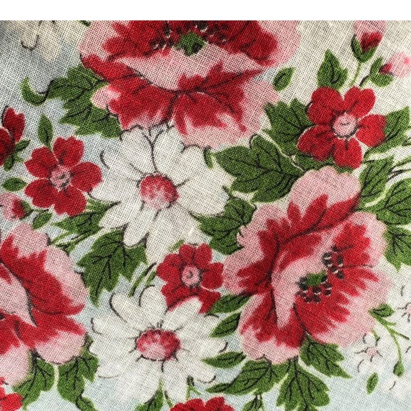 Vintage fine cotton handkerchief. Features a pale blue border, white center, with red, pink, and white flowers and greenery. Small pulls at 2 corners. Very good condition. 11 ¼ x 11 ¼”