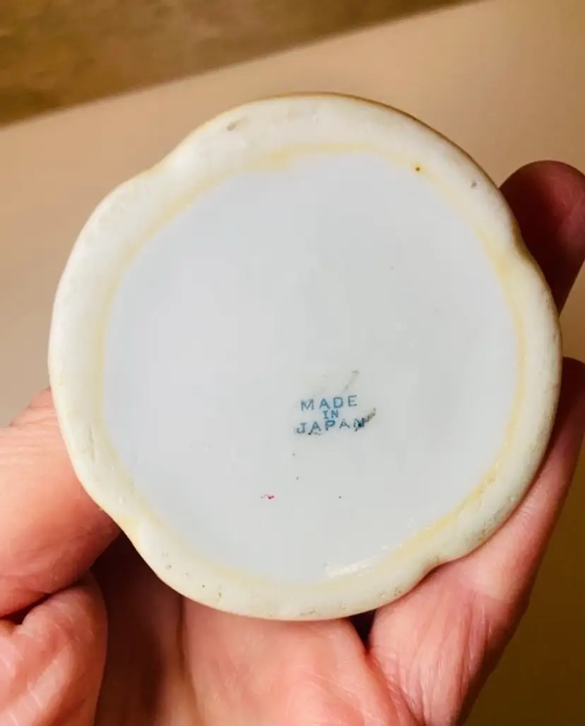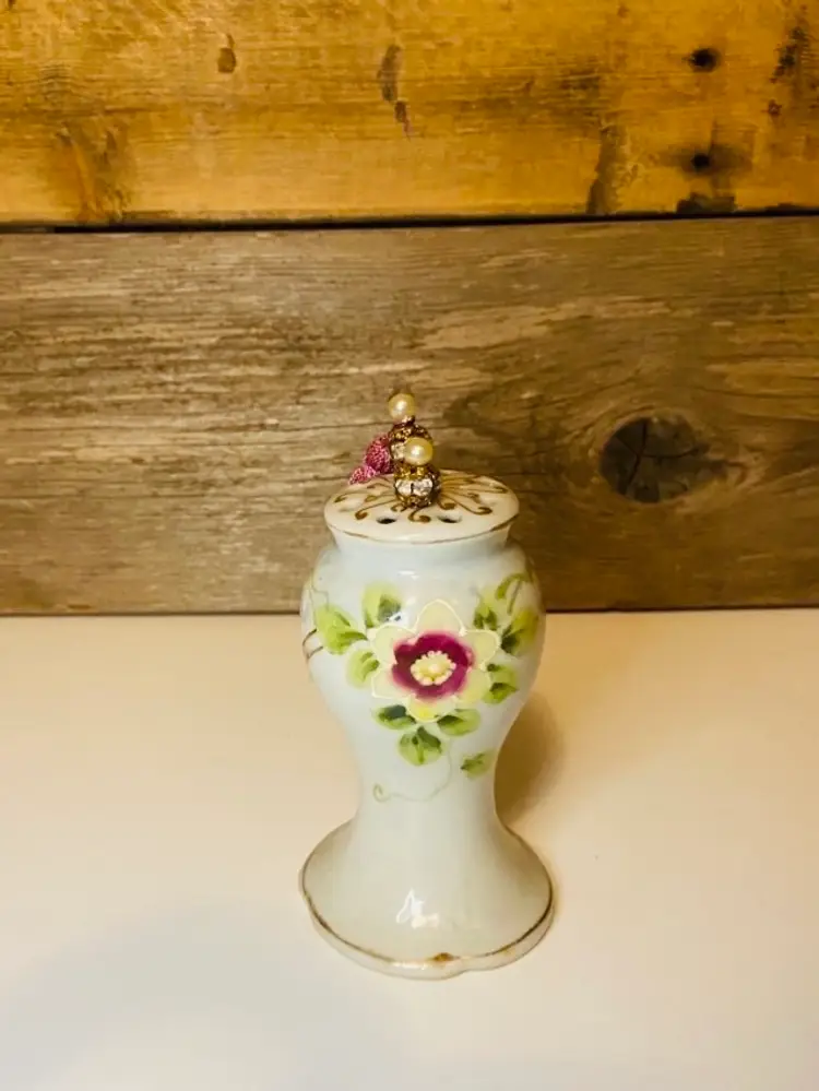 Charming vintage ceramic hatpin holder featuring a delicate floral design and 13 evenly spaced holes, originally made to organize hatpins and stickpins on a dresser or vanity. Finished in a glossy glaze, this piece showcases classic floral decoration that adds soft, feminine character to any space. Includes 2 hat pins. In good used condition. No chips or cracks.