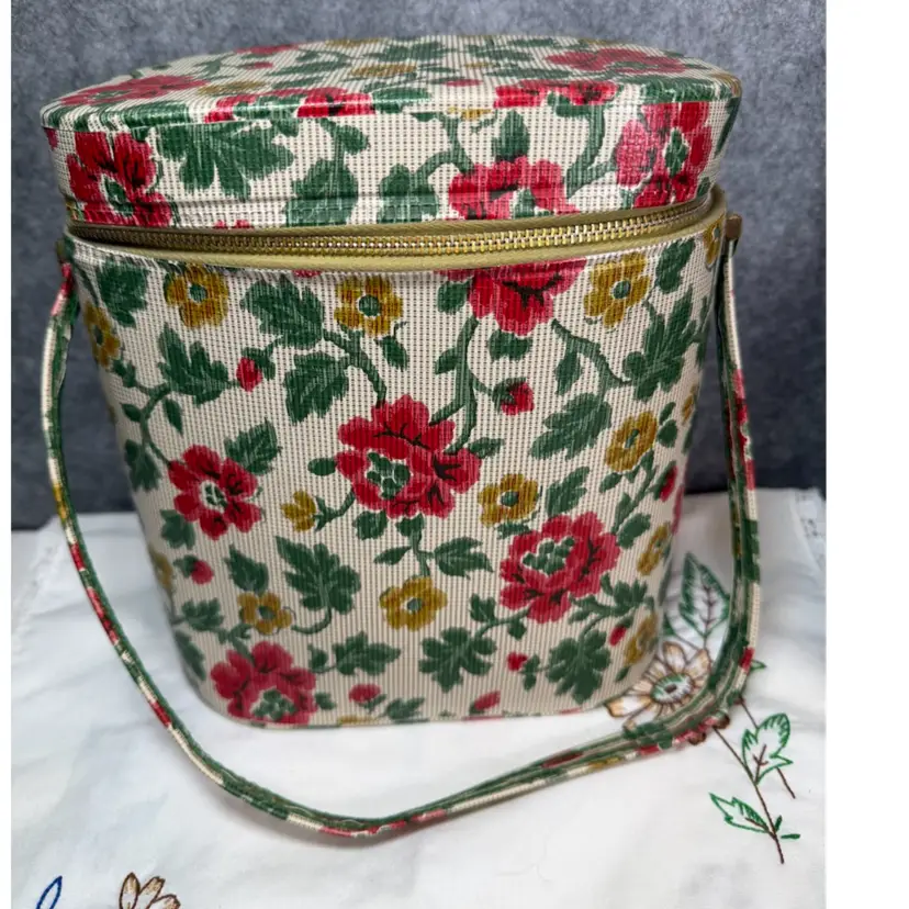 🧺 Details • Brand: Thermos • Era: Approx. 1960s–1970s • Includes: Insulated lunch tote + matching thermos with cup lid • Materials: Vinyl/fabric exterior, insulated interior, plastic thermos cap • Closure: Metal zipper on carrier • Pattern: Retro floral red, yellow & green