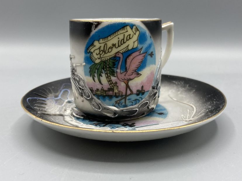 This cup and saucer set is overall good condition. There are some wear, scratches, and paint loss here and there. Please see pictures for specific details. The cup measures approximately 2 1/4" across including the handle. Without the handle, the cup opening is approximately 1 3/4" wide and 1 3/4" tall. The saucer measures approximately 4" across.