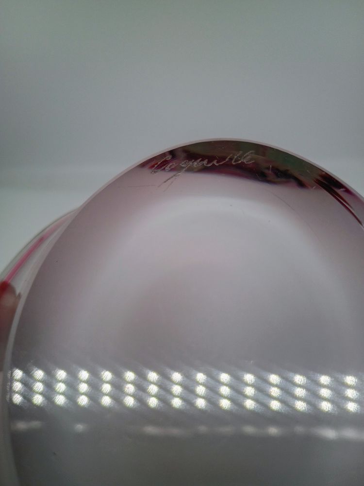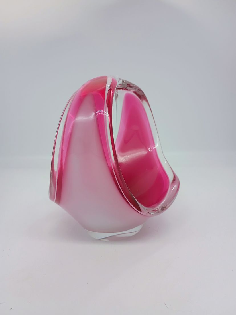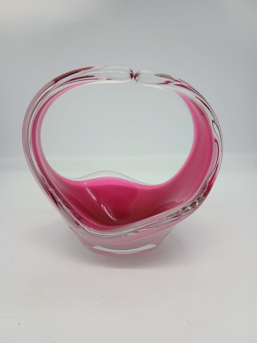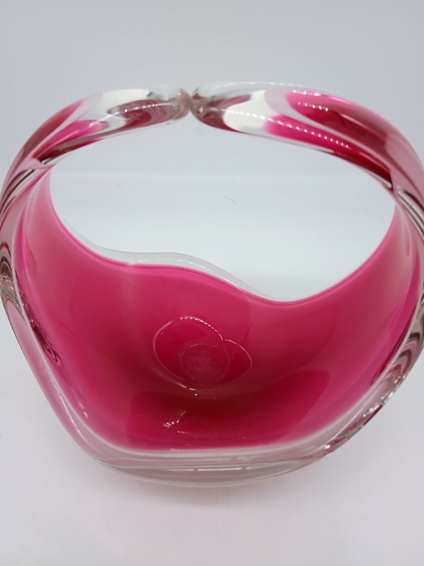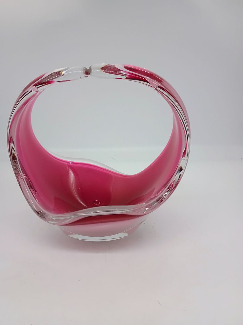 Vintage Flygsfors Coquill Sweden Signed Kedelv Hand Blown Art Glass Basket Vase Candy Dish Dated 1961. This is 7 inches tall and roughly 8 inches long and 5 inches wide. This is in Near Mint condition No chips cracks or flea bite, Base is clear and polished to high shine. Etched with date brand and signature.