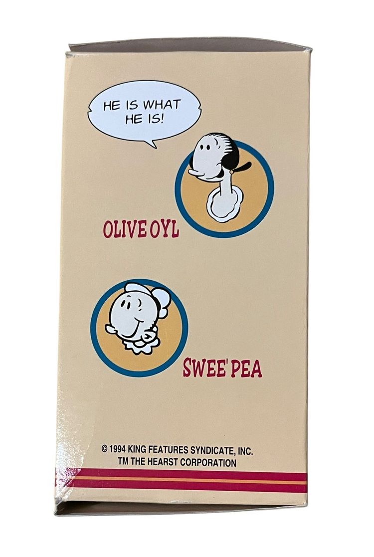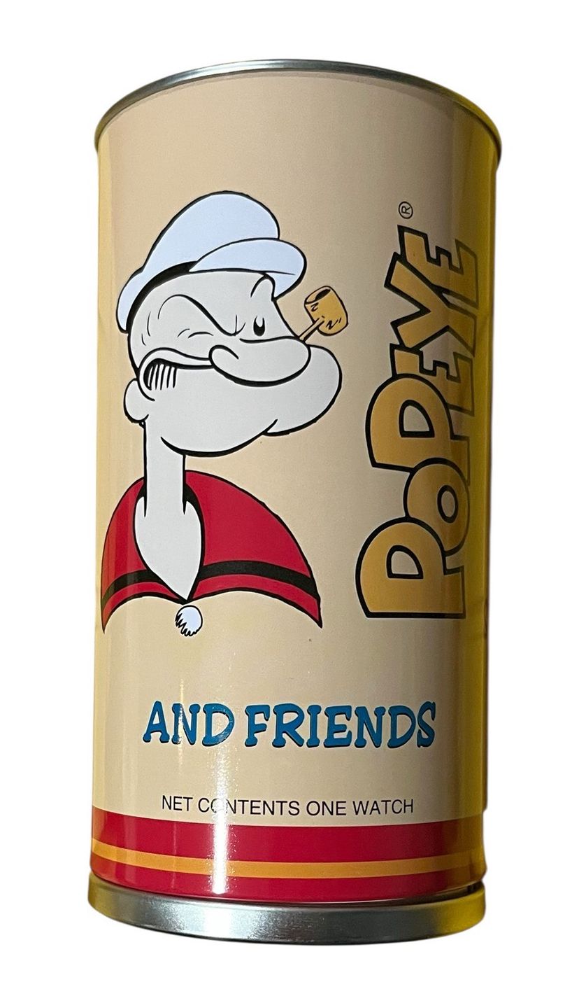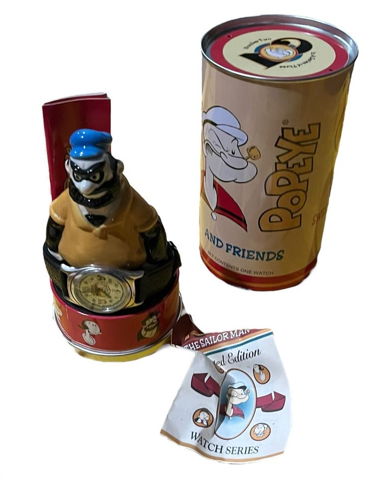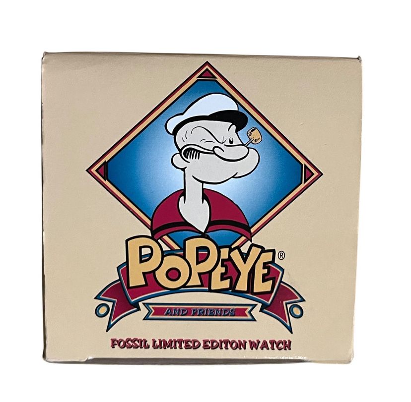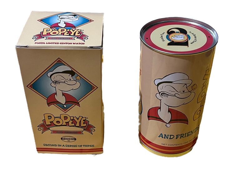 The box contains a tin, which has inside a porcelain Brutus figure which is holding the fossil popeye watch.