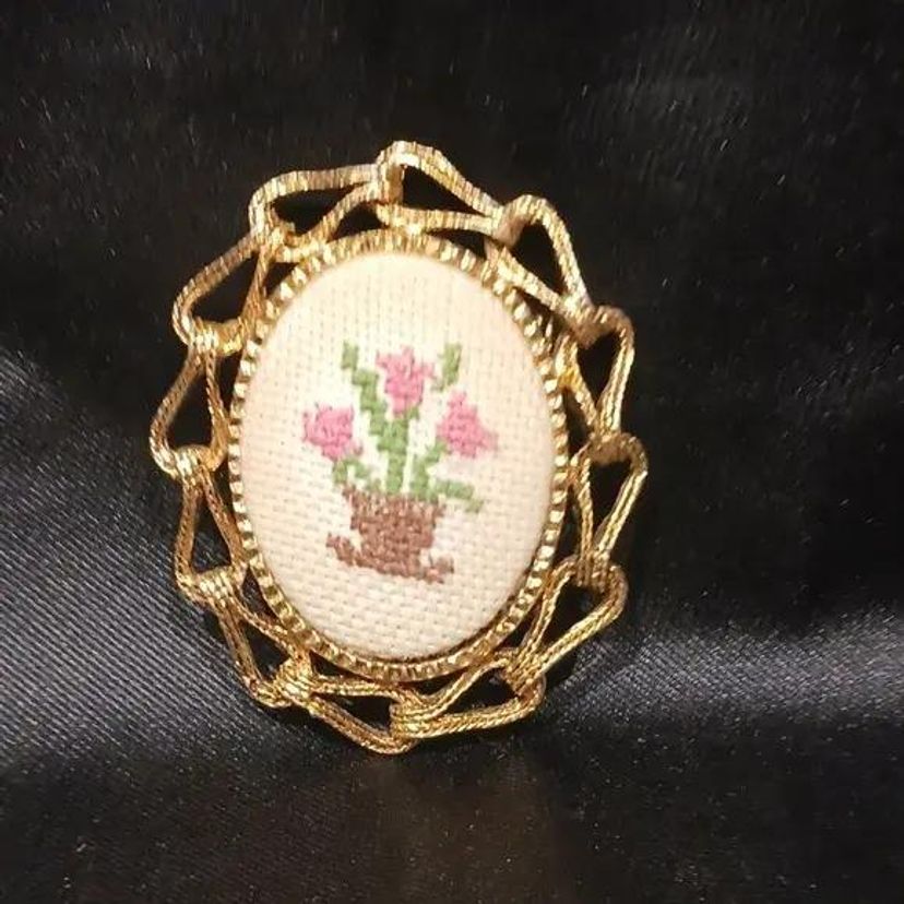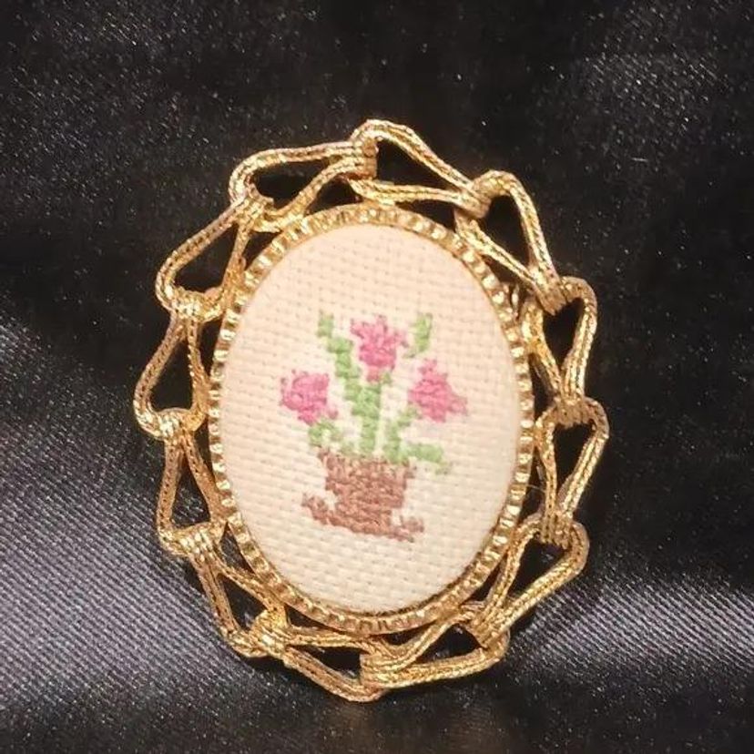 Vintage Framed 2.5in. Floral Needlepoint Brooch Pendant, Gold Tone Frame. Pre-owned, Very good condition.
