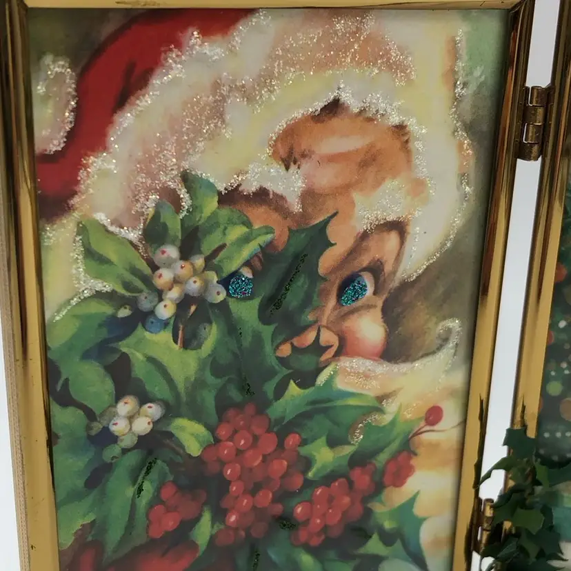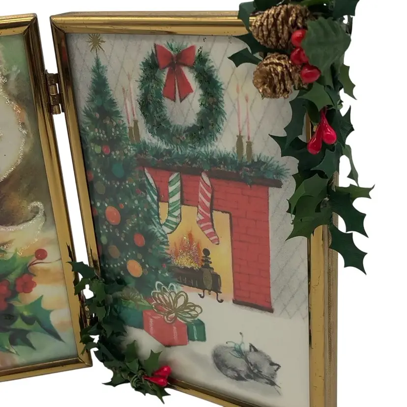 Vintage Framed Christmas Cards - Santa Peeking & Kitty by the Fireplace