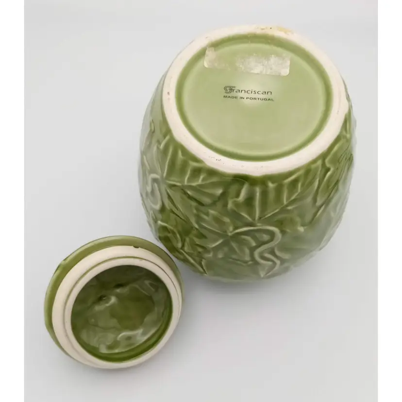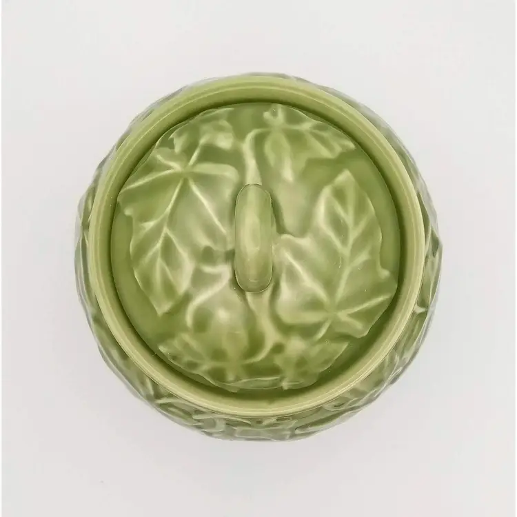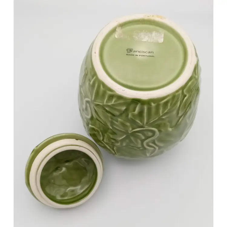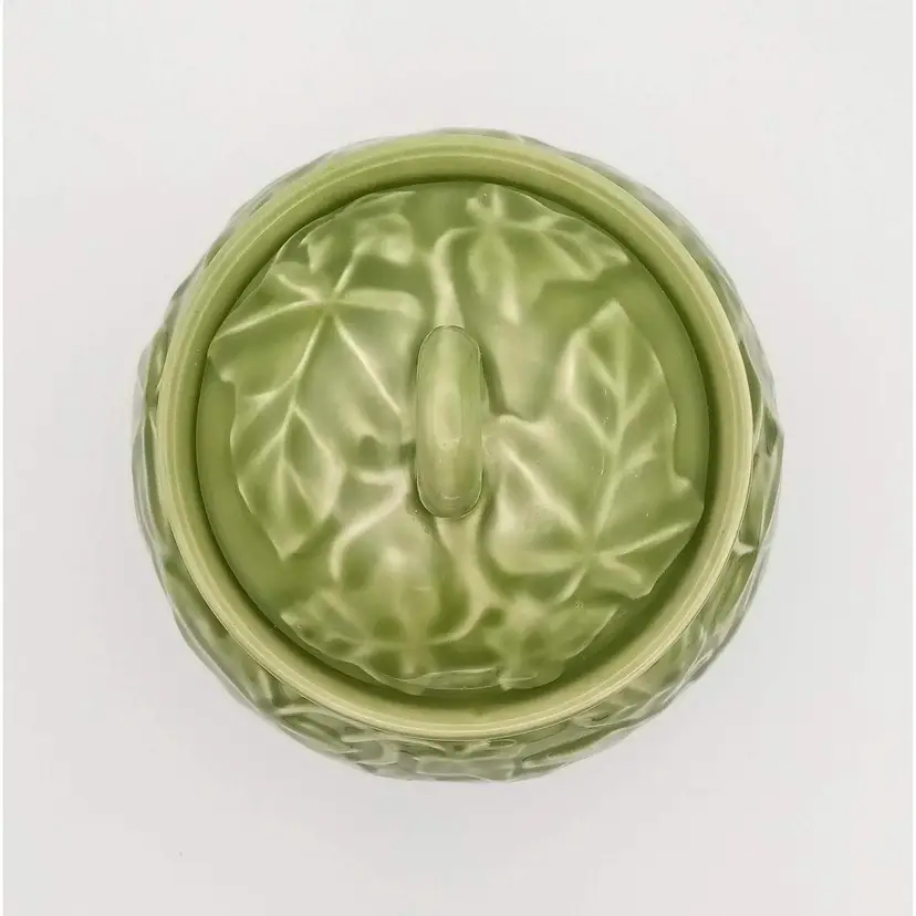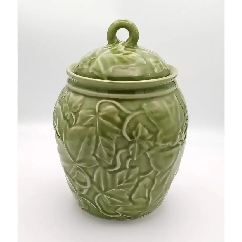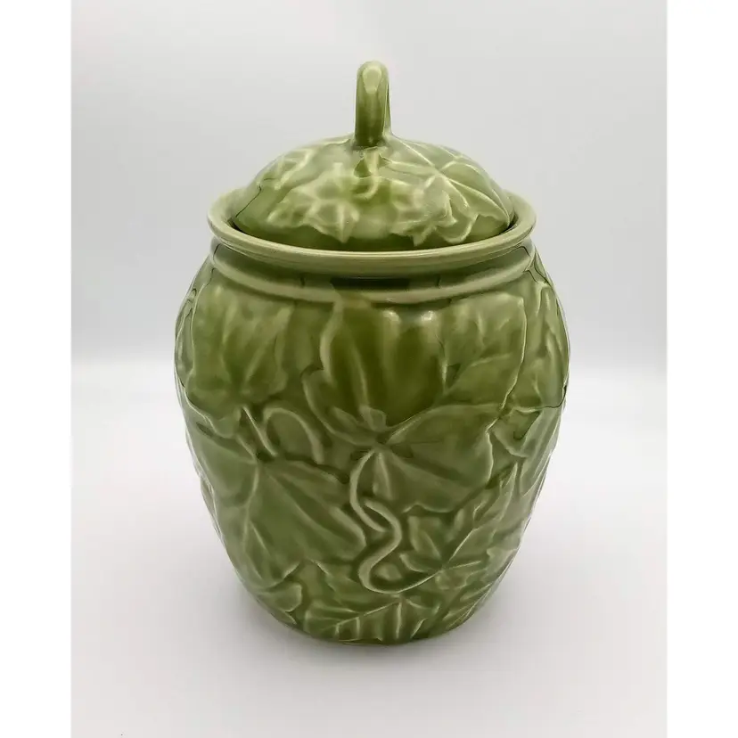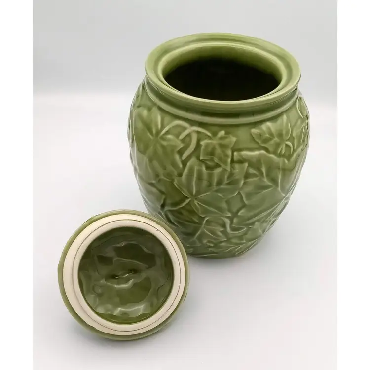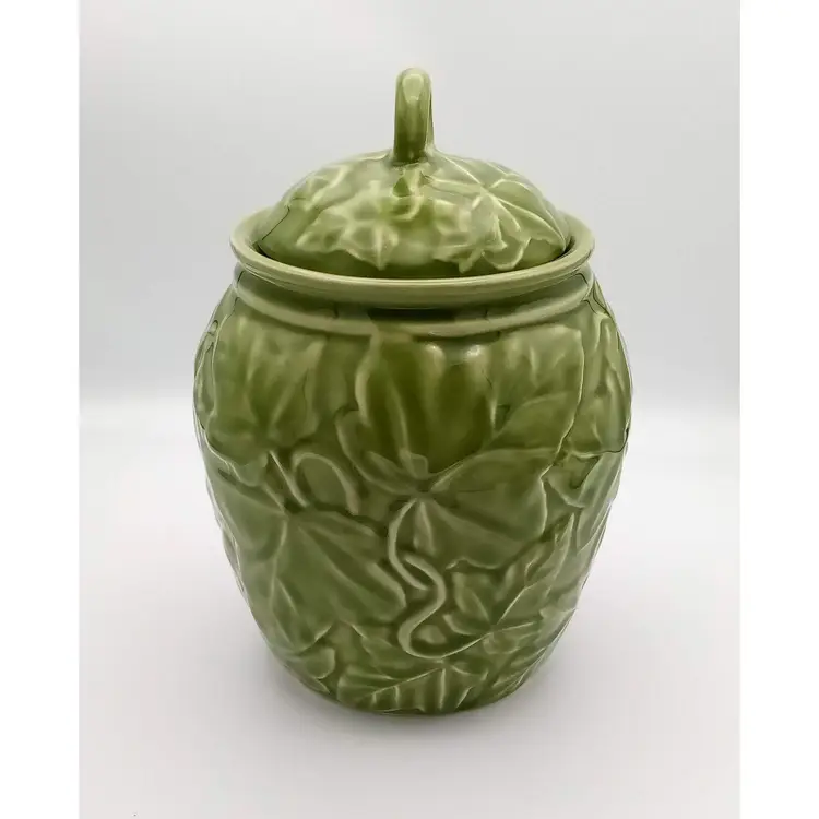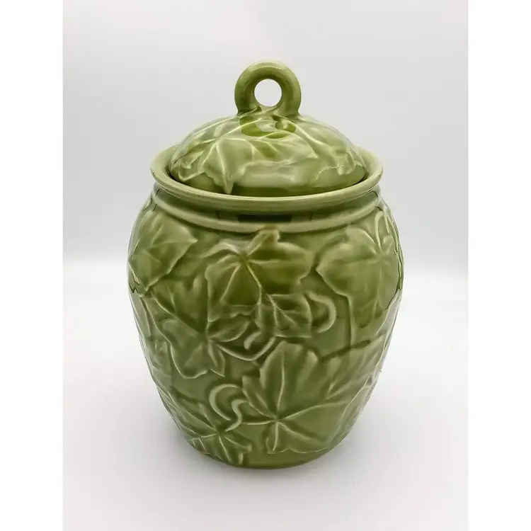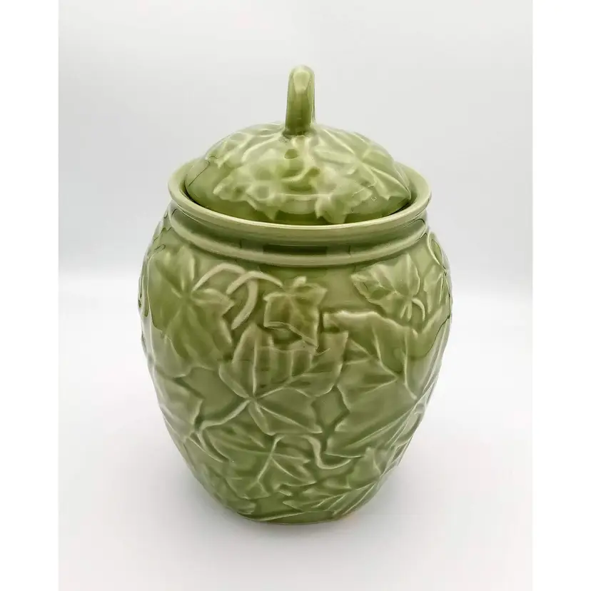 This vintage jar from the 1990's is in excellent pre-owned condition. There are no chips or cracks and the gasket is still present on the lid. It stands approx 8" tall with the lid on and is about 5.5" wide at the widest point. The beautiful embossed ivy pattern is close to an avocado green. Thanks for looking!
