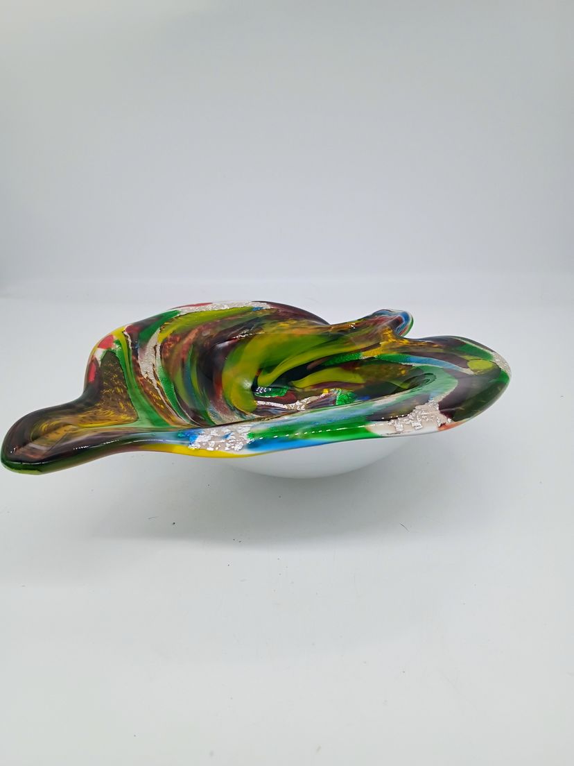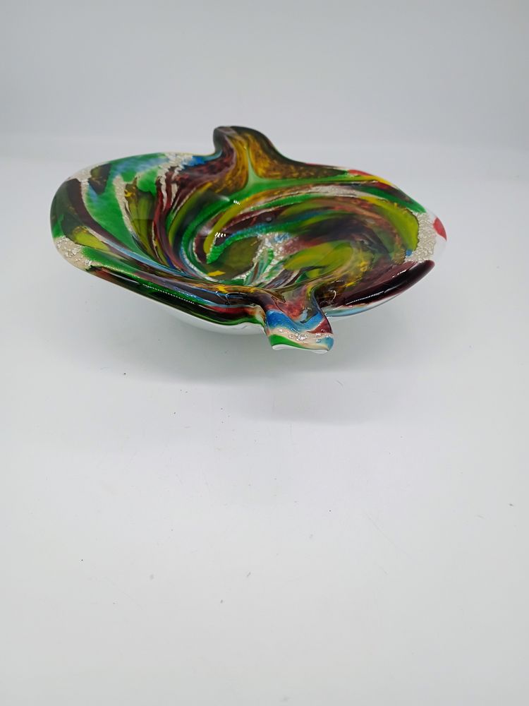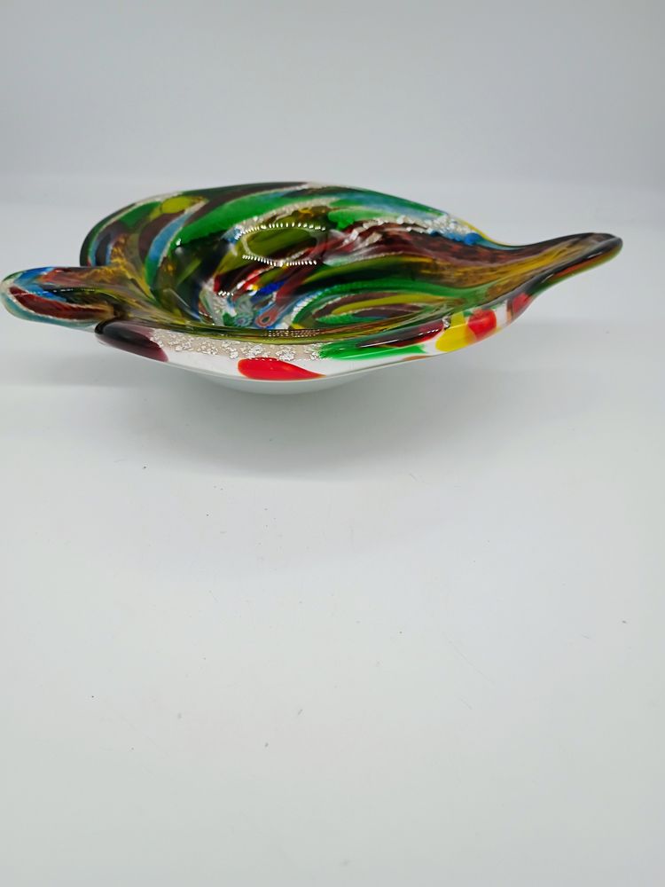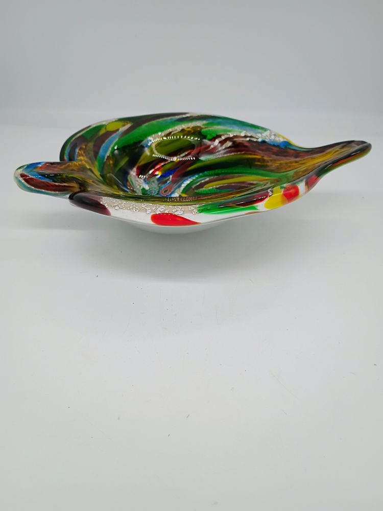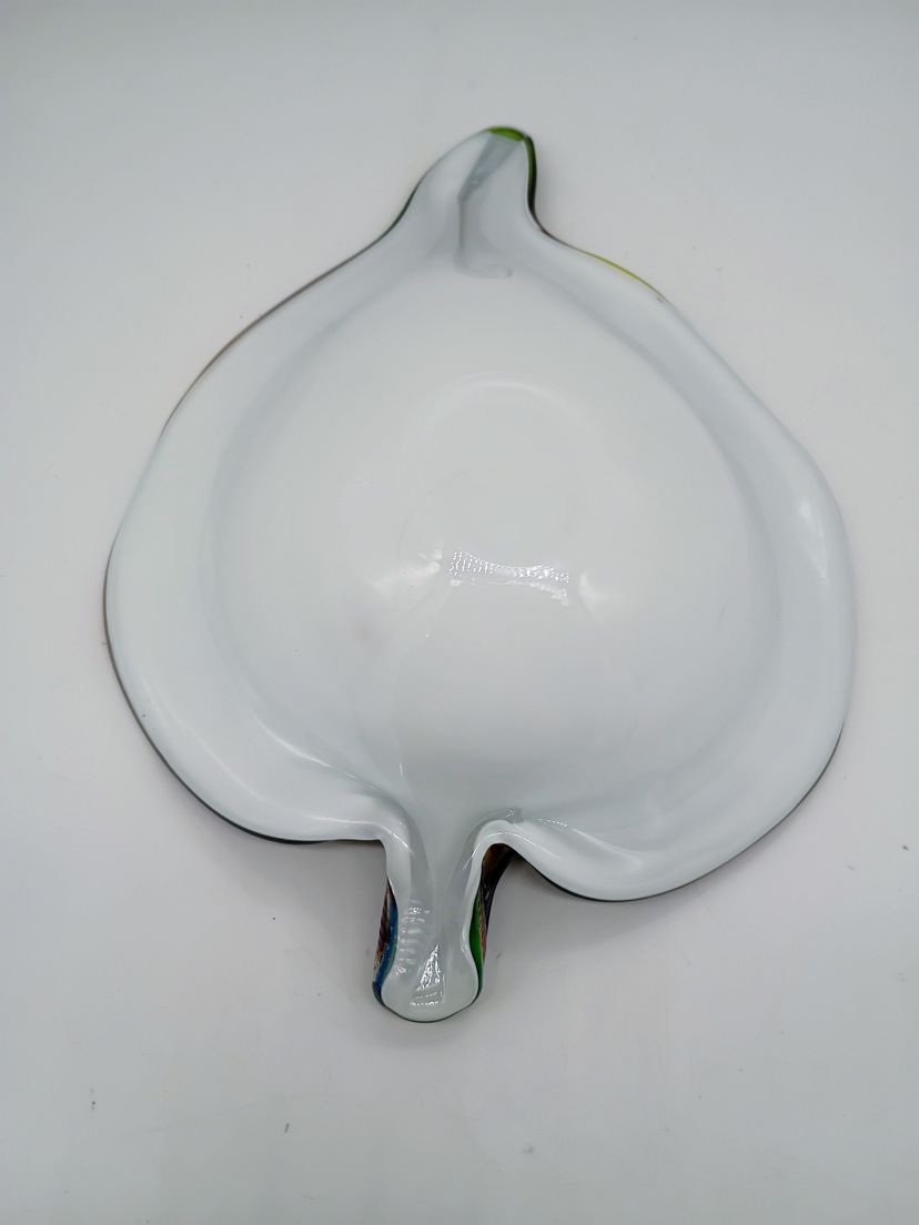 Vintage Fratelli Torso attributed Murano Multicolored Swirl Also Called Tutti Fruiti Art Glass Leaf Shaped Candy Dish 11 In long 9 inches wide and 3 inches tall. Solid heavy well made hand blown glass smooth clear circular pontil .This is preowned. It has no chips cracks or flea bites, Silver aventurine mixed into colors. Cased white Excellent used condition. This is attributed to Fratelli Torso thru research and multiple similar comps. Ships USPS domestically and UPS to Canada,