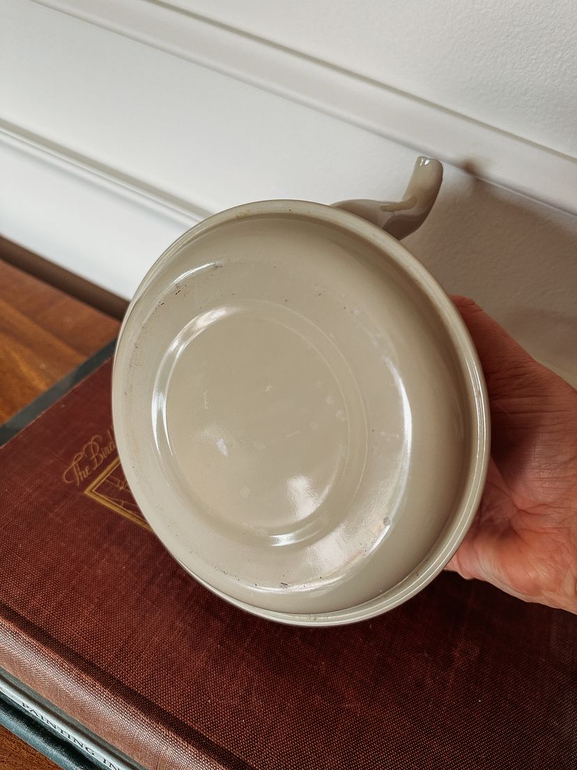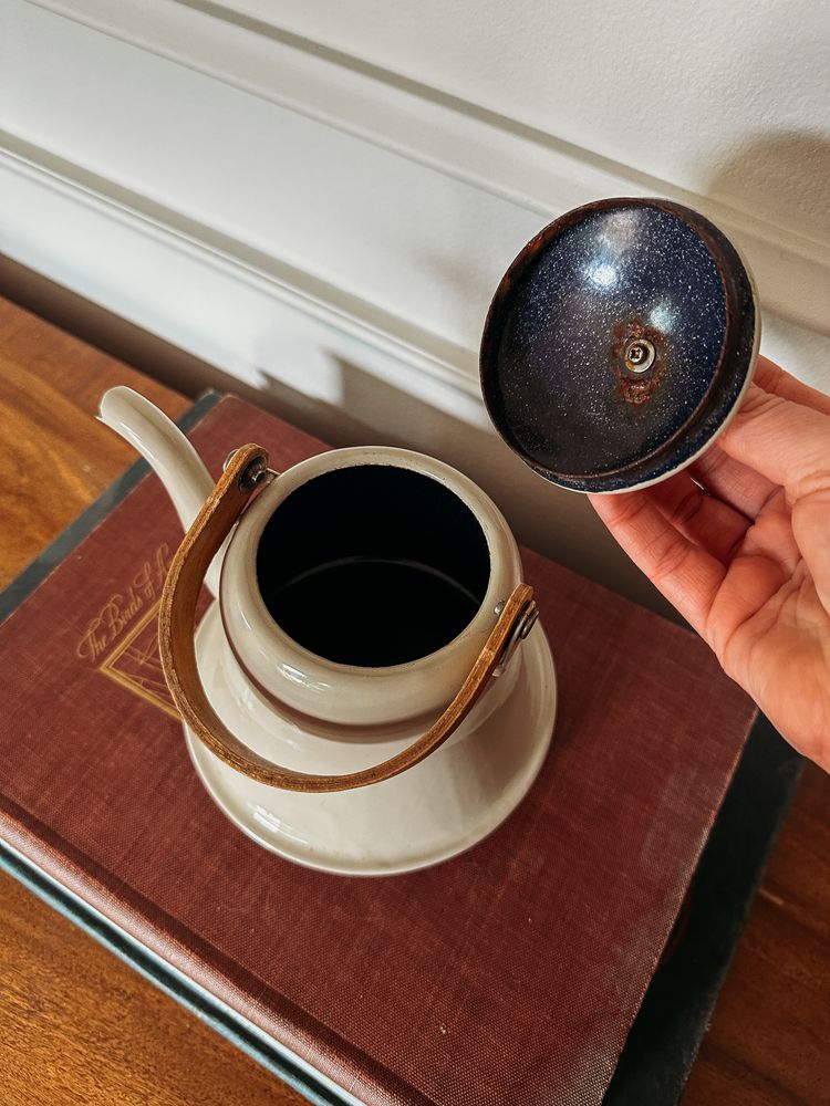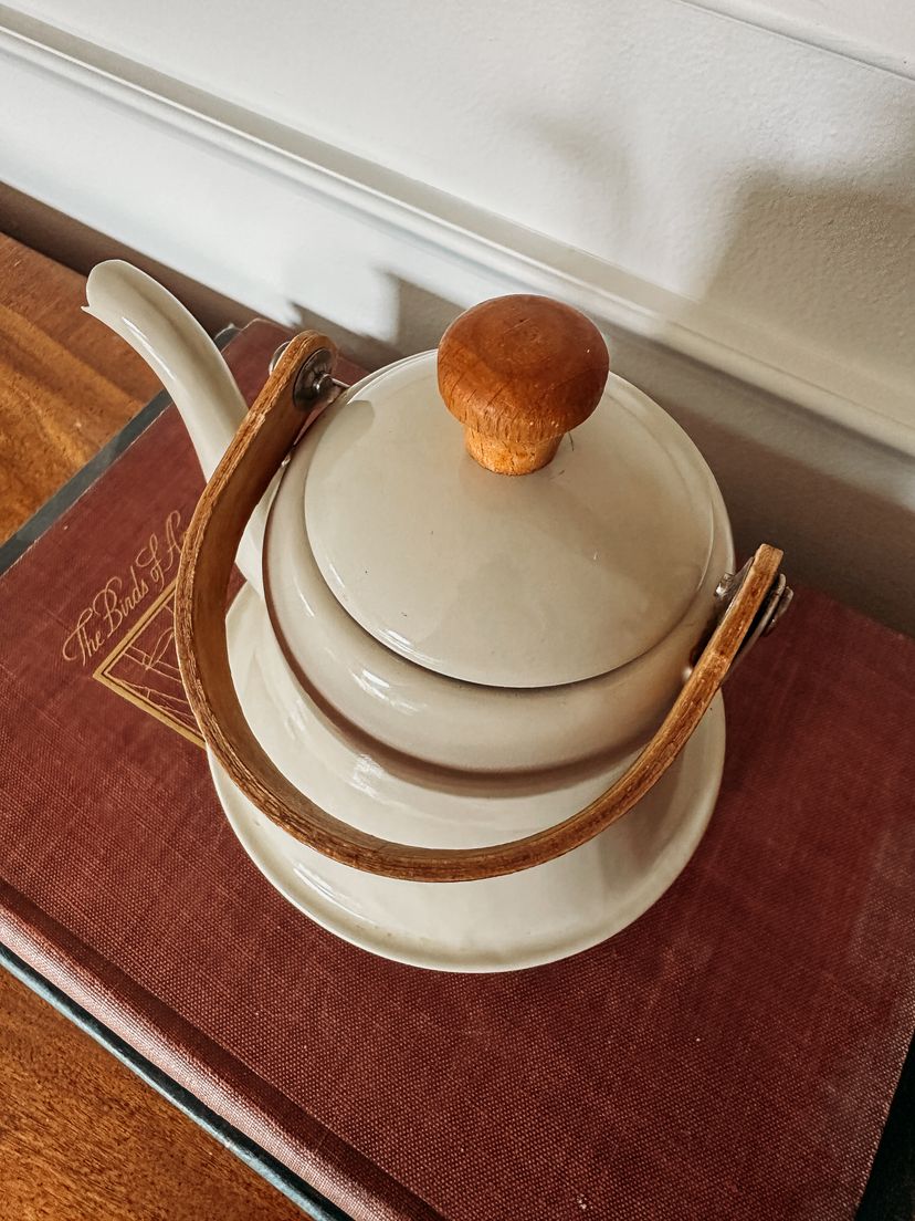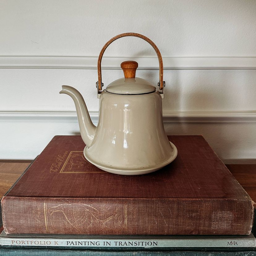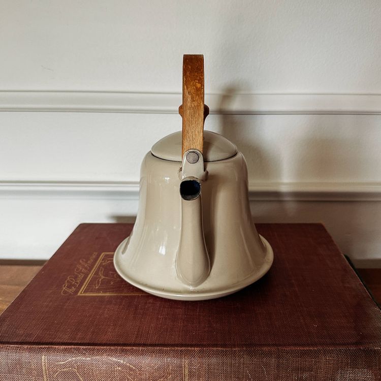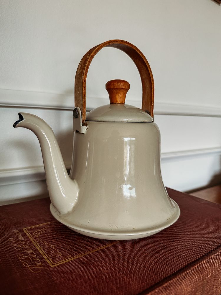 Vintage French enamel bell shaped tea pot. Enamelware is a beautiful cream/ivory color. in AMAZING vintage condition!