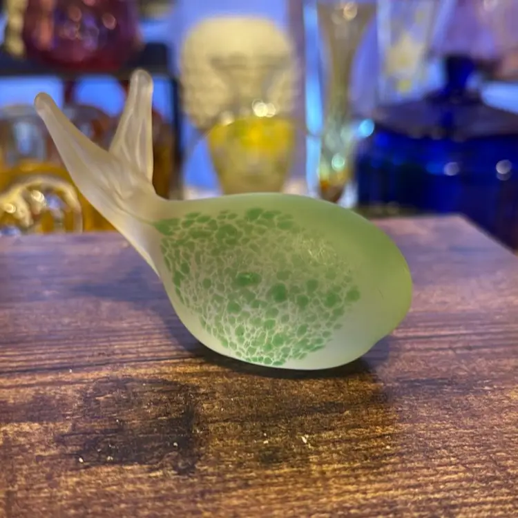 This beautiful piece of art glas was hand blown to look like a playful whale. The frosted glass is speckled with green specks and is from the Mid-20th Century.