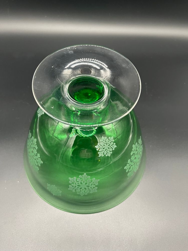 A stunning addition to any collection and holiday table. Bowl is green and footing is clear pressed glass with beautiful snowflake pattern etchings. Perfect for display or as servingware for an elegant holiday tablescape. Shipping included. 5.5" tall, 7" wide. Very good condition, no chips or cracks noted. Minor bubble in clear base, does not appear to be scratch but bubble within the glass, as shown in photo.