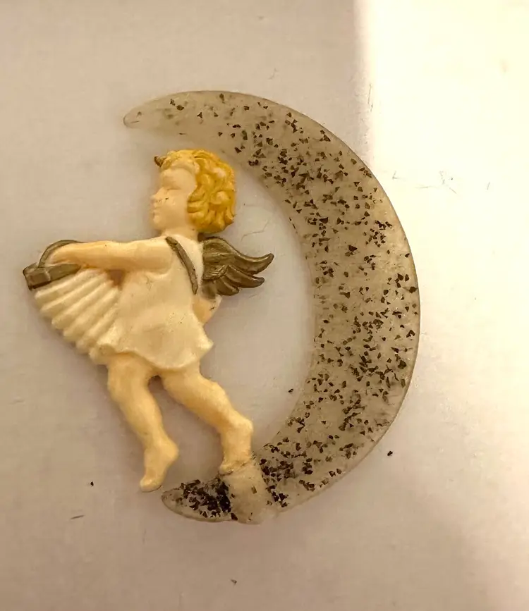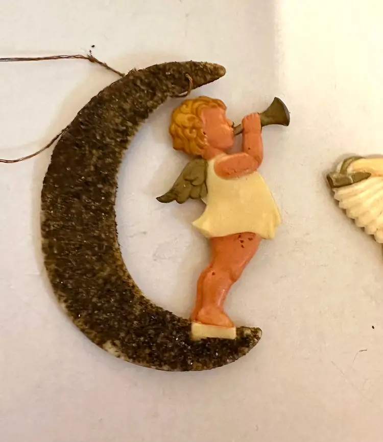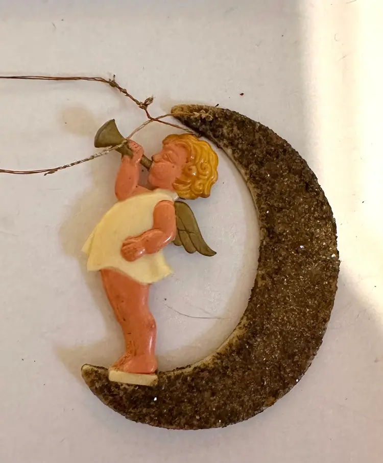 Very sweet 1950’s vintage Christmas ornaments. They are celluloid with mica the angels are playing a horn and accordion. They measure 3.5”. Made in Germany. Very good condition.