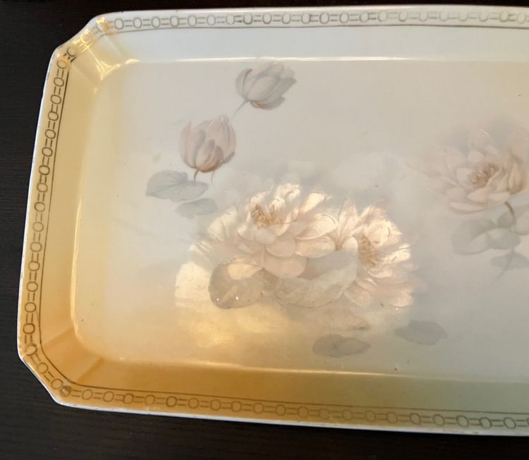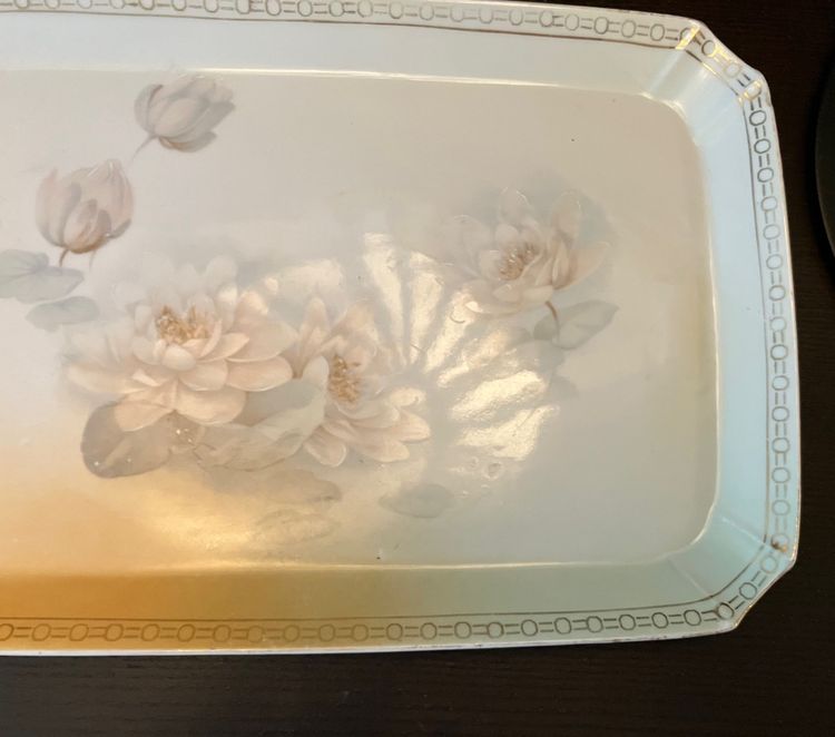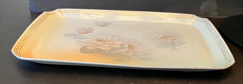 Gold is worn off the rim consistent with age. No chips or cracks. Measurements: 11 1/4" by 7 1/2". Weighs approximately 1 lb before packaging.