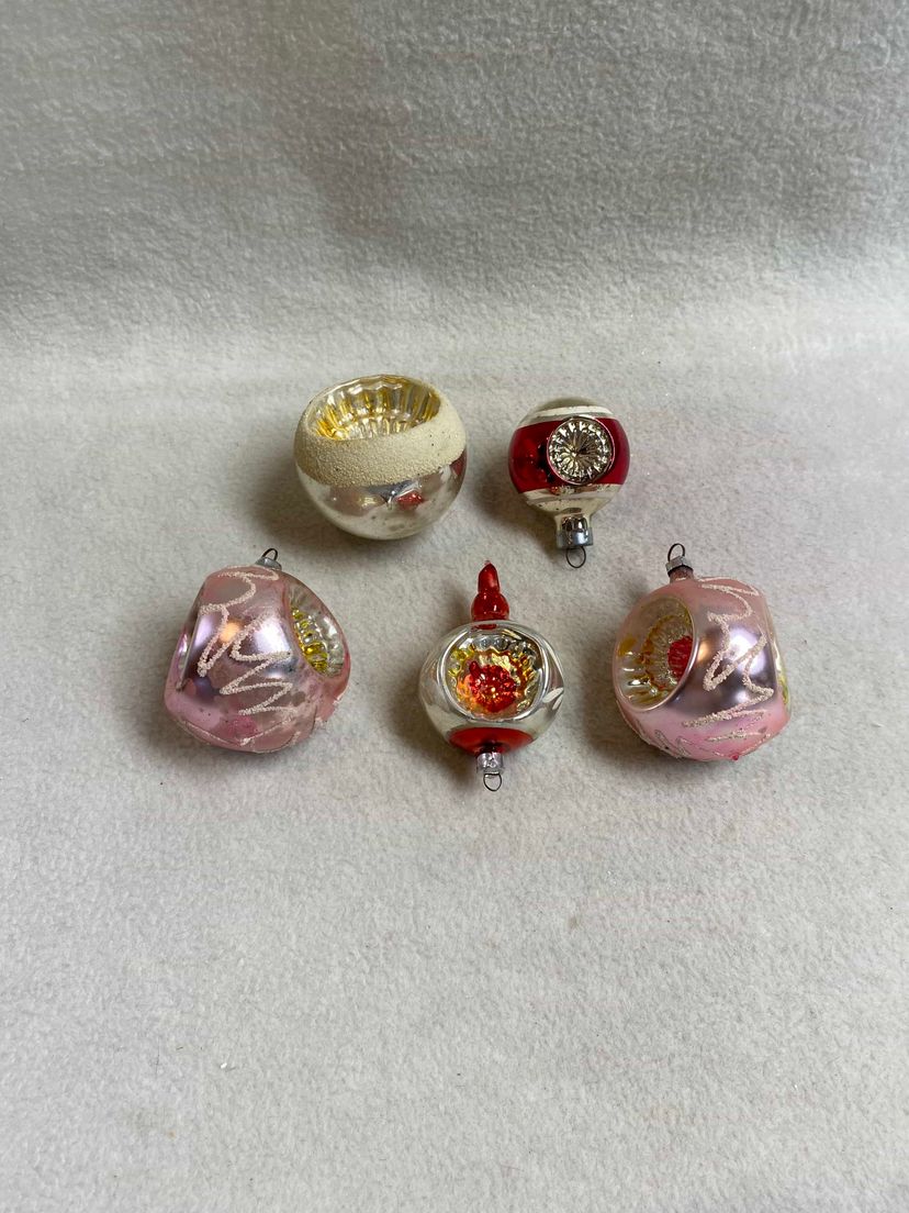 This is a set of 5 vintage indented glass ornaments. All were made in West Germany. The two pink ones are indented on three sides. Overall, they are in good condition for their age.